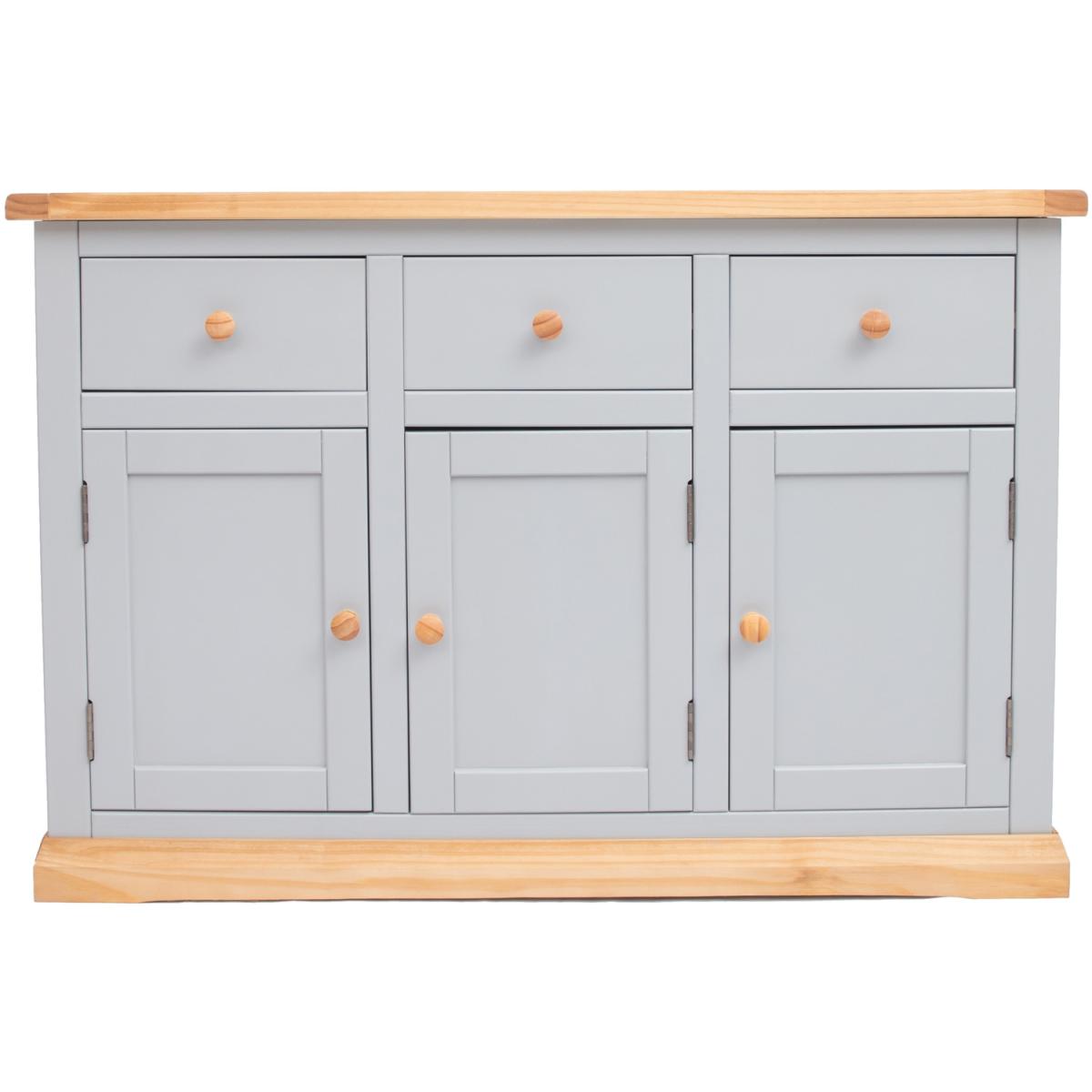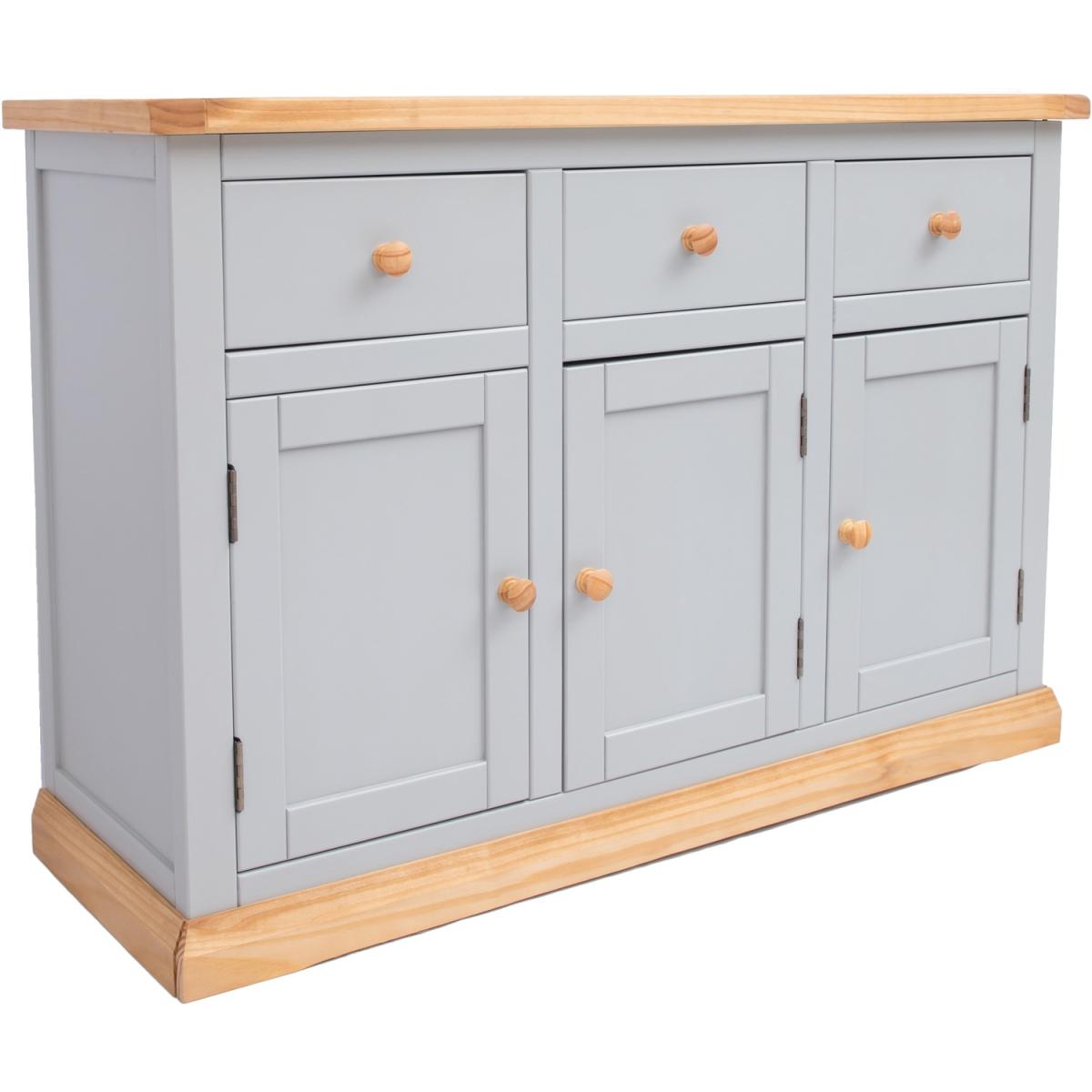 Our Bomporto collection has a simple but pleasing design and is produced by our skilled craftsmen to the highest standards using responsibly sourced wood and veneers. All tops are made using a combination of solid pine wood and veneers and are carefully hand waxed giving them a great look. The body is finished with high-quality eco-friendly water-based paint in a light grey colour. This large 3-door 3-drawer sideboard will look at home in your dining room or lounge. The three doors conceal a large cupboard space for storing crockery, bottles or glassware and there is also a shelf to further organise your contents. Above this, there are three drawers for storing your cutlery, napkins, coasters or even paperwork you need to hand.