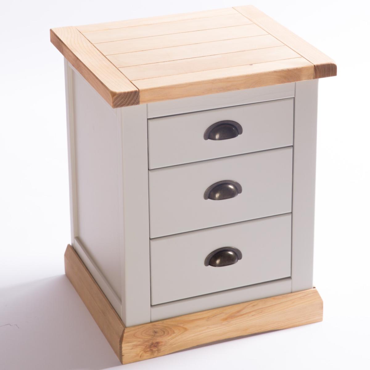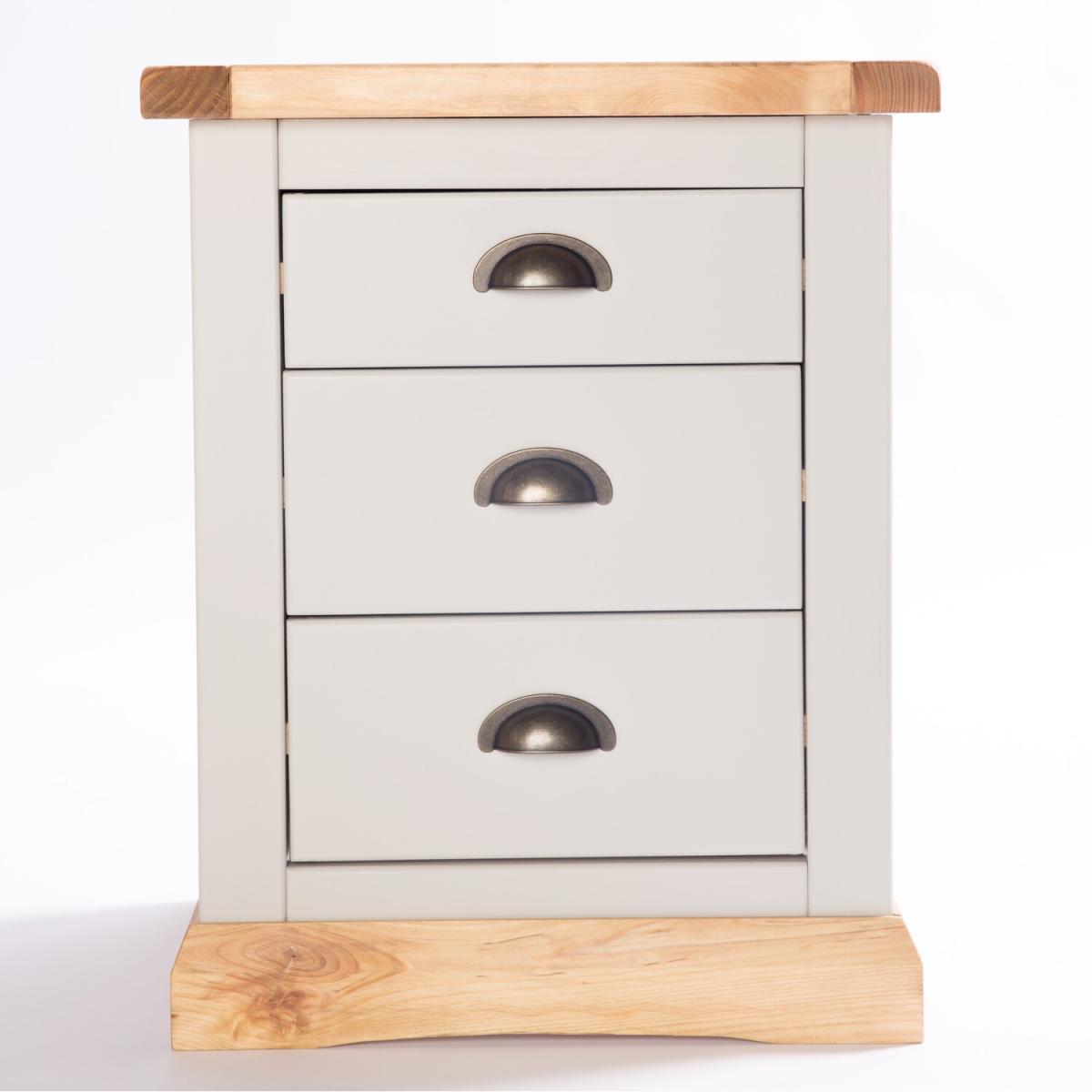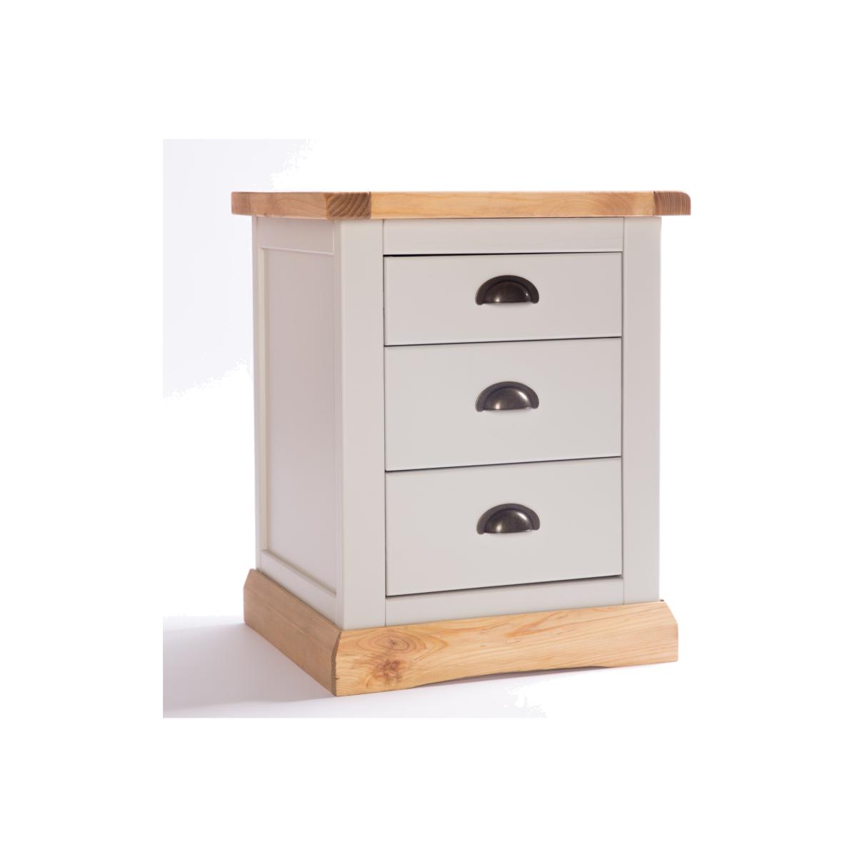 Our Bomporto collection has a simple but pleasing design and is produced by our skilled craftsmen to the highest standards using responsibly sourced wood and veneers. All tops are made using a combination of solid pine wood and veneers and are carefully hand-waxed giving them a great look. The body is finished with high-quality eco-friendly water-based paint in a light grey colour. A combination of drawer sizes means this 3-drawer bedside allows for flexible storage. The top drawer is shallow and perfect to house your reading material, medication or jewellery. The two drawers below are deeper and ideal for storing underwear or accessories. These attributes combined with a simple construction for easy assembly make it a great value product to be taken home today.