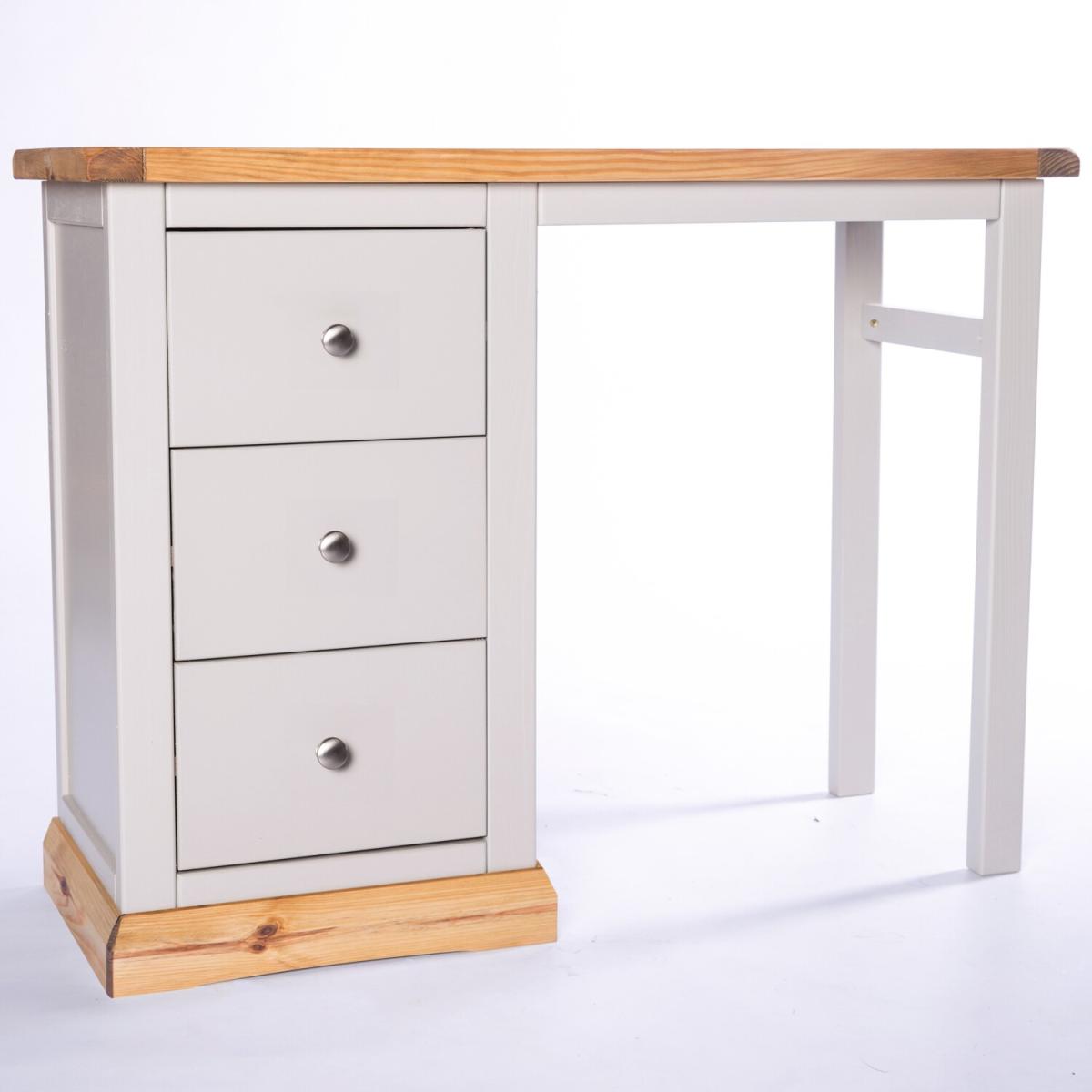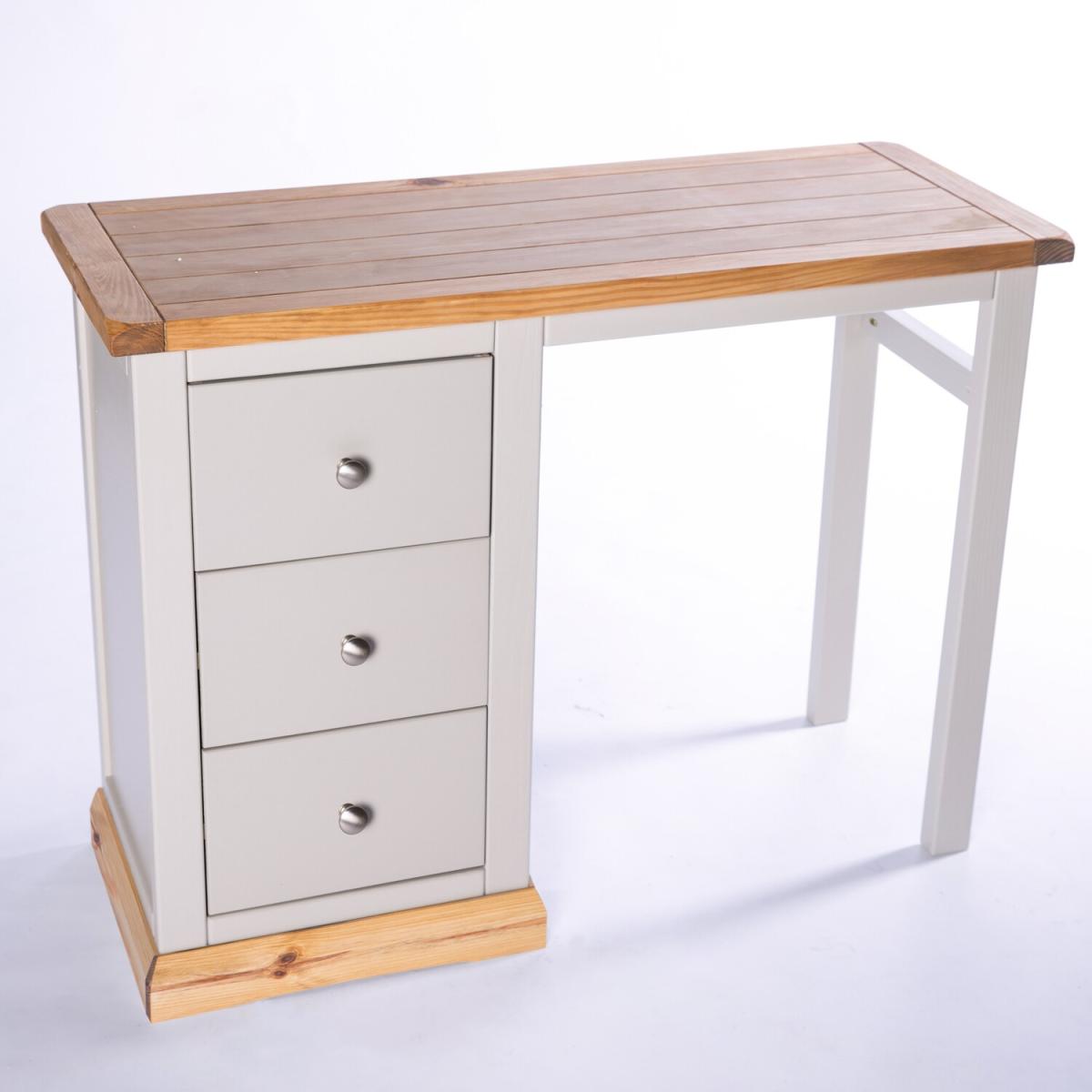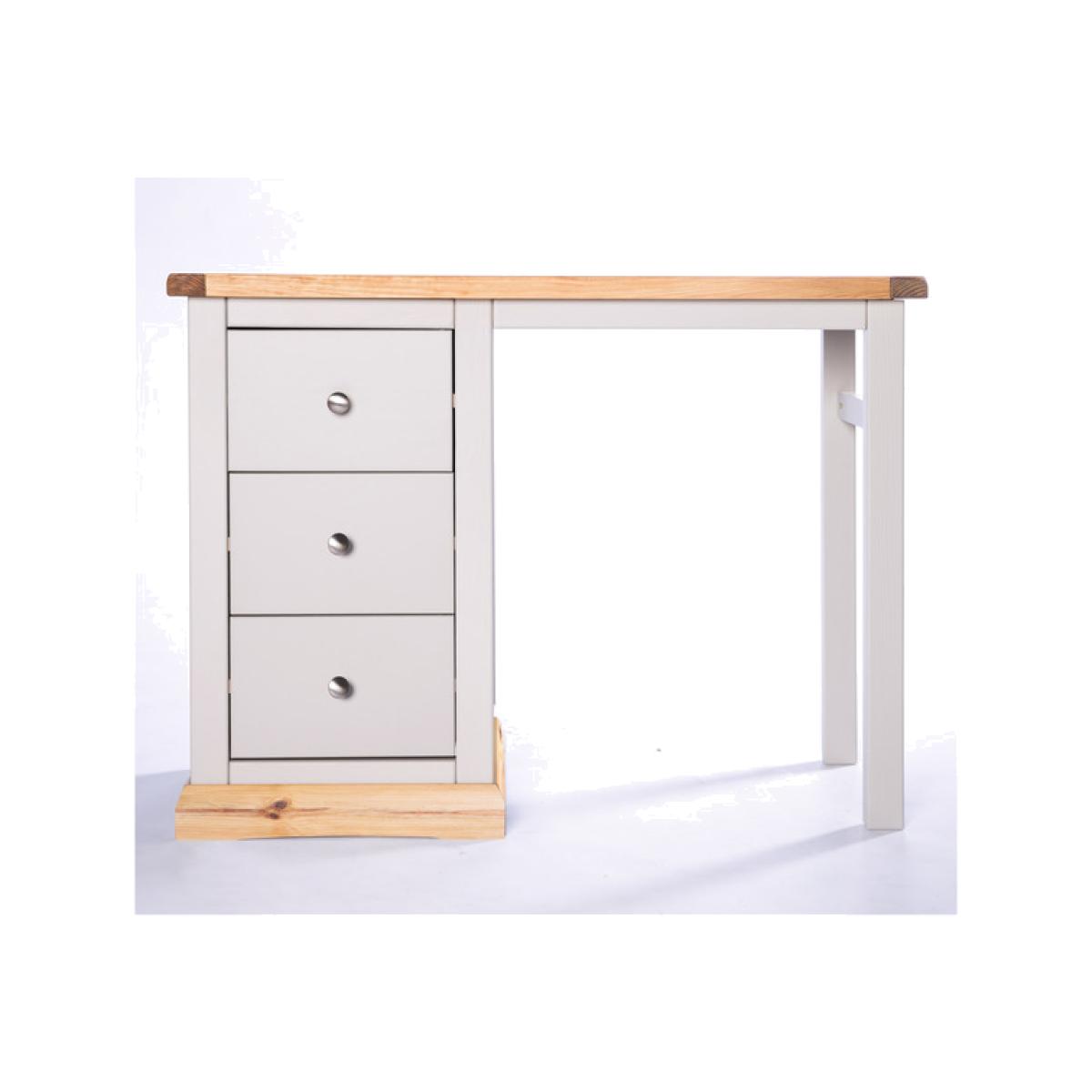 Our Bomporto collection has a simple but pleasing design and is produced by our skilled craftsmen to the highest standards using responsibly sourced wood and veneers. All tops are made using a combination of solid pine wood and veneers and are carefully hand waxed giving them a great look. The body is finished with high-quality eco-friendly water base paint in a light grey colour. A versatile 3-drawer desk dressing table for your home, the perfect multifunctional piece for your bedroom. The 3 drawers offer plenty of space for your belongings whether being used as a desk or dressing table. The pedestal part can be positioned to the left or right-hand side when assembling. Why not add the mirror and stool to complete your set? These attributes combined with a simple construction for easy assembly make it a great value product to be taken home today.