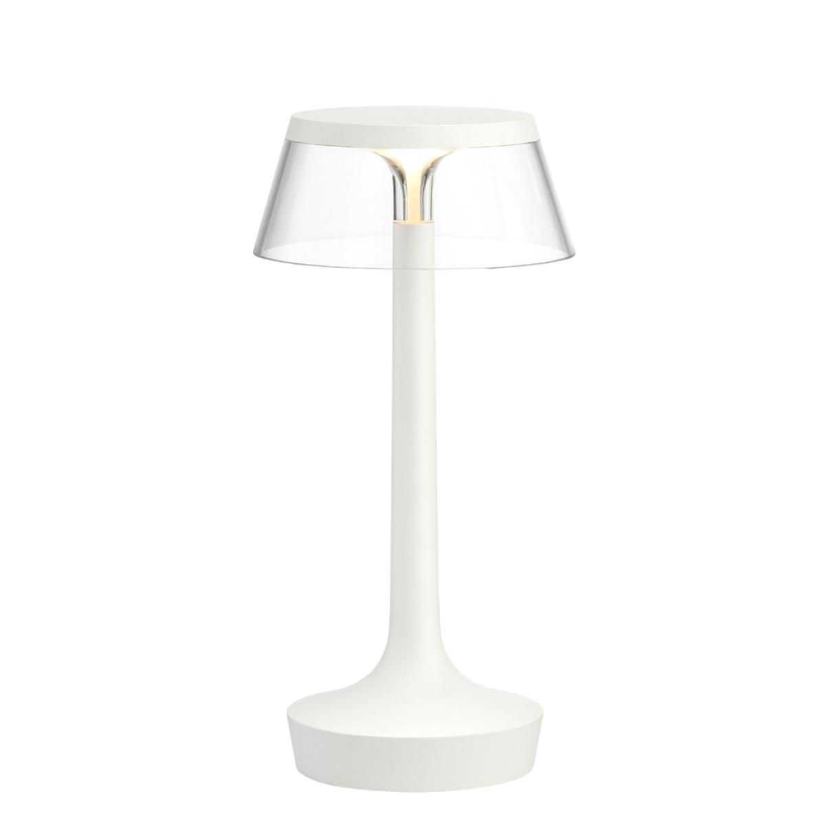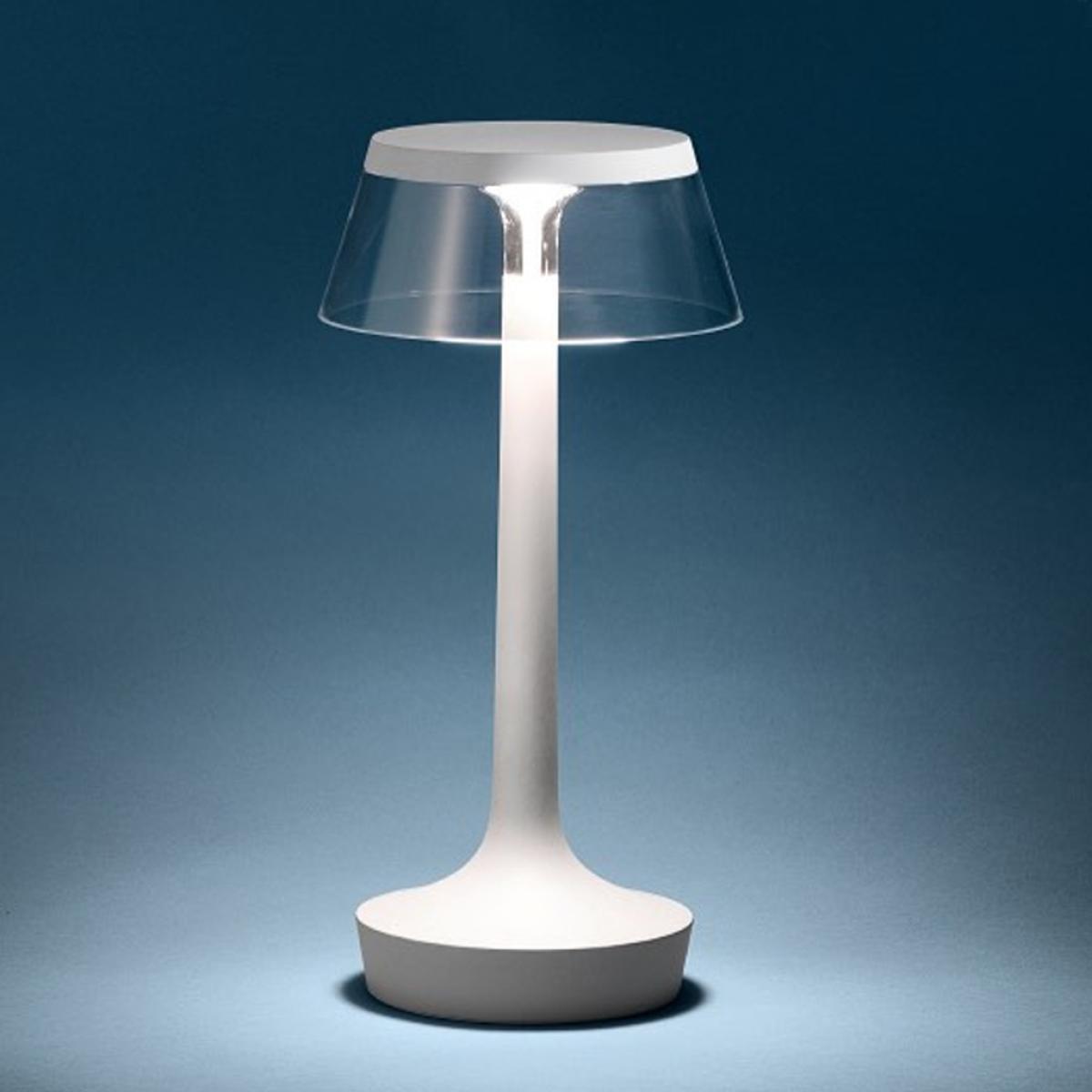 The Bon Jour Unplugged Table Lamp, designed by Philippe Starck in 2015, offers the ultimate synthesis of contemporary design and practical lighting. Crafted with a distinctive transparent shade, the Bon Jour Unplugged Table Lamp offers clear, direct light perfect for a workspace, with a dimmable setting for ambient home lighting. Designed to have wireless functionality, the Bon Jour Unplugged holds six hours of battery life and is rechargeable with a micro-USB cord, which is supplied with the lamp at a handy 120cm length. Its untethered design means you can inject light in to awkward corners or create a truly dynamic lighting display. A modern take on the classic table lamp, the white Bon Jour Unplugged Table Lamp would make a perfect adaptable lighting solution for any room. Integrated 2. 5W LED bulb.