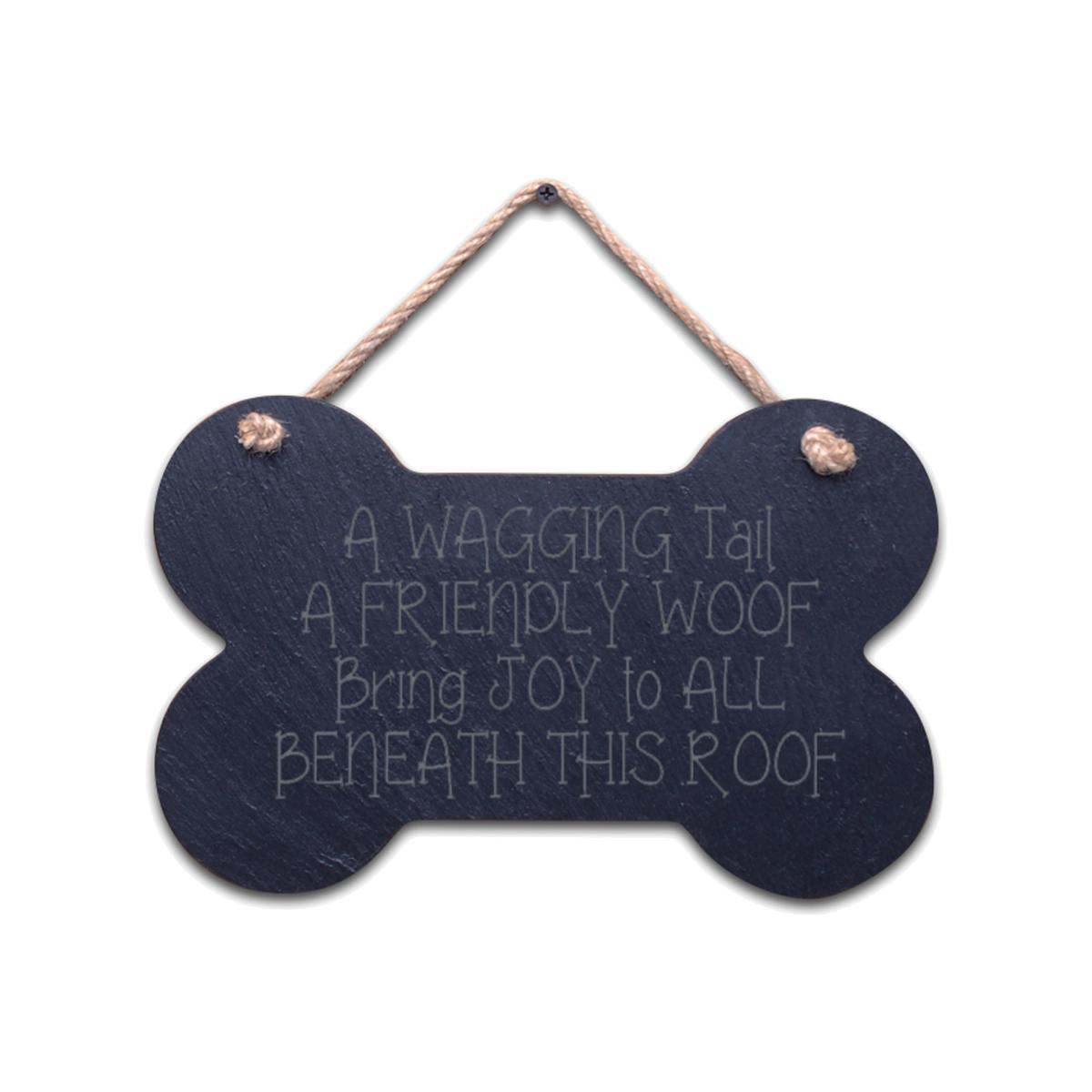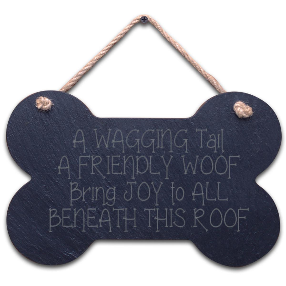 Bone Slate hanging sign - "A wagging tail a friendly woof"