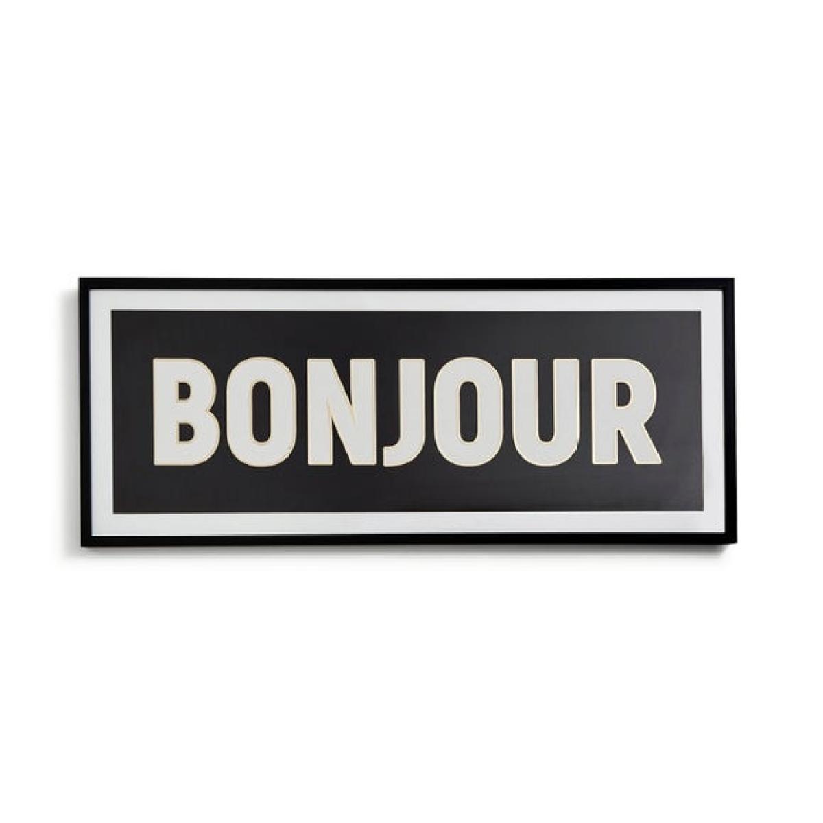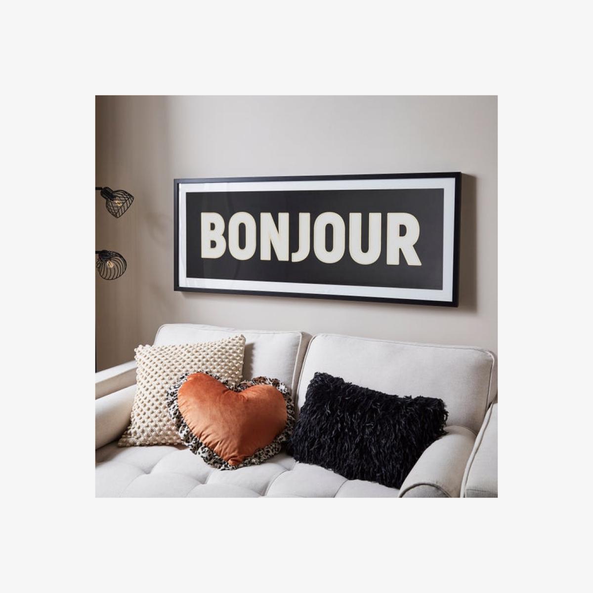 * Large piece * Bold lettering * Monochrome * Framed Make a bold statement with this extra-large wall art, featuring the word 'Bonjour' in striking block letters. The monochrome design keeps things crisp and modern, perfect for contemporary spaces. Measuring 125cm by 50cm, it’s ideal for larger walls that need a confident focal point, and a simple black frame finishes the look with clean lines and minimal fuss. Whether in a hallway, living room or above the bed, it adds impact with a graphic, stylish Parisian touch.