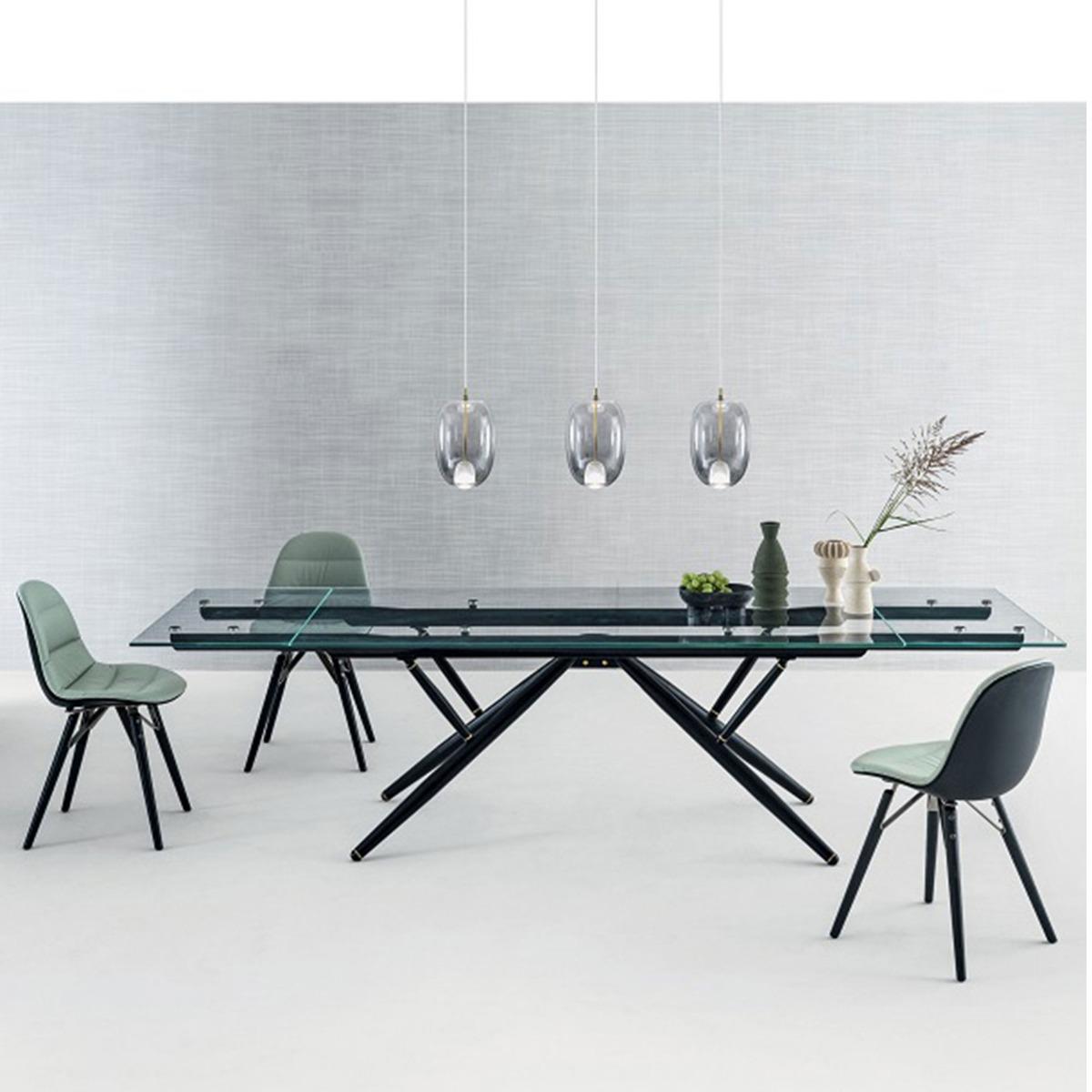 I’m particularly drawn to the Bridge table’s slim black glass top and angular metal frame, which bring a crisp, contemporary edge without feeling heavy. It suits modern urban apartments and minimalist family homes alike, grounding a space while still allowing light to circulate. For styling, keep the table surface clear of clutter and introduce texture through a low, sculptural centrepiece or a set of monochrome ceramic vases. Pair with upholstered chairs in muted tones or slender leather seats to balance warmth against the table’s industrial lines. A linear pendant light directly above will emphasise its geometric silhouette.