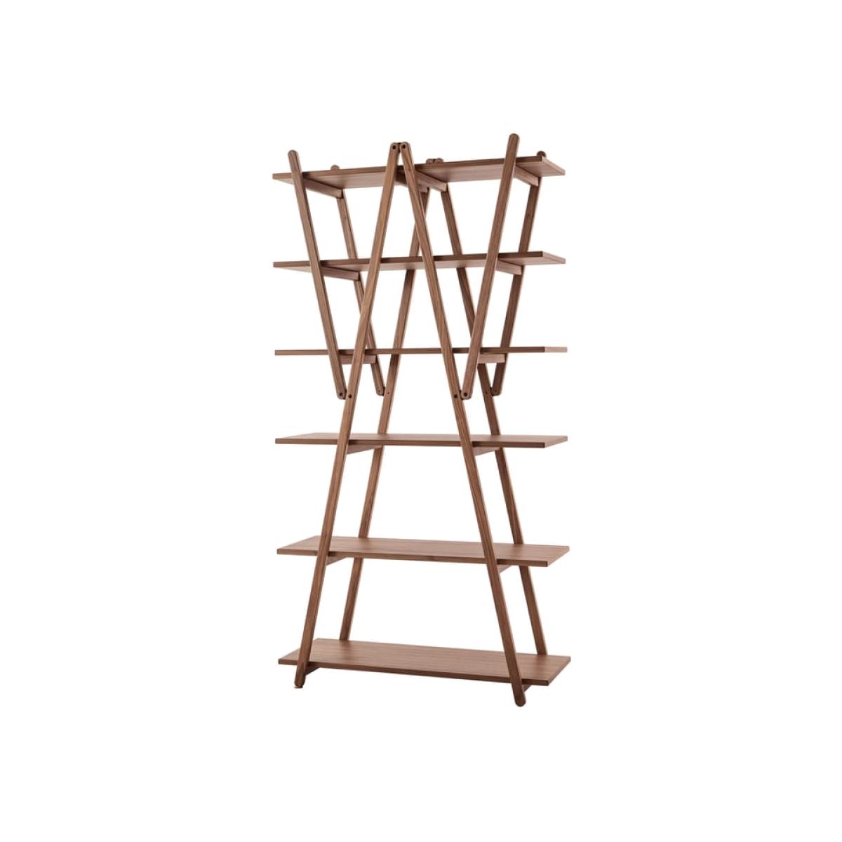 I really like this bookcase because of its distinctive design and warm wood tone, which add a touch of visual interest without overwhelming a space. Its sculptural yet functional form makes it ideal for modern or eclectic interiors, especially in living rooms or home offices where you want a statement piece that also offers practical storage. To style it effectively, consider grouping books, decorative objects, and small plants to create a curated look. Its open, airy structure works well in both minimal settings and more layered, textured schemes, making it versatile for a range of interior styles.