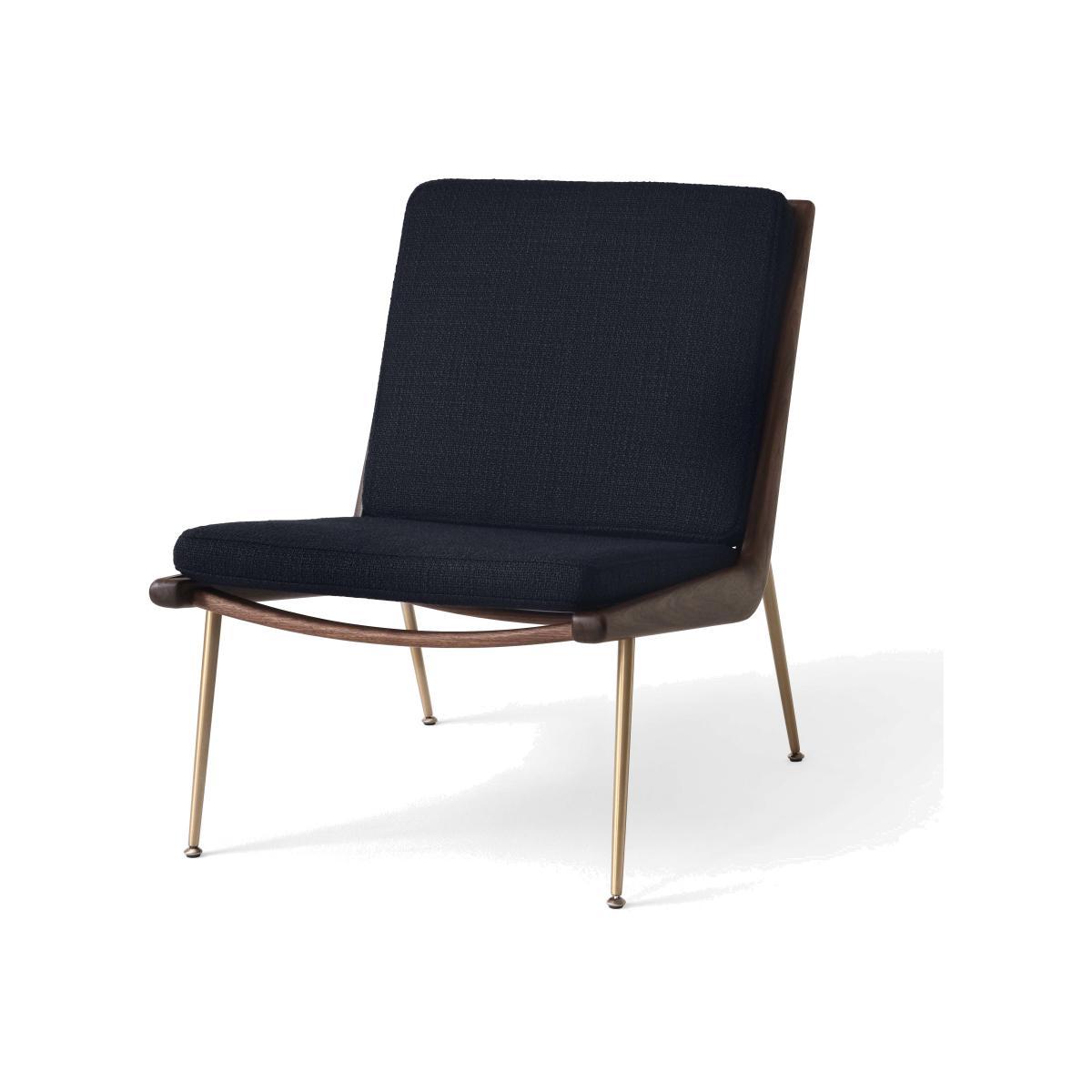 Released in 1956, the Boomerang lounge chair stands out as an essential piece of Danish design. It was designed by Peter Hvidt (1916-1986) and Orla Mølgaard-Nielsen (1907-1993): these pioneers of Danish design from the middle of the 20th century had an avant-gardist approach to industrialised production. Now their work is exhibited in MoMA, at the National Gallery of Melbourne and the Design Museum of Copenhagen. The Boomerang armchair is the result of fifteen years of experience and a bond between the two designers who are passionate about traditional Danish artisanal techniques that they learnt at the Copenhagen School of Arts and Crafts. The Boomerang chair consists of a solid wood base (oak or walnut) embellished with a soft cushion. The very comfortable seat on springs ensures optimal comfort. The conical brass legs perfect the clean outline and strengthen the vintage look of this piece. Boomerang is a timeless and robust armchair. It's a piece of furniture that can be passed down from generation to generation.