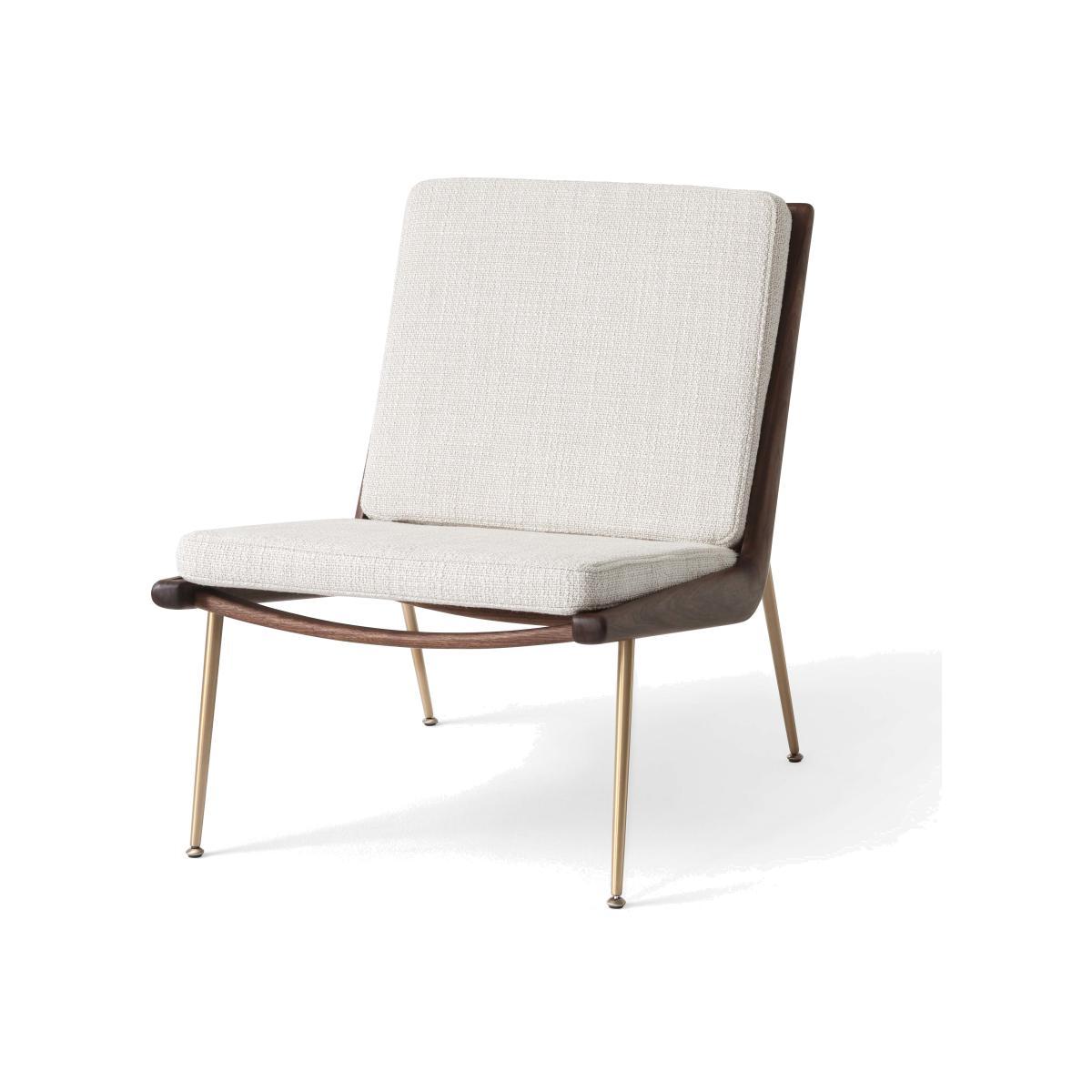 Released in 1956, the Boomerang lounge chair stands out as an essential piece of Danish design. It was designed by Peter Hvidt (1916-1986) and Orla Mølgaard-Nielsen (1907-1993): these pioneers of Danish design from the middle of the 20th century had an avant-gardist approach to industrialised production. Now their work is exhibited in MoMA, at the National Gallery of Melbourne and the Design Museum of Copenhagen. The Boomerang armchair is the result of fifteen years of experience and a bond between the two designers who are passionate about traditional Danish artisanal techniques that they learnt at the Copenhagen School of Arts and Crafts. The Boomerang chair consists of a solid wood base (oak or walnut) embellished with a soft cushion. The very comfortable seat on springs ensures optimal comfort. The conical brass legs perfect the clean outline and strengthen the vintage look of this piece. Boomerang is a timeless and robust armchair. It's a piece of furniture that can be passed down from generation to generation.