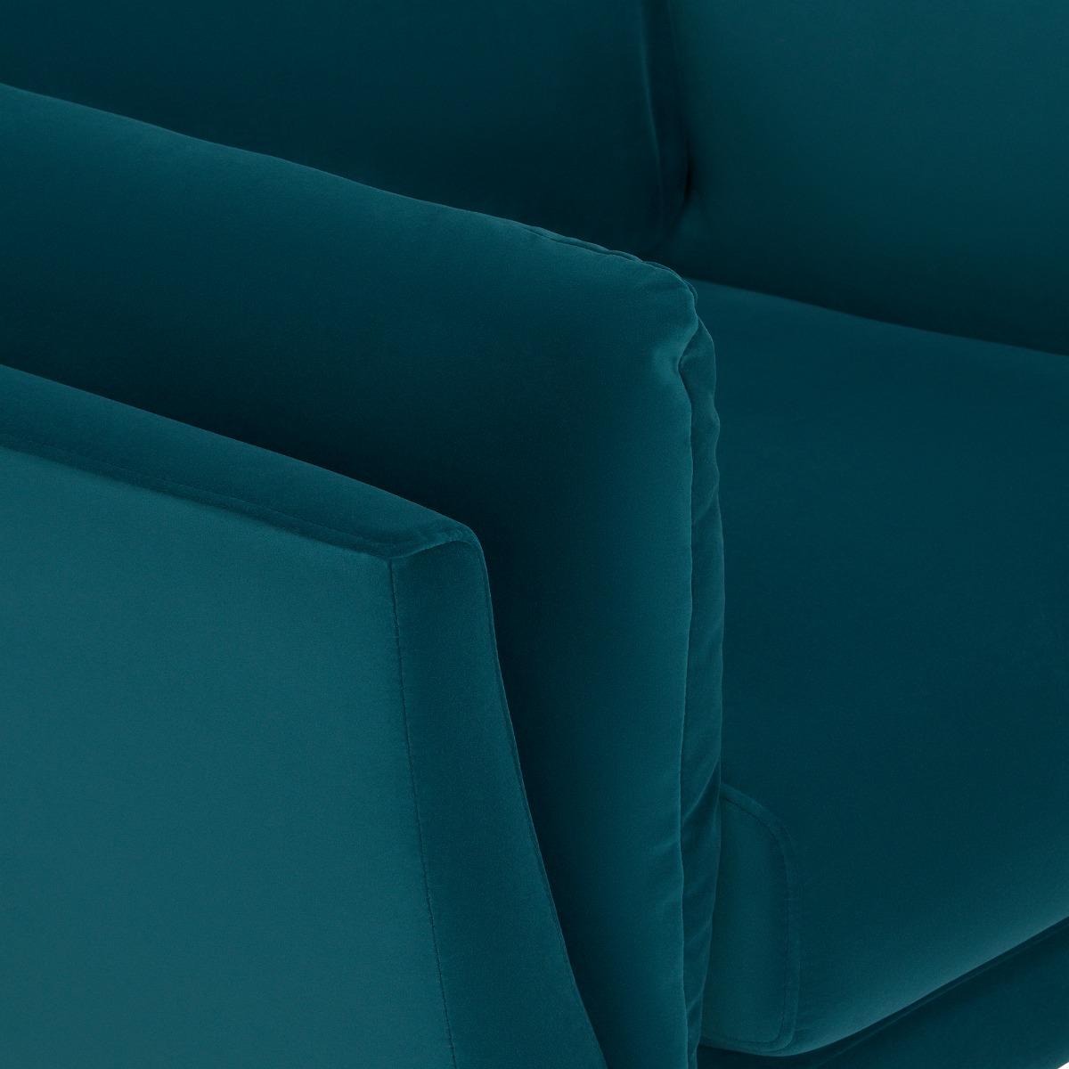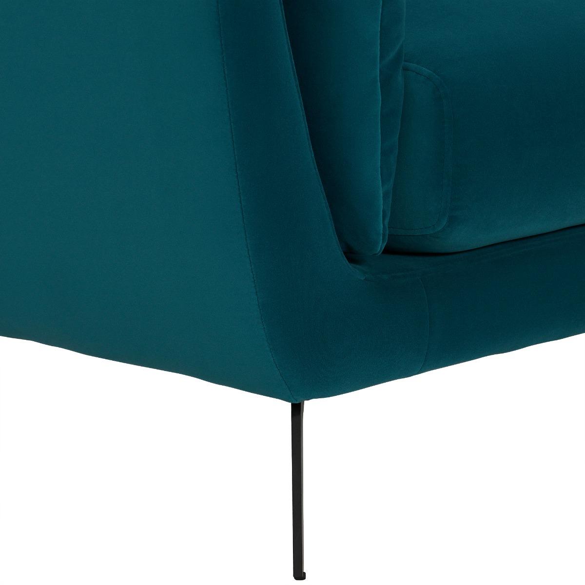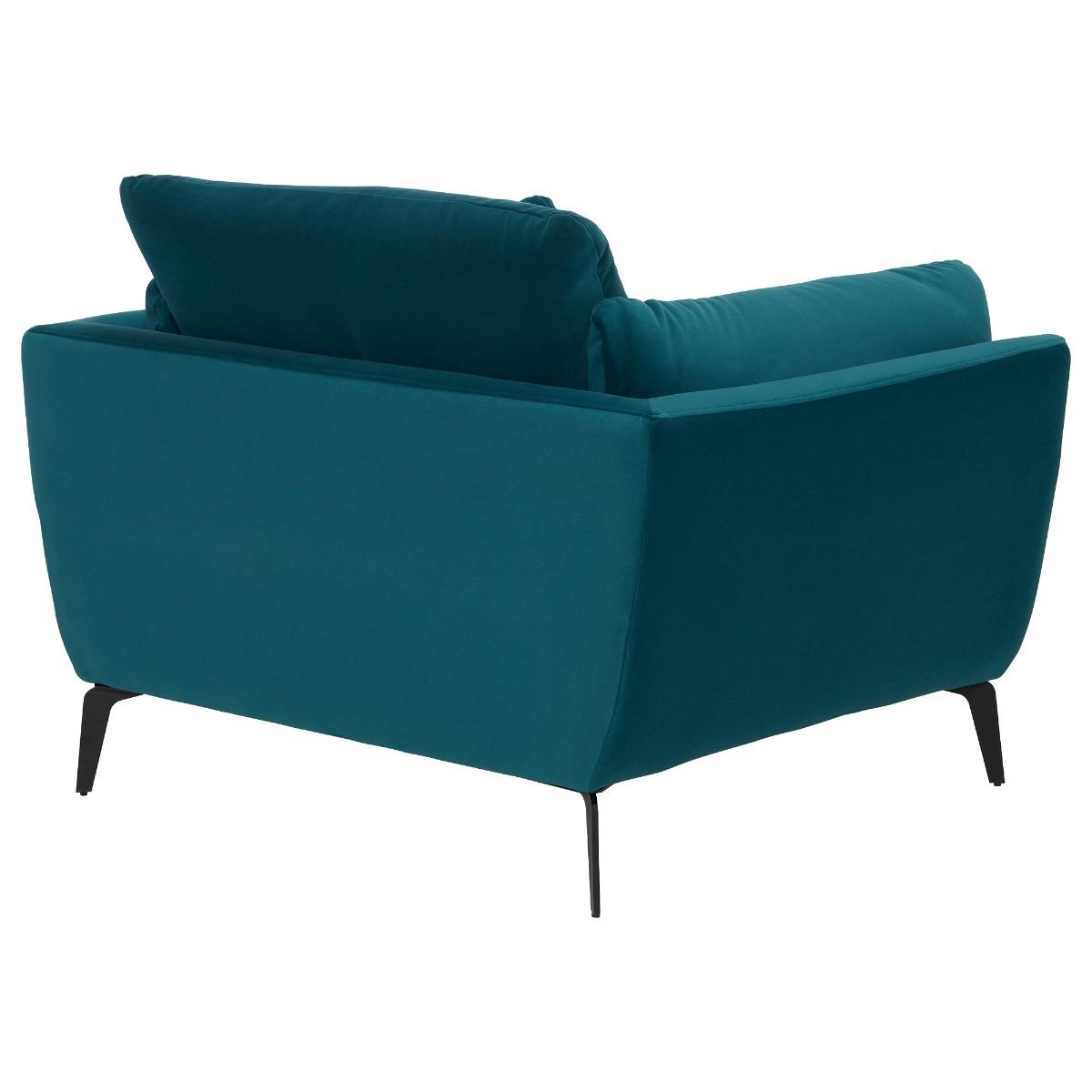 I love this armchair’s bold teal hue, which makes it a standout piece perfect for adding colour to both contemporary and eclectic interiors. Its compact size and inviting shape work well in living rooms or cosy reading nooks, offering a stylish yet practical seating option. When styling, consider pairing it with neutral or contrasting cushions for added texture, or placing it alongside wooden or metal accents for a modern touch. To really make it pop, position it in a space with plenty of natural light, allowing the rich colour to shine without overwhelming the room. This piece is versatile enough to work in various interiors, from minimalist schemes to more layered, eclectic spaces.