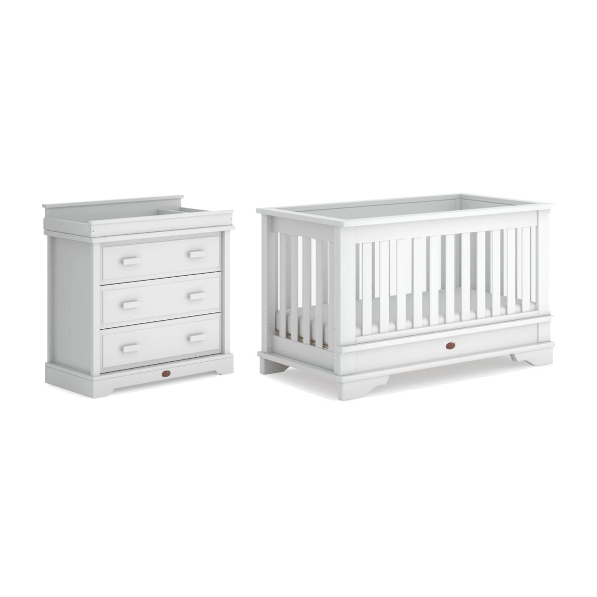 Get a timeless style for your child's room with Eton cot bed and dresser set from Boori. The Boori furniture range combines classic and contemporary details to provide the perfect surroundings for your child. Cotbed: The cotbed has two base heights for ease of access and to keep baby safe. It converts easily into a toddler bed by removing the side rail. It also converts to a full-size double bed, ideal for when your little one has outgrown the junior bed. Toddler Guard Rail included Delivered packed flat for home assembly The conversion kit (sold separately) lets you transform your Boori cotbed into a double bed with cosy sofa. Its extension poles and a complete set of slats will give you good support for a double mattress (supplied separately). Assembly required. Dresser:This dresser of 3 deep, fully extendable storage drawers comes with metal drawer runners. The chest features dovetail joints and a changing station. The dresser comes fully assembled and the change tray is packed flat for home assembly. After the baby is grown, it can be converted to a bookcase with the bookcase hutch extension that's sold separately.
