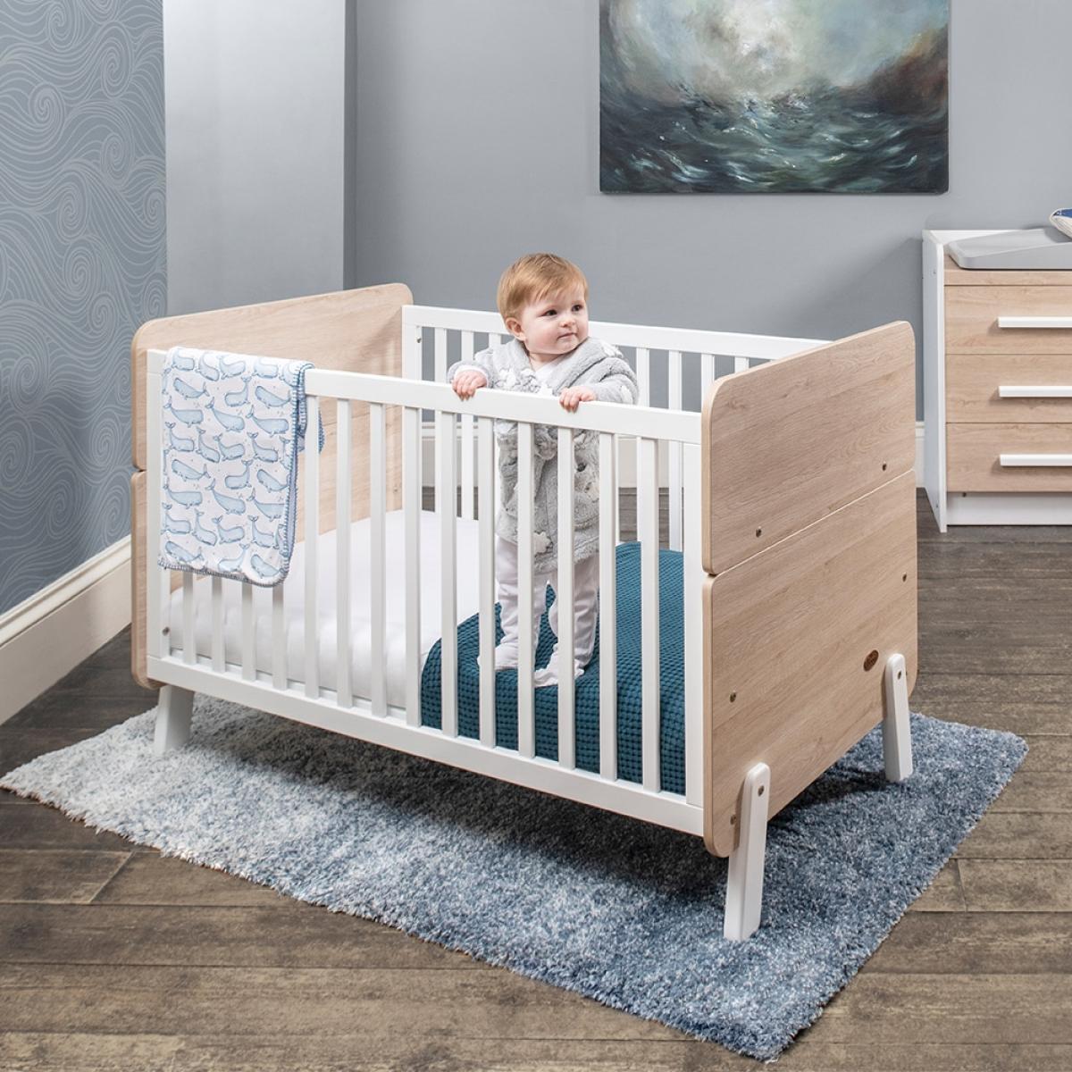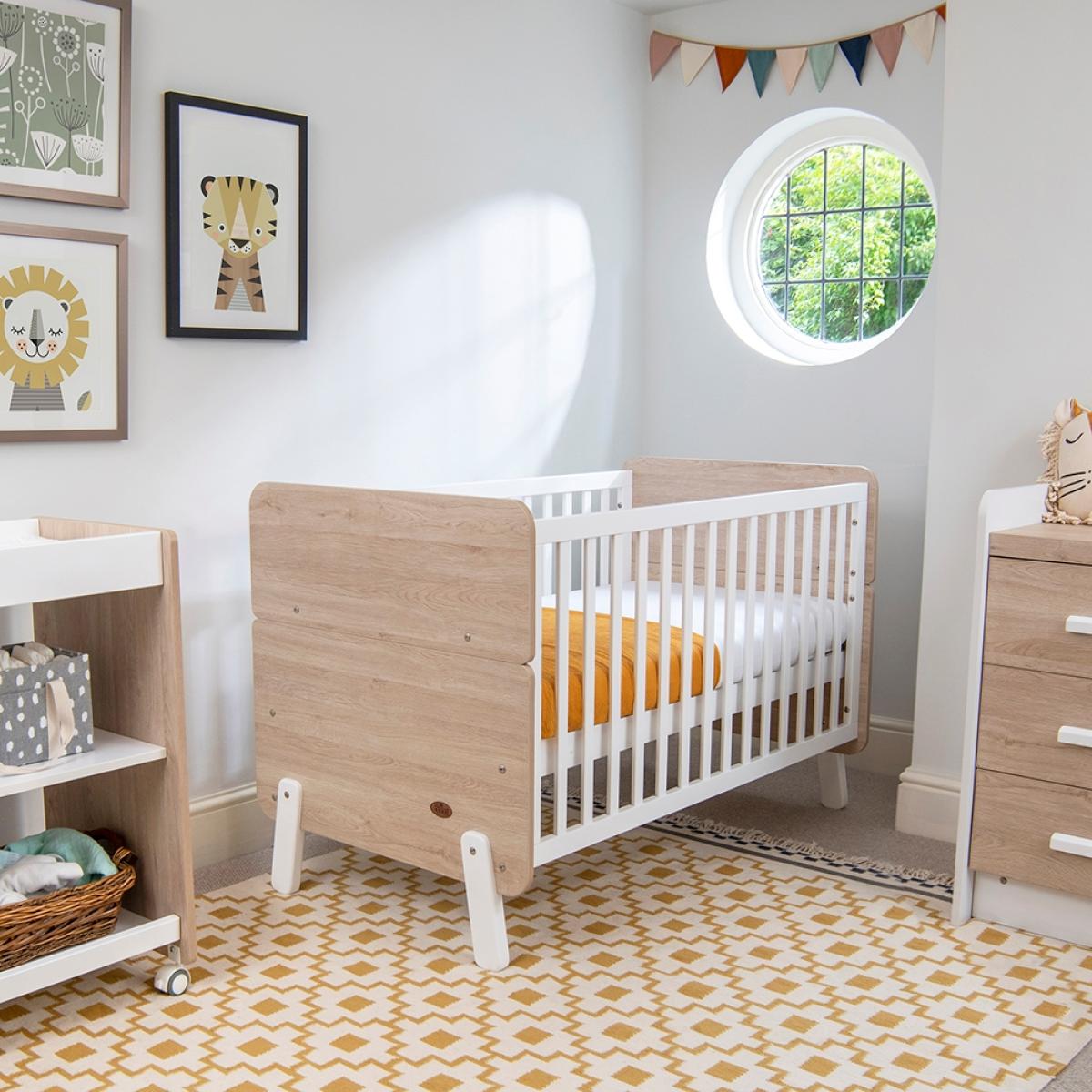 I love this cot because its clean, modern lines combined with the soft, natural tones make it versatile for a range of nursery styles. The white and oak finish allows it to seamlessly blend into both Scandi-inspired schemes and more neutral, minimalist interiors. To style it effectively, consider pairing it with cosy textures like a subtle beige or grey rug and simple, understated accessories to keep the space calm and uncluttered. Practical tips include using the open space beneath for storage of baby essentials in baskets, and adding colourful or patterned bedding to introduce a touch of personality without overpowering the overall serene look. It’s a timeless piece that offers both function and subtle design appeal.