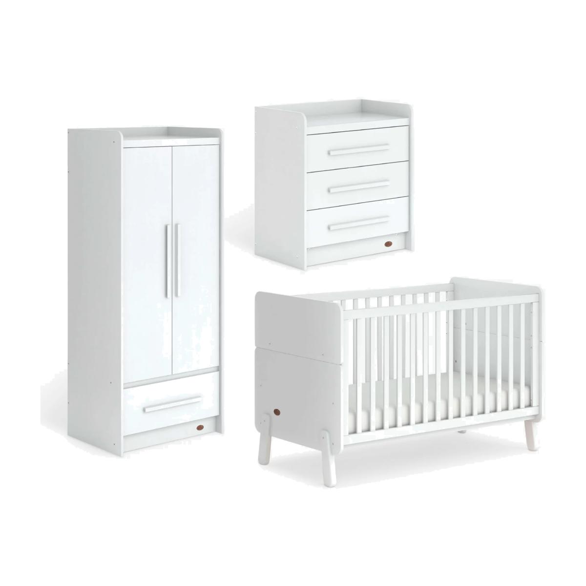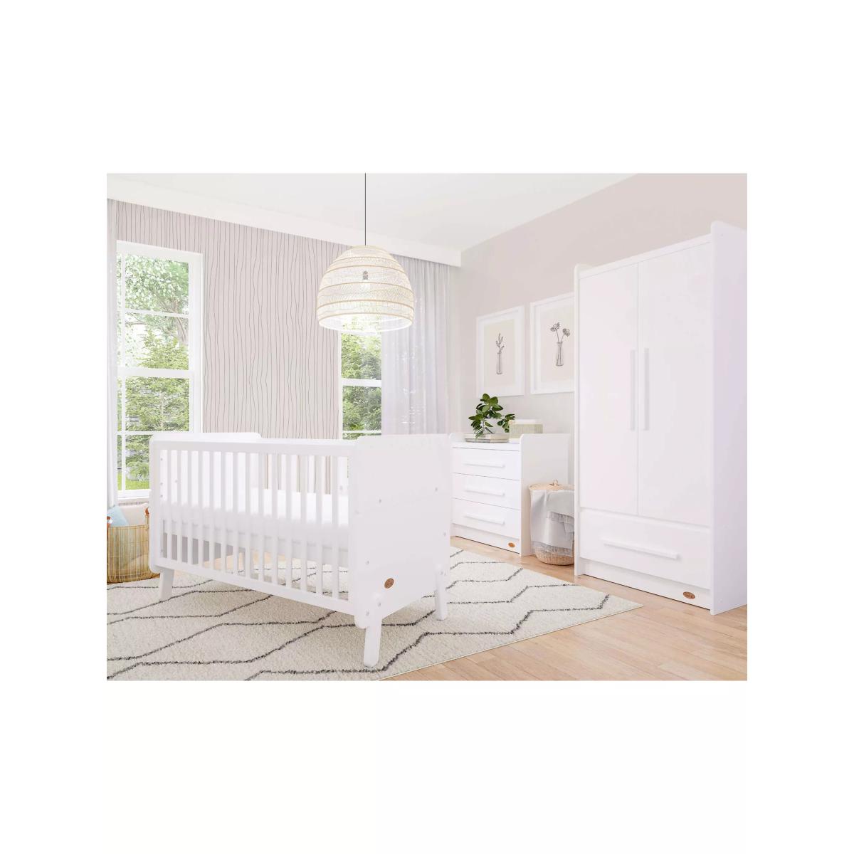 The Boori Natty and Neat collections were created to work in harmony, combining soft colourways and unique angles to bring a fresh, modern look to bedrooms or nurseries. This Natty 3 Piece Furniture Set features the Natty Cot Bed, Neat 3 Drawer Chest and Neat Wardrobe which are all designed for the nursery and beyond. The Natty Cot Bed has the ability to transform into a guarded toddler bed with no additional purchase required and the Neat chest of drawers and wardrobe feature plenty of storage space for clothing. Cotbed: This modern, Scandi cot bed has round corners, angled feet and muted colour palette. The unique paint finishes are nursery-friendly and enhance the natural beauty of the wood's grain. Key Features: Converts from cot to toddler bed suitable from birth to around 5 years with two guarded sides using parts from the cot end panels. No separate purchase of conversion kit required. 2 base heights - the higher base height for easy access to newborns, lower base height for when baby is able to pull themselves up. Crafted from a combination of engineered timber and sustainable solid Australian Araucaria Requires a L132 x W70cm mattress (included) Dresser: The Neat sturdy chest of drawers has a simple, modern design aesthetic. Three soft closing drawers offer plenty of storage and it is made of engineered timber finished in water-based paint. Wardrobe: The Neat 2 Door Wardrobe is made of engineered timber with a unique oak-effect laminate. It features a modern, contemporary design with clean lines. It can be used with two hanging rail compartments, ideal for children's clothes, or with one hanging rail compartment and a storage shelf above for older children's and adults' clothes. It also benefits from one spacious storage drawer. Plus a guarded top means lightweight items can be stored on top of the wardrobe for even more versatility.