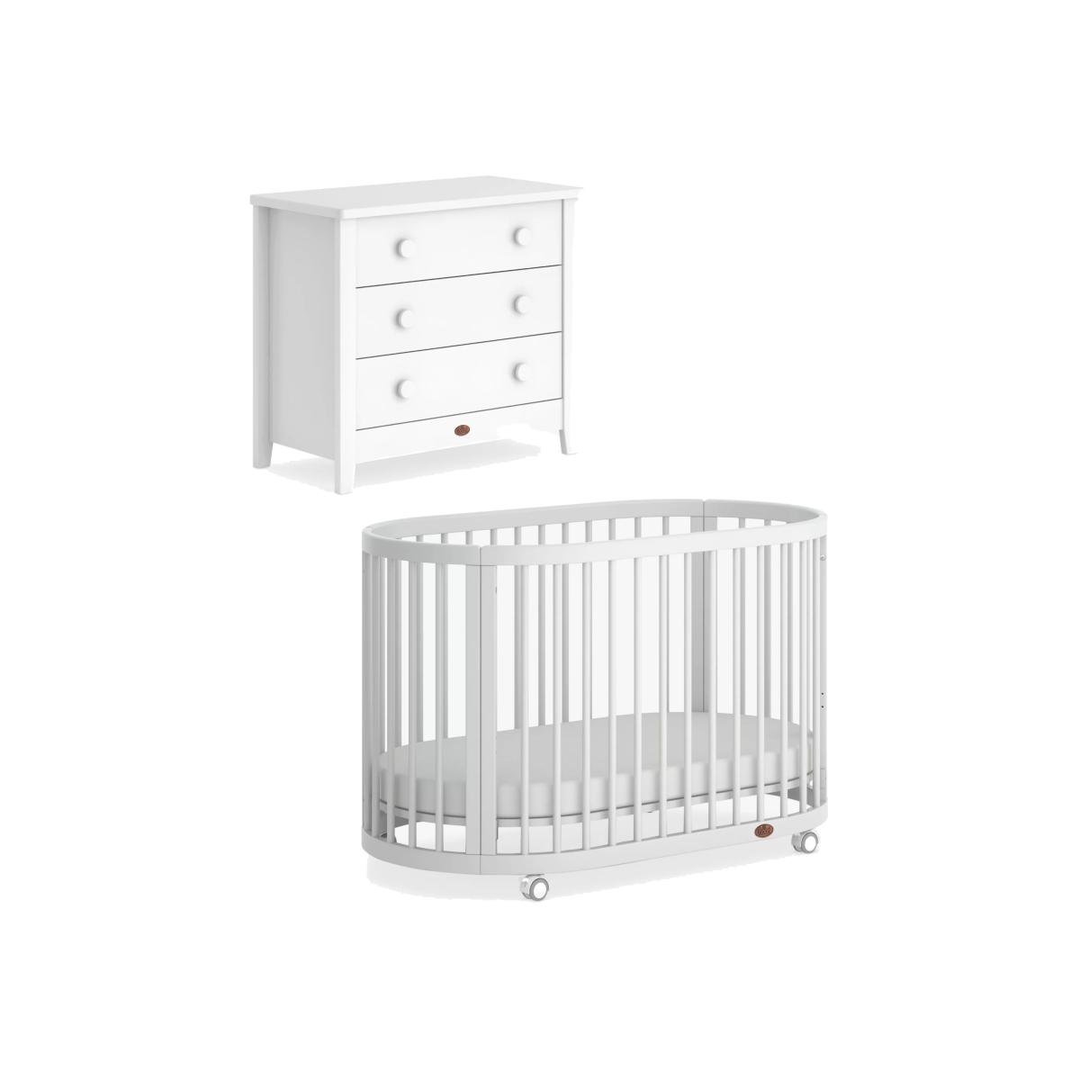 A great start to any nursery, this bundle comes with the Boori Oasis Oval Cot and a 3 Drawer Chest. Oasis Oval Cot: Functionality goes hand in hand with style with this Oasis Oval Cot. It offers a fun and distinctive shape that stands out as a centrepiece in any modern nursery. As your baby grows, the Oasis adapts, transforming to fit the changing needs of your child. It glides through standard doorframes on its wheels so that you can use it as a bedside crib during newborn nights. The wheels are easily removed when baby moves into the nursery and it converts to a toddler bed once they're old enough, providing a comfortable and safe sleeping environment for your growing child. When it's time for a big bed, this oval cot bed can remain in your home as a small sofa. Boori have been at the forefront of nursery furniture design for 30 years, so they understand the essence of creating pieces that are not only beautiful but also safe and practical. The smooth spindles around this oval cot increase airflow for a comfortable night's sleep and the adjustable base height ensures you have easy access to baby. This oval baby bed is designed to fit seamlessly with the Boori oval mattress included. It measures 119cm x 64cm. 3 Drawer Chest: This 3 Drawer Chest offers an elegant storage solution that is perfect for both nurseries and bedrooms. It features rounded wooden handles and a chest top which nods to the brands' love of natural materials. It comes with 3 fully extendable drawers, offering plenty of room for clothing or bedding. Crafted from sustainably sourced European beech, a beautiful wood admired for its strength and durability, and finished in our chip-resistant low voc bio-paint to help keep your home free from nasty chemicals, we know this oval crib will be loved by your family for years.