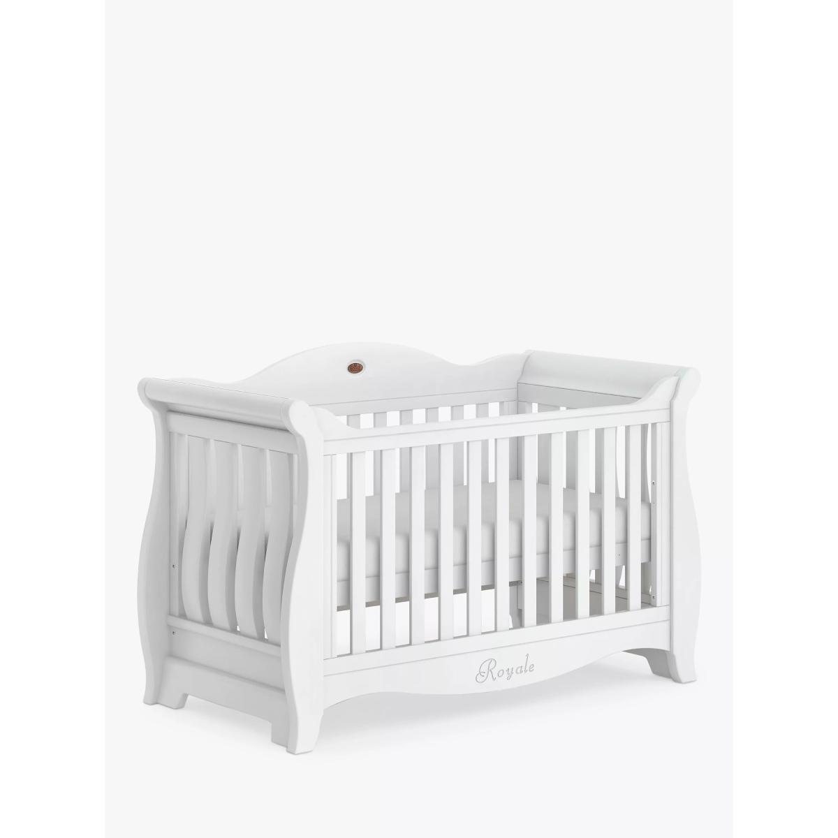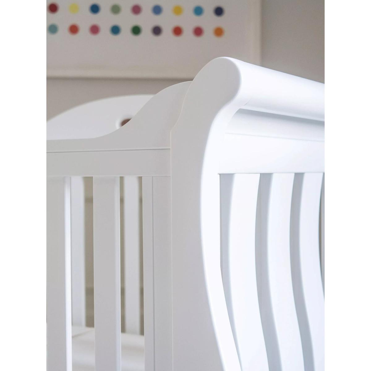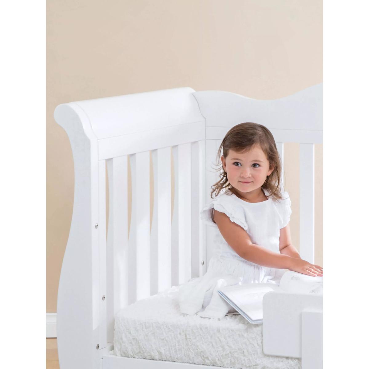 The Sleigh Royale Cotbed is the perfect centrepiece for a sophisticated and luxurious nursery. Meticulously designed, it intertwines timeless elegance with the superior craftsmanship that Boori is renowned for. It features a height-adjustable base which means it can evolve with your child's needs. Begin with the higher base level for easy access to your newborn, and as they grow and become more independent, adjust to the lower setting. As your child transitions from the crib, this sleigh cot effortlessly transforms into a cosy toddler bed and subsequently a toddler sofa, ensuring its place in your home for years to come. A Toddler Guard Panel can be added for extra peace of mind. The sleigh cot frame is crafted from sustainably sourced Australian Araucaria and New Zealand Radiata timber, both strong and durable woods that have been favoured by woodworkers for over a century for their strength and consistency of grain texture. The carpenters finish these cot beds with the brand's unique plant-based paint to keep nasty chemicals to a minimum in your home. The Sleigh Royale Cot Bed adheres to both Australian/New Zealand and European safety standards. Down to the beautifully carved 'Royale' calligraphy, every detail of this sleigh cot bed has been considered. The cot bed comes with a 3 year warranty. The Deluxe Purotex®️ Pocket Spring Cot Bed Mattress: The Deluxe Purotex®️ Pocket Spring Cot Bed Mattress is designed to provide baby with a comfortable and supportive night's sleep. It's handmade and features British ECO Ultra Firm Fibre, 230 micro Posturfil pocket springs and hypo-allergenic properties for complete peace of mind whilst your little one sleeps. With its innovative Dual. Tech technology, the mattress has deep Ultra Firm Fibre and an Ecobond insulator pad on one side for newborns as well as a side offering individual pocket springs for toddlers. This helps promote the perfect posture for your child as they grow. With an open cell structure, the firm fibre works with the pocket springs by moulding to the contours of the body. This provides support and allows for increased airflow. This cot bed mattress comes with a removable Purotex®️ Moisture Management cover. Fabrics that have been treated with Purotex®️ contain microcapsules that are filled with natural probiotics. These provide a natural remedy against common allergens. Thanks to friction, when your baby lays on the mattress, the microcapsules burst open and absorb humidity to reduce moisture. These probiotics start to multiply and clean up the allergens. Additionally, this mattress for cot beds also comes with a Barrier+ cover which is specially designed to remove dead skin cells and bodily fluids. Boori have a rigorous approach to the design and development of their mattresses. They are pounded 30,000 times to ensure they can last and last. They do wash, fire and toxicity tests as part of their strict quality control.
