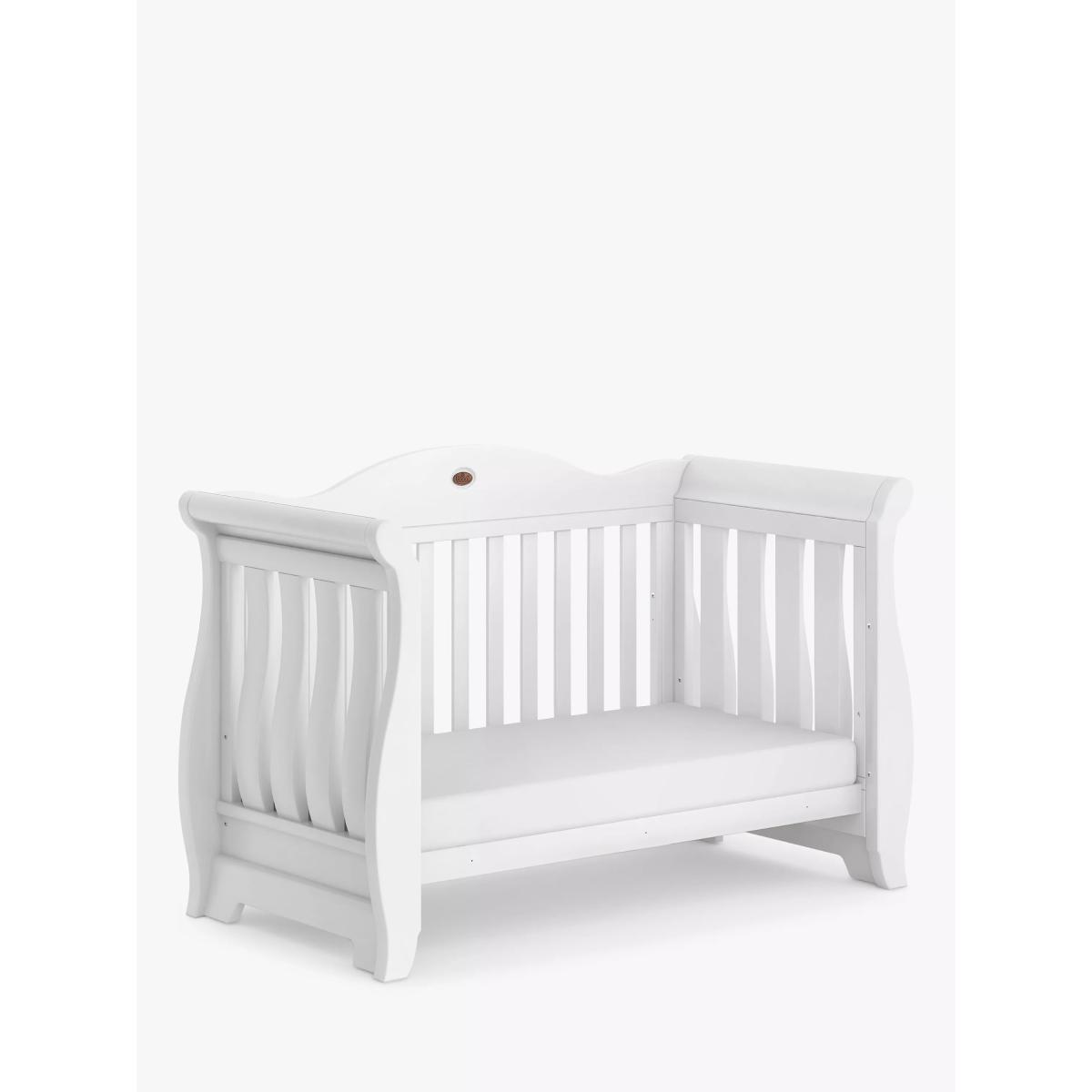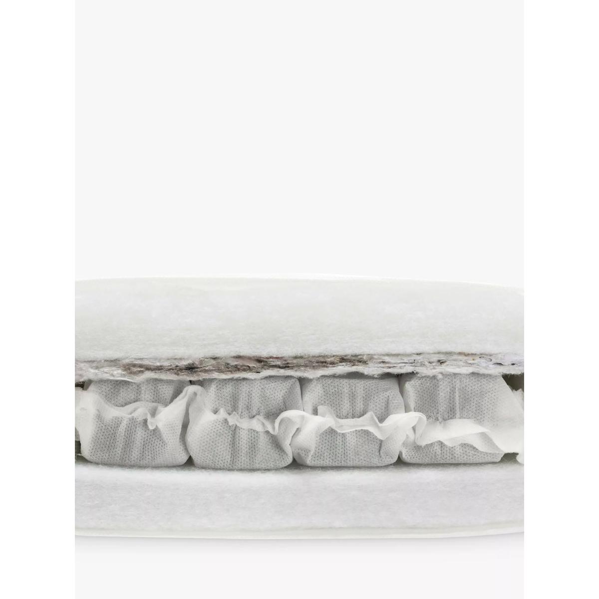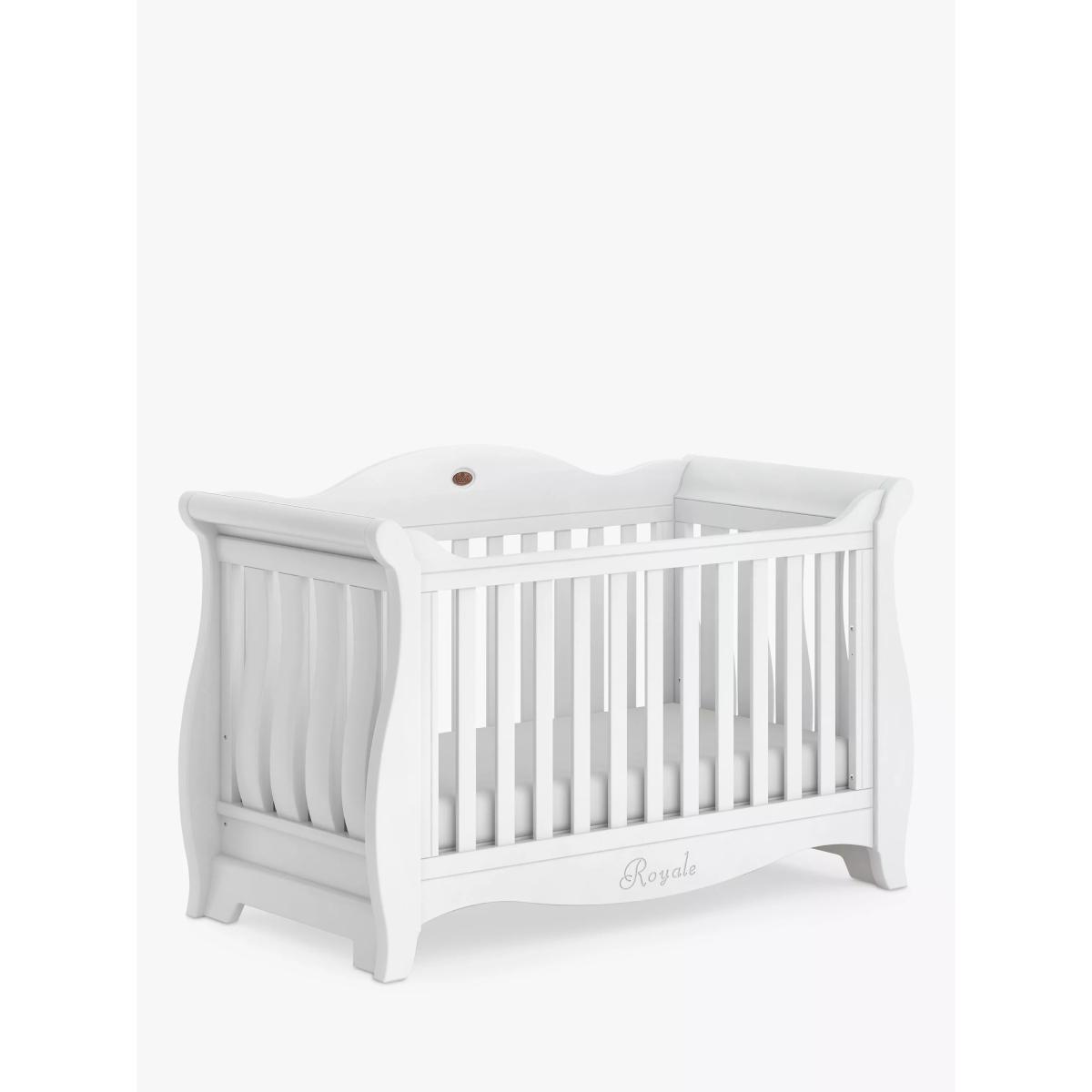 The Sleigh Royale Cotbed is the perfect centrepiece for a sophisticated and luxurious nursery. Meticulously designed, it intertwines timeless elegance with the superior craftsmanship that Boori is renowned for. It features a height-adjustable base which means it can evolve with your child's needs. Begin with the higher base level for easy access to your newborn, and as they grow and become more independent, adjust to the lower setting. As your child transitions from the crib, this sleigh cot effortlessly transforms into a cosy toddler bed and subsequently a toddler sofa, ensuring its place in your home for years to come. A Toddler Guard Panel can be added for extra peace of mind. The sleigh cot frame is crafted from sustainably sourced Australian Araucaria and New Zealand Radiata timber, both strong and durable woods that have been favoured by woodworkers for over a century for their strength and consistency of grain texture. The carpenters finish these cot beds with the brand's unique plant-based paint to keep nasty chemicals to a minimum in your home. The Sleigh Royale Cot Bed adheres to both Australian/New Zealand and European safety standards. Down to the beautifully carved 'Royale' calligraphy, every detail of this sleigh cot bed has been considered. The cot bed comes with a 3 year warranty. The Deluxe Purotex®️ Pocket Spring Cot Bed Mattress: The Deluxe Purotex®️ Pocket Spring Cot Bed Mattress is designed to provide baby with a comfortable and supportive night's sleep. It's handmade and features British ECO Ultra Firm Fibre, 230 micro Posturfil pocket springs and hypo-allergenic properties for complete peace of mind whilst your little one sleeps. With its innovative Dual. Tech technology, the mattress has deep Ultra Firm Fibre and an Ecobond insulator pad on one side for newborns as well as a side offering individual pocket springs for toddlers. This helps promote the perfect posture for your child as they grow. With an open cell structure, the firm fibre works with the pocket springs by moulding to the contours of the body. This provides support and allows for increased airflow. This cot bed mattress comes with a removable Purotex®️ Moisture Management cover. Fabrics that have been treated with Purotex®️ contain microcapsules that are filled with natural probiotics. These provide a natural remedy against common allergens. Thanks to friction, when your baby lays on the mattress, the microcapsules burst open and absorb humidity to reduce moisture. These probiotics start to multiply and clean up the allergens. Additionally, this mattress for cot beds also comes with a Barrier+ cover which is specially designed to remove dead skin cells and bodily fluids. Boori have a rigorous approach to the design and development of their mattresses. They are pounded 30,000 times to ensure they can last and last. They do wash, fire and toxicity tests as part of their strict quality control.
