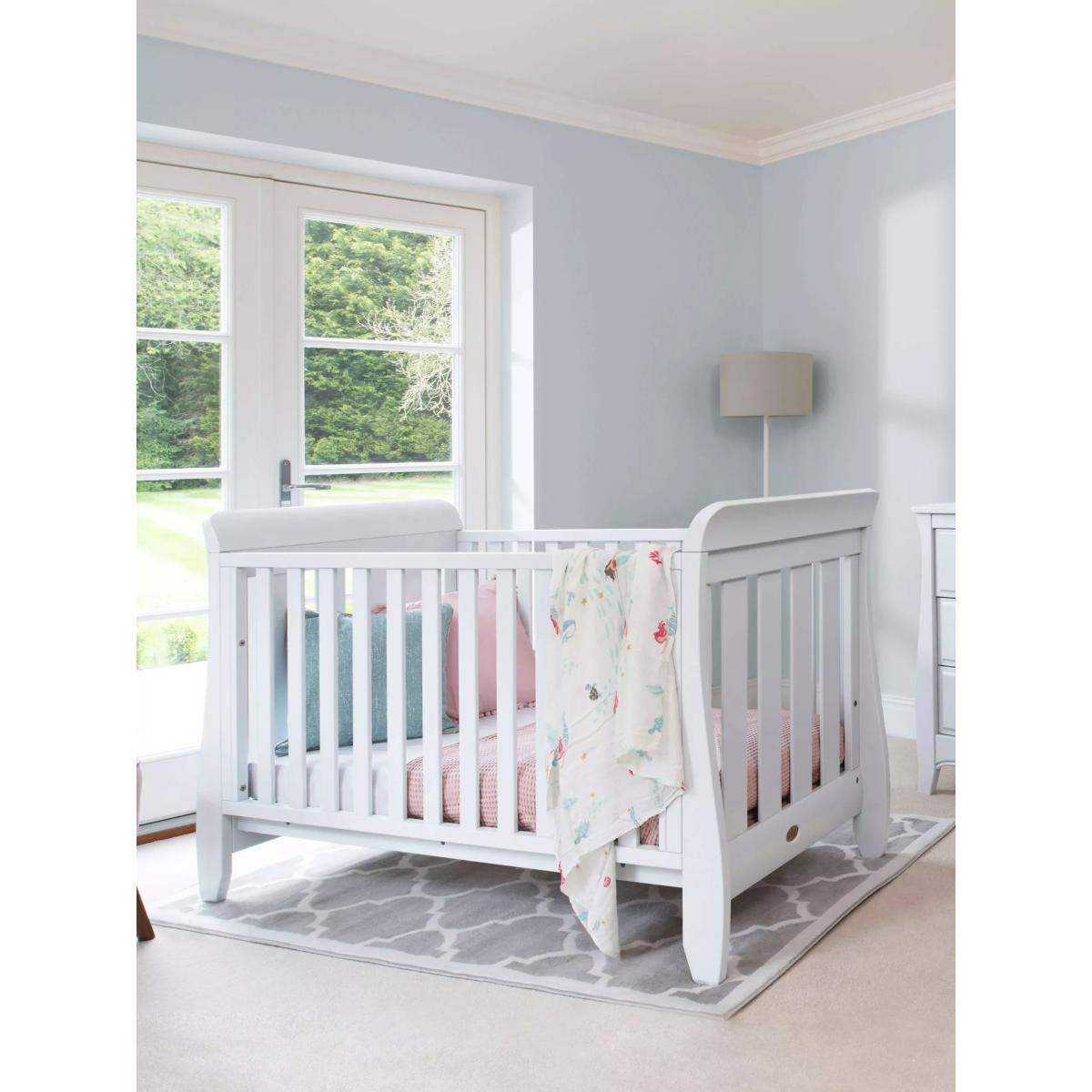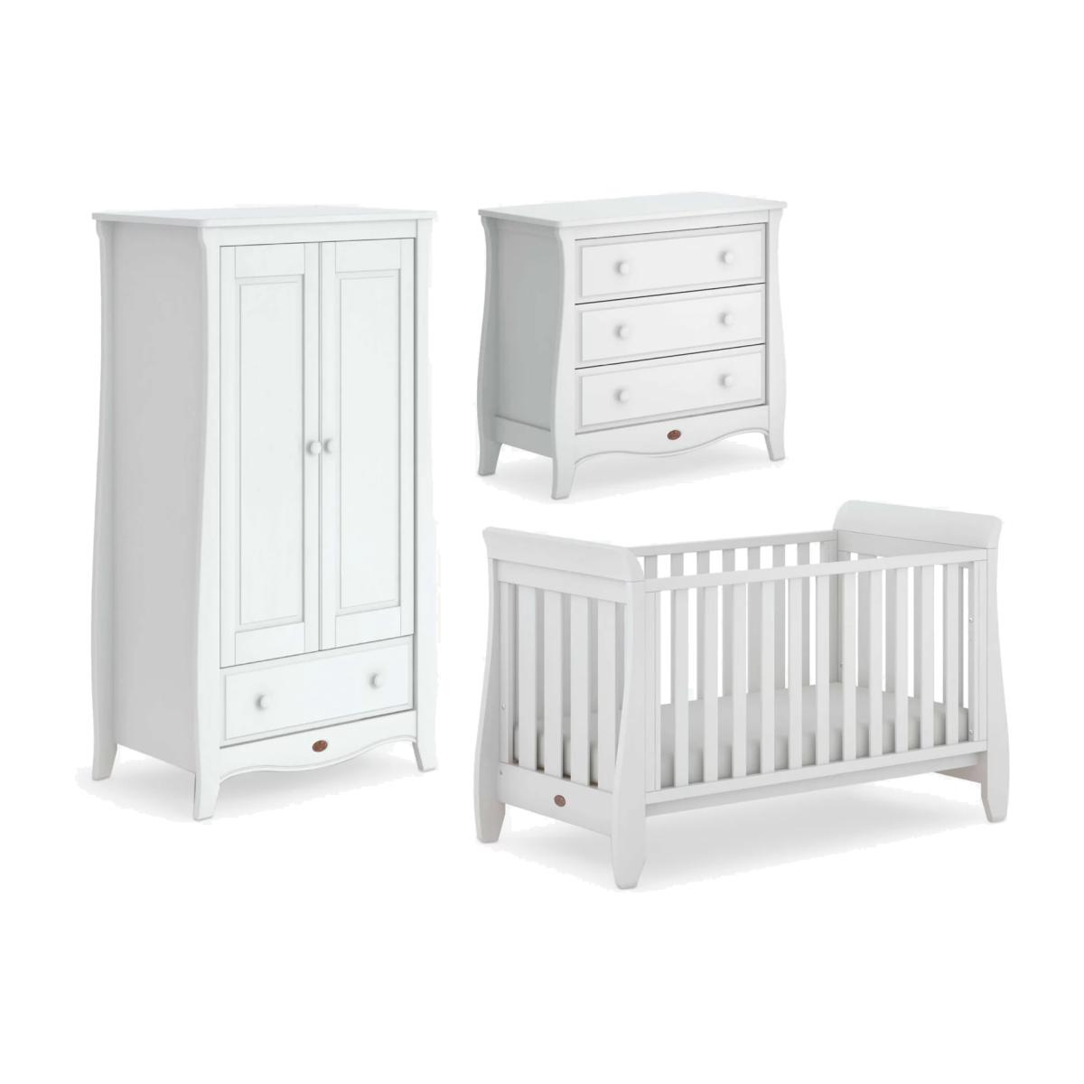 Boori combines classic heritage with contemporary trends to create nursery furniture to treasure for years to come. This stylish 3 piece nursery furniture set includes a Sleigh Urbane Cotbed, Sleigh Wardrobe and the Sleigh 3 Drawer Chest with Smart Assembly technology. Cotbed: : Offering a beautifully modern update on a timeless classic, this Boori's Sleigh Urbane Cot Bed boasts unmistakable sleigh detailing but in a sleek and petite silhouette. This stylish baby cot is crafted with sustainable solid wood and has the ability to transform into a toddler bed, lasting you from birth to around 5 years. Converts from cot to toddler bed suitable from birth to around 5 years Crafted with sustainably sourced Australian Araucaria and New Zealand Radiata wood. The unique paint finishes are nursery-friendly and enhance the natural beauty of the sustainable timber. Option to rotate the fixed side panel to provide a low side when converted to toddler bed for greater safety and stability Two base heights. Higher base height for easy access to newborns, lower base height for when baby is able to pull themselves up Requires a L132 x W70cm mattress (included) A Toddler Guard Panel can be purchased separately for additional peace of mind Dresser: Boori believe building your nursery should be a memory to treasure, which is why they've done away with fiddly tools and have instead replaced them with innovative technologies. This unique chest of drawers features 3 fully-extendable drawers with dovetail joints for extra stability, the chest top features plenty of space for a change pad and changing essentials. Smart Assembly - No need for any fiddly tools Strong and sturdy design Solid wood frame, top and drawer-sides Dovetail jointed drawers Wardrobe: To give you even more storage space, the Sleigh Wardrobe features a fully-extendable drawer, a spacious top shelf and two hanging rails. It can be used with two hanging compartments, ideal for younger children's clothing, or with one hanging compartment for older children's and adults' clothing. Elegant curved design Includes integrated storage shelf with hanging rails Features one full-extendable storage drawer. Drawer and door handles crafted with sustainable solid Australian Araucaria wood, rest of wardrobe made with sustainable engineered timber. The waterborne nursery-friendly paints are low in VOCs and enhance the natural beauty of our timber