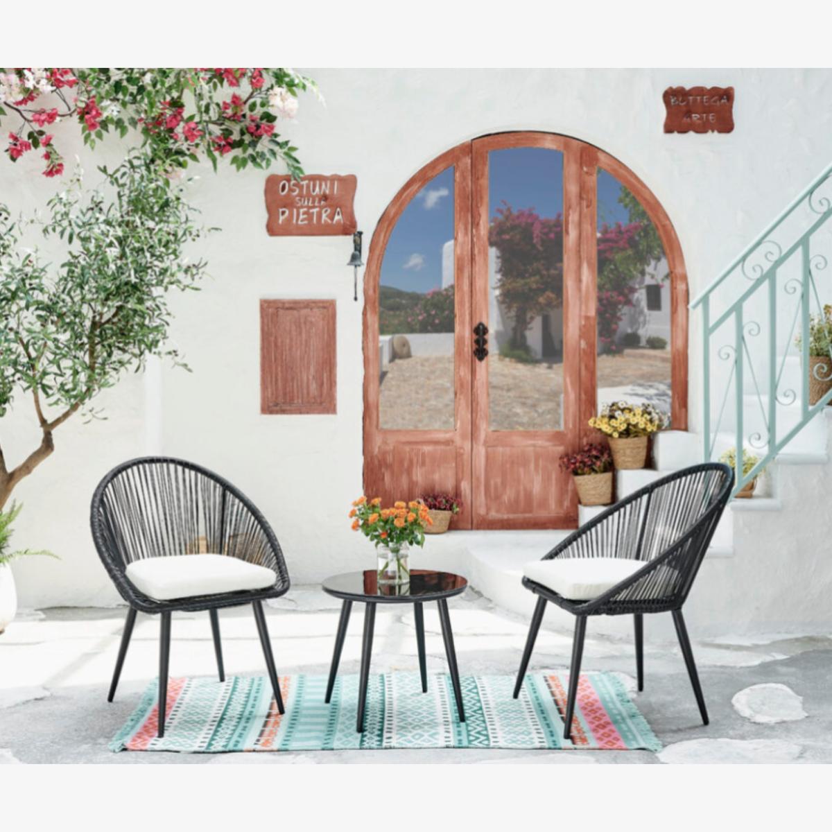 Our Bora 2 seat black garden bistro set with table is perfect for smaller outdoor spaces, decks or balconies. It's definitely compact but mighty! A modern design with some retro style nods, the Bora comprises of 2 round framed chairs with vertical weaving to the back with a sides matching small coffee table, in black PE resin with contrasting white seat pad cushions. This would look great with some structural planting to create a perfect spot for a coffee with a friend or a good book. Constructed from durable black PE rattan around a sturdy black powder coated steel frame. The 5cm thick foam padded white cushions contrast with the frames well and will have you relaxing in style and comfort! The round table features a 2.5mm thick tempered glass top perfect for snacks and drinks. The seats and table are UV and weather resistant so shouldn't fade. The cushions are splash proof (so if any spills occur, pick up the cushion and give it a firm pat on the underside to encourage the droplets to roll off). However, the cushions should not be left outside or in damp conditions. Store them somewhere warm and dry. If they do get wet then allow them to fully dry in the sun or somewhere warm before you store them. This set includes a FREE water resistant cover but please note, this is not fully waterproof and you should still store your cushions somewhere dry during wet weather and through winter. Check out our full outdoor furniture range today to complete your dream garden space! Assembly required - easy to follow instructions are provided.