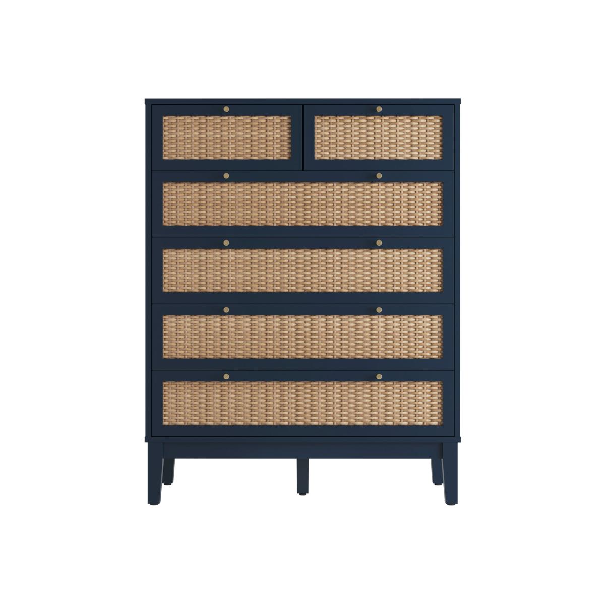 * On-trend rattan* Gold fittings and handles* Modern design* Blue frame* Contemporary The Bordeaux 6 Drawer Chest features on-trend rattan combined with gold fittings and handles. Its modern design and blue frame offer a contemporary aesthetic. This stylish chest is perfect for adding a chic touch to any bedroom.