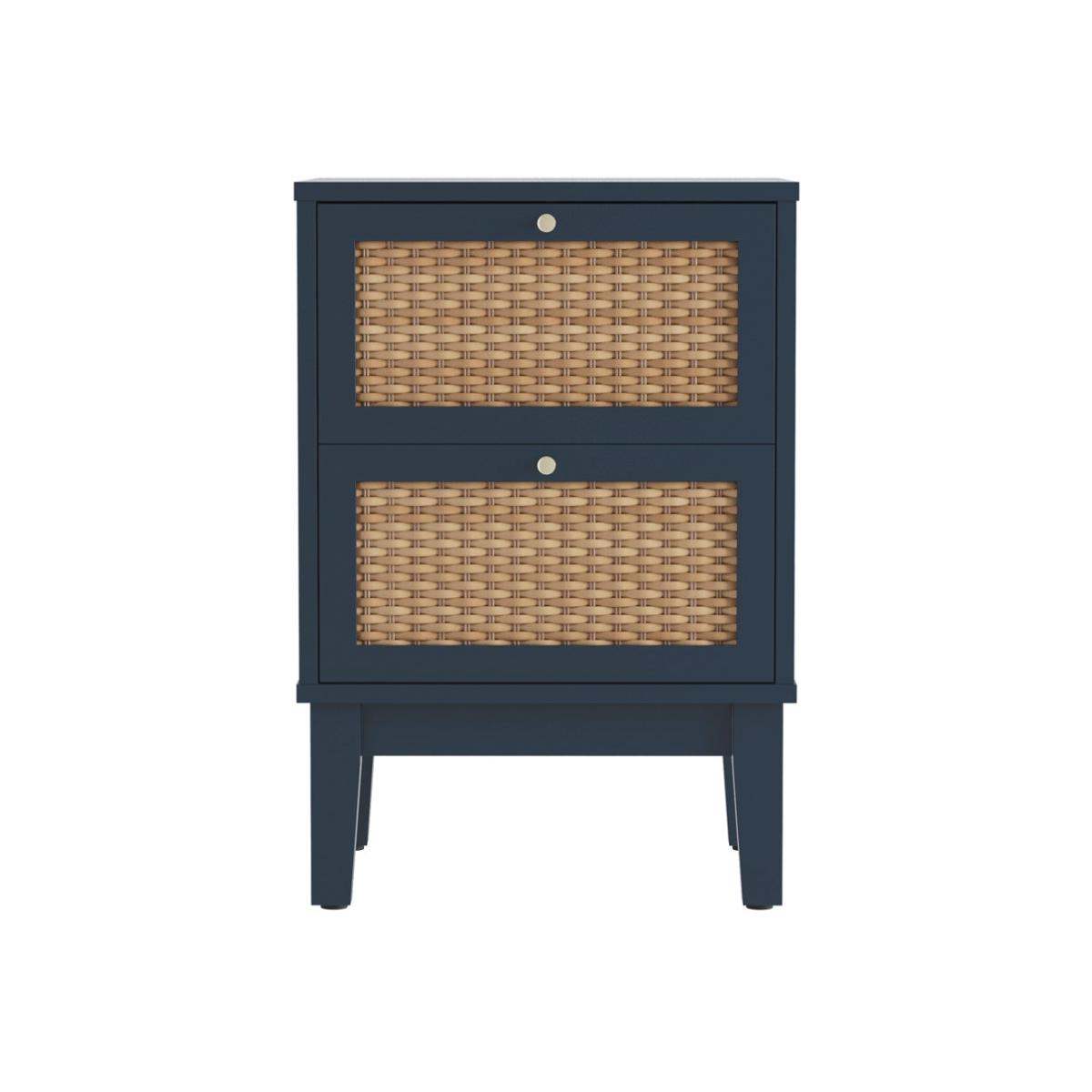 * On-trend rattan* Gold fittings and handles* Modern design* Blue frame* Contemporary The Bordeaux Bedside Table combines on-trend rattan with gold fittings and handles. Its modern design and blue frame create a contemporary look. This stylish piece adds a chic touch to any bedroom.