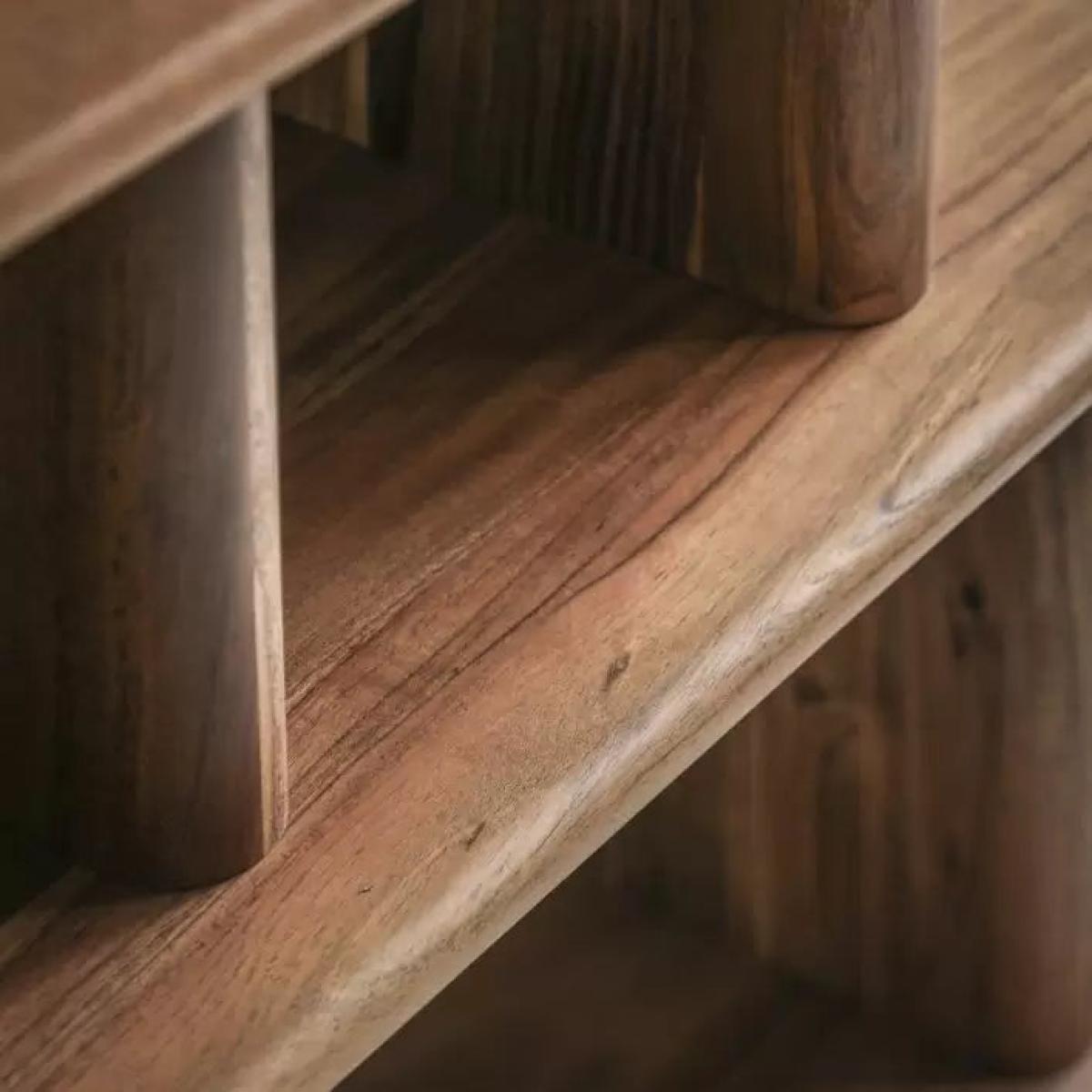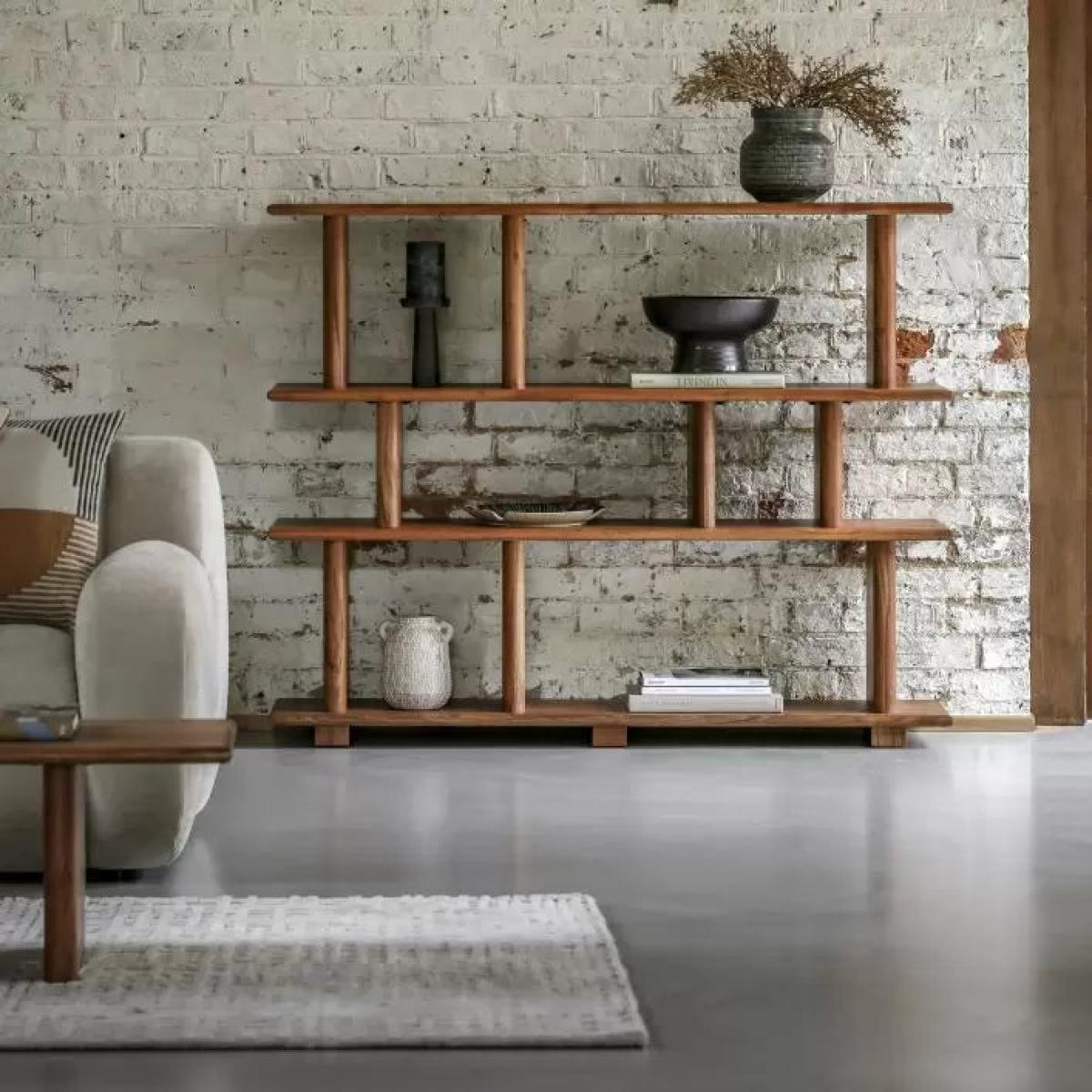 Made in rich and deeply grained Acacia wood this open shelving unit is perfect for showing off your favourite books and artistic accents. The 4 wide shelves are unevenly broken up creating a unique look that will be perfect wherever it is placed. Coordinating further furniture pieces also available.