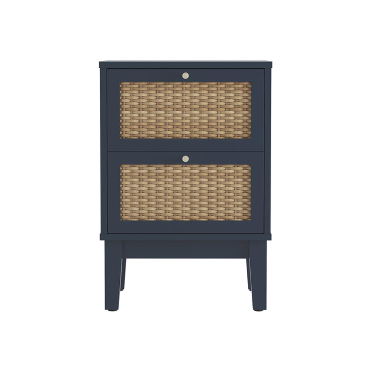The Bordeuax Bedside Cabinet features a stylish rattan effect detail on the front panels, which exudes a warm, exotic feel. The satin gold fittings and handles shine against the deep blue frame, creating a sleek and elegant look. Complete with two spacious drawers, this bedside provides ample storage space for all your nighttime essentials or anything you need to keep to hand, making it a practical solution to any size bedroom.