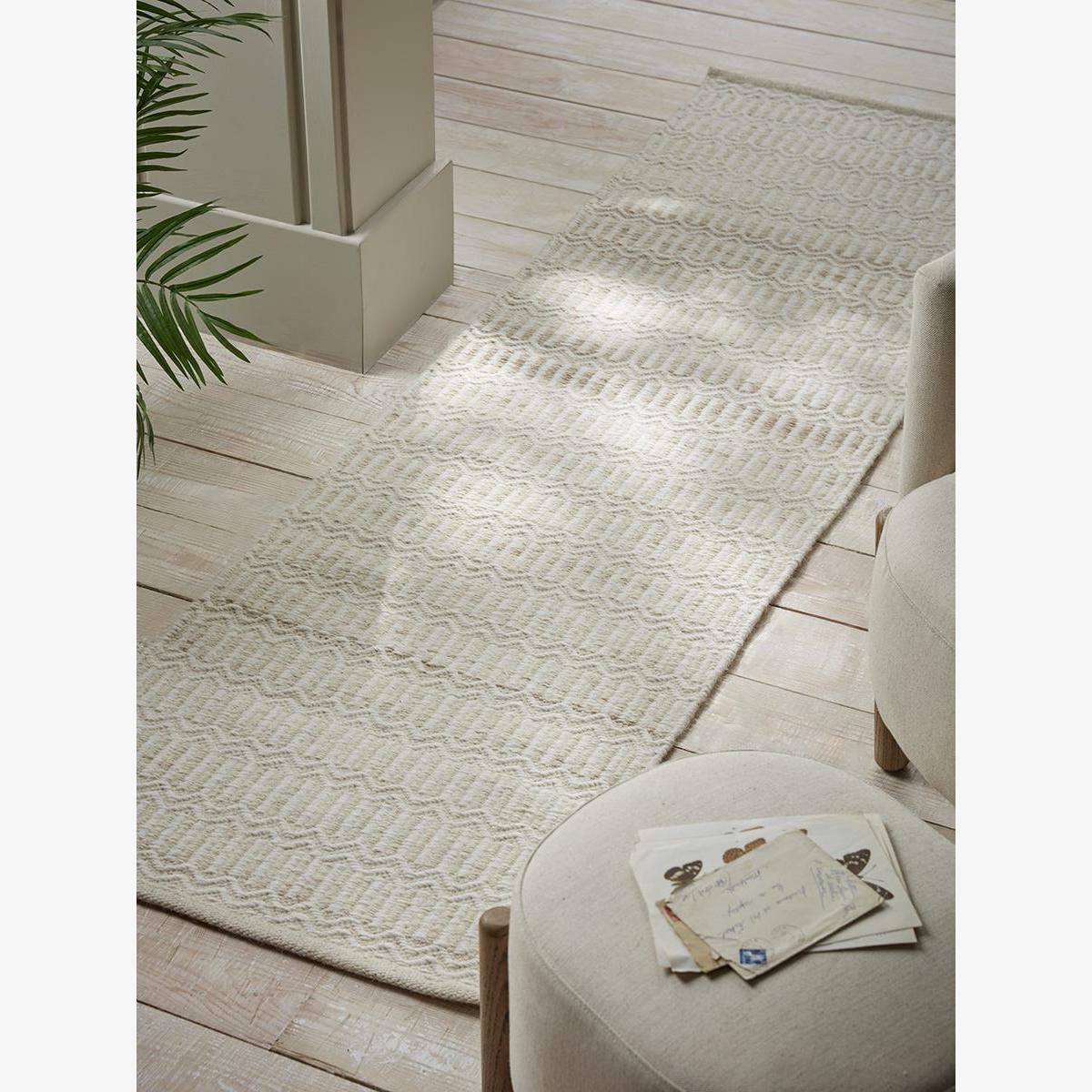I love this runner for its understated elegance and subtle texture, making it versatile for a variety of interiors. It works particularly well in neutral or light-coloured schemes, adding warmth and a touch of sophistication to hallways, entryways, or alongside sofas. For practical styling, consider pairing it with natural materials like wood or rattan to enhance its earthy feel, and keep accessories minimal to highlight its gentle pattern. It's definitely a great choice for those looking to add a refined yet practical touch to everyday spaces.