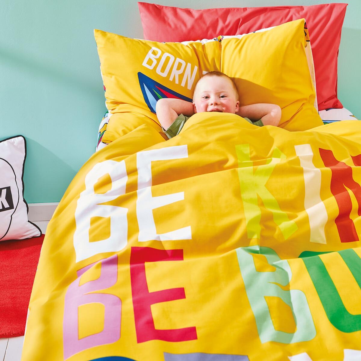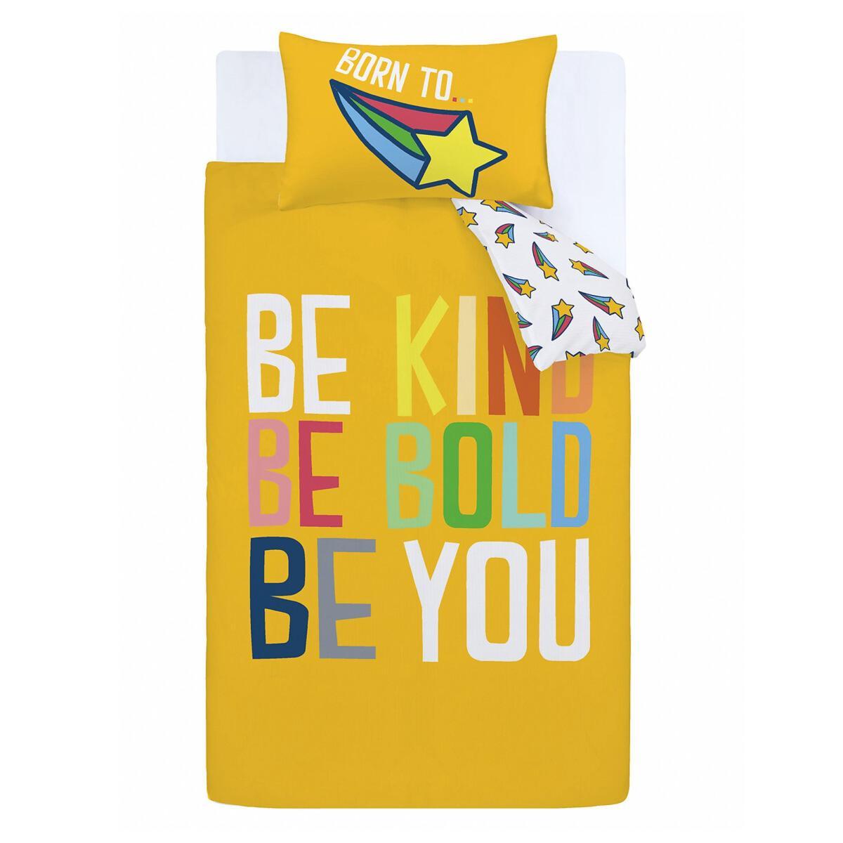Here at Born to… We encourage self-expression and individuality, banishing the gender boundaries and championing children to be whatever they want to be. The collection is created using Organic Cotton which celebrates healthly sleep and a happier planet, grown with no harmful chemicals or pesticides to benefit our little heroes and the agricultural workers who produce it. Don’t Change, Always Be You! Shoot for the stars and spread kind words around the room with this encouraging slogan duvet set lovingly created with your little one in mind. This 100% Organic Cotton set is kind on the skin and breathable for blissful night sleep. Machine Wash at 30 Degrees. Available in the following Sizes:Single Duvet Set- 135x200cm + 1 50x75cm Pillowcase. Double Duvet Set- 200x200cm + 2 50x75cm Pillowcases. This product will be dispatched by one of our trusted suppliers. You’ll be contacted by their selected courier about your delivery.