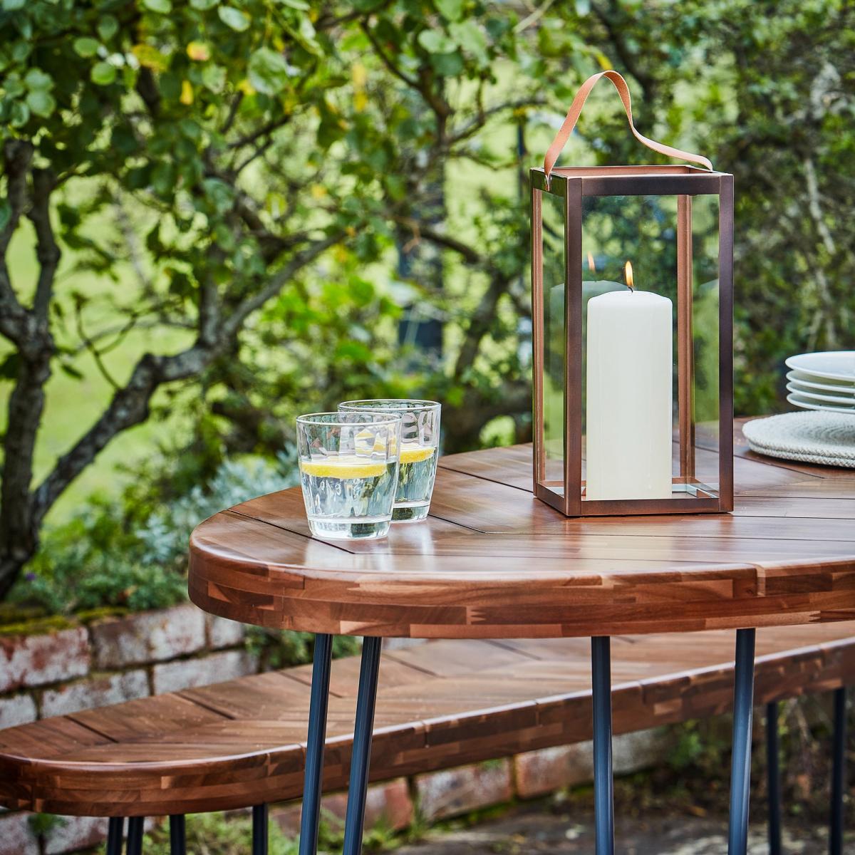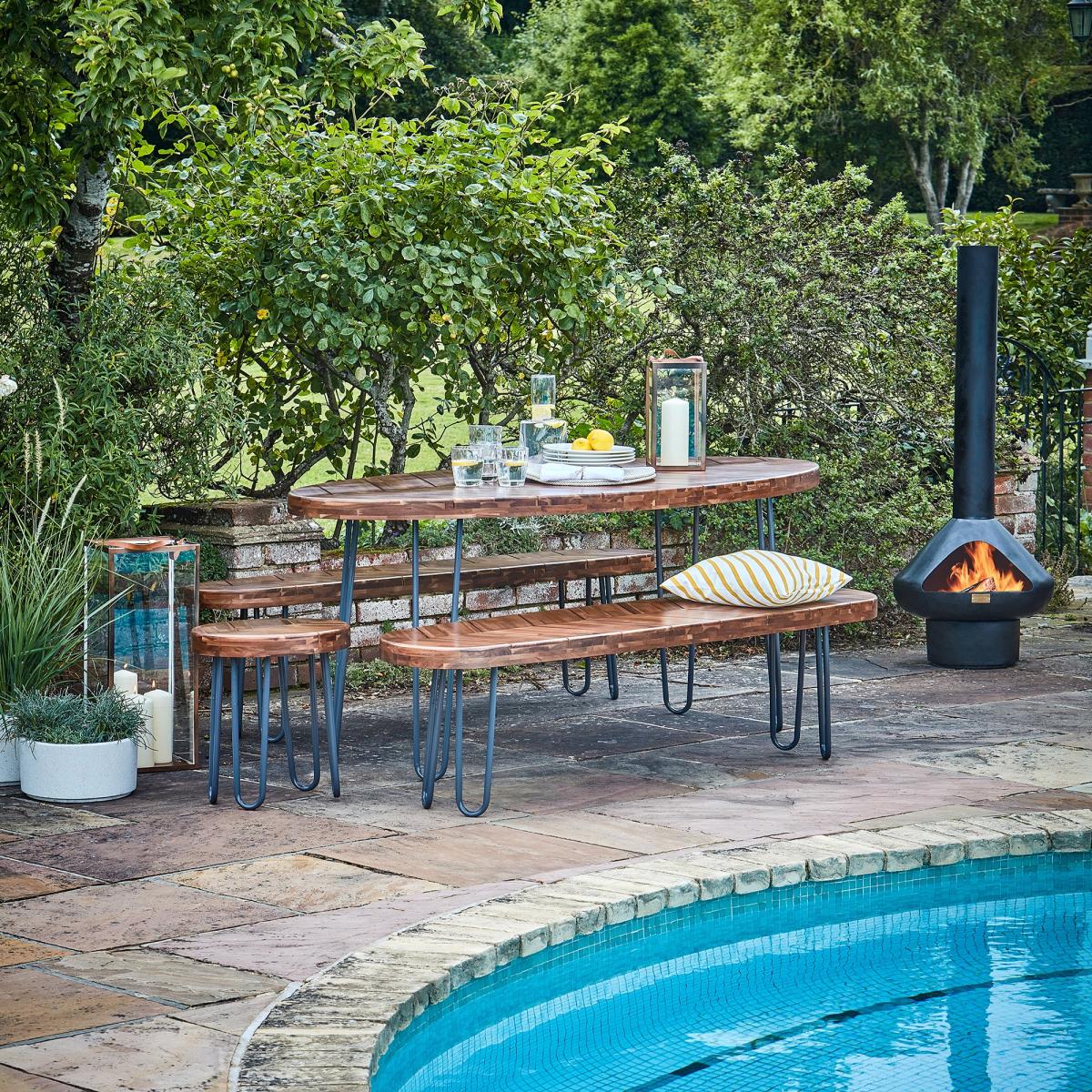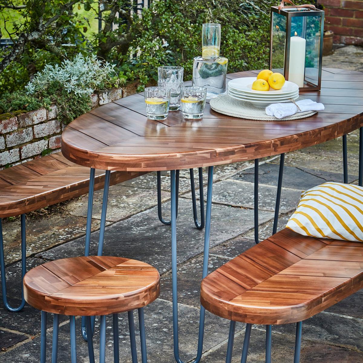 I love the Borough outdoor set for its robust acacia wood construction and its inviting, rustic appeal. It works really well in a variety of garden styles, from modern minimalist to traditional countryside, thanks to its natural tones and straightforward design. For styling, consider pairing it with cushions in durable weatherproof fabrics to add colour and comfort, especially for longer alfresco gatherings. To enhance its natural feel, surround the set with lush greenery or potted plants, and keep the look cohesive with matching accessories like wood or metal lanterns. This table and bench combo creates a practical yet stylish focal point, perfect for outdoor dining seasons.