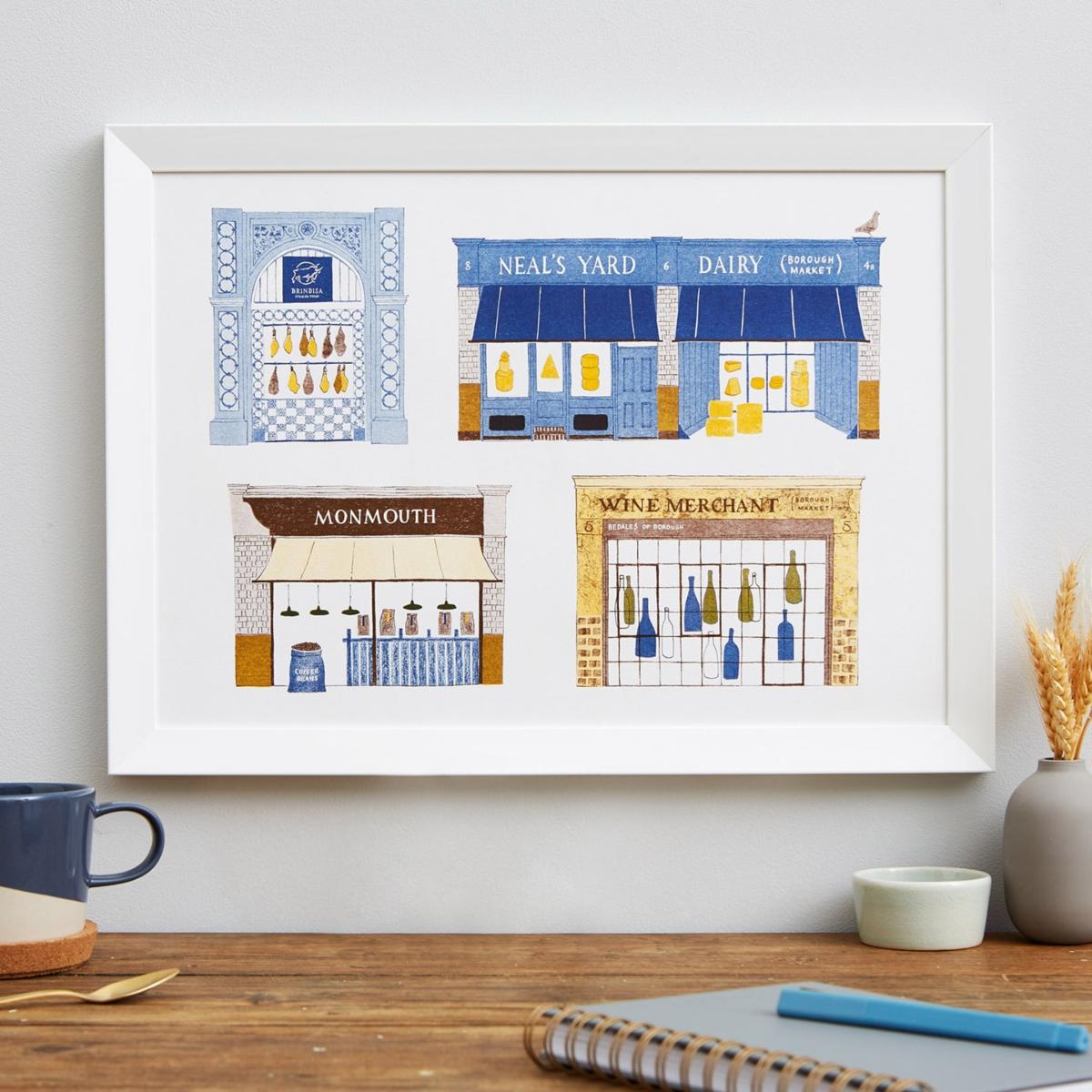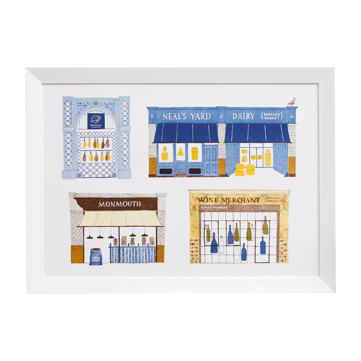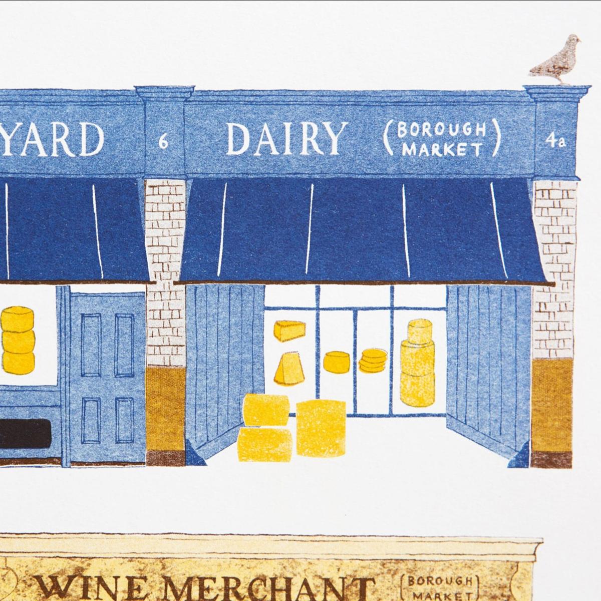 London’s Borough Market is full of foodie (and boozy) delights and this illustration celebrates some of my favourite spots. Three colour risograph print (sunflower, federal blue and brown). Printed on 175gsm ‘Coffee Cup’ paper. This lovely paper is 100% recycled and is made with 50% disposable paper coffee cup waste. It has the occasional fleck. Riso printing is an environmentally friendly printing process which uses soy-based inks. Each colour is printed as a separate layer. The nature - and charm - of the process means that there can be slight irregularities and misregistrations in the prints.