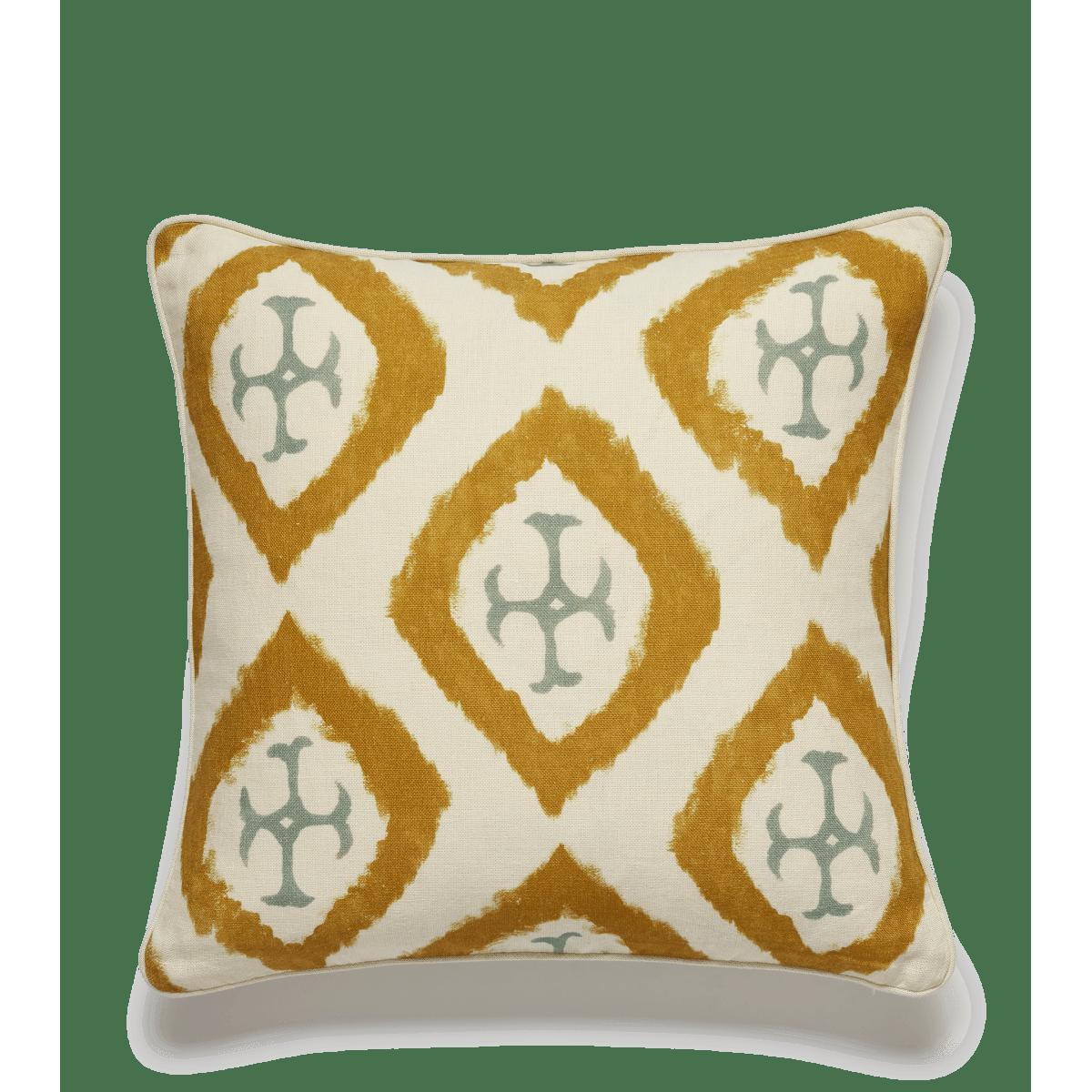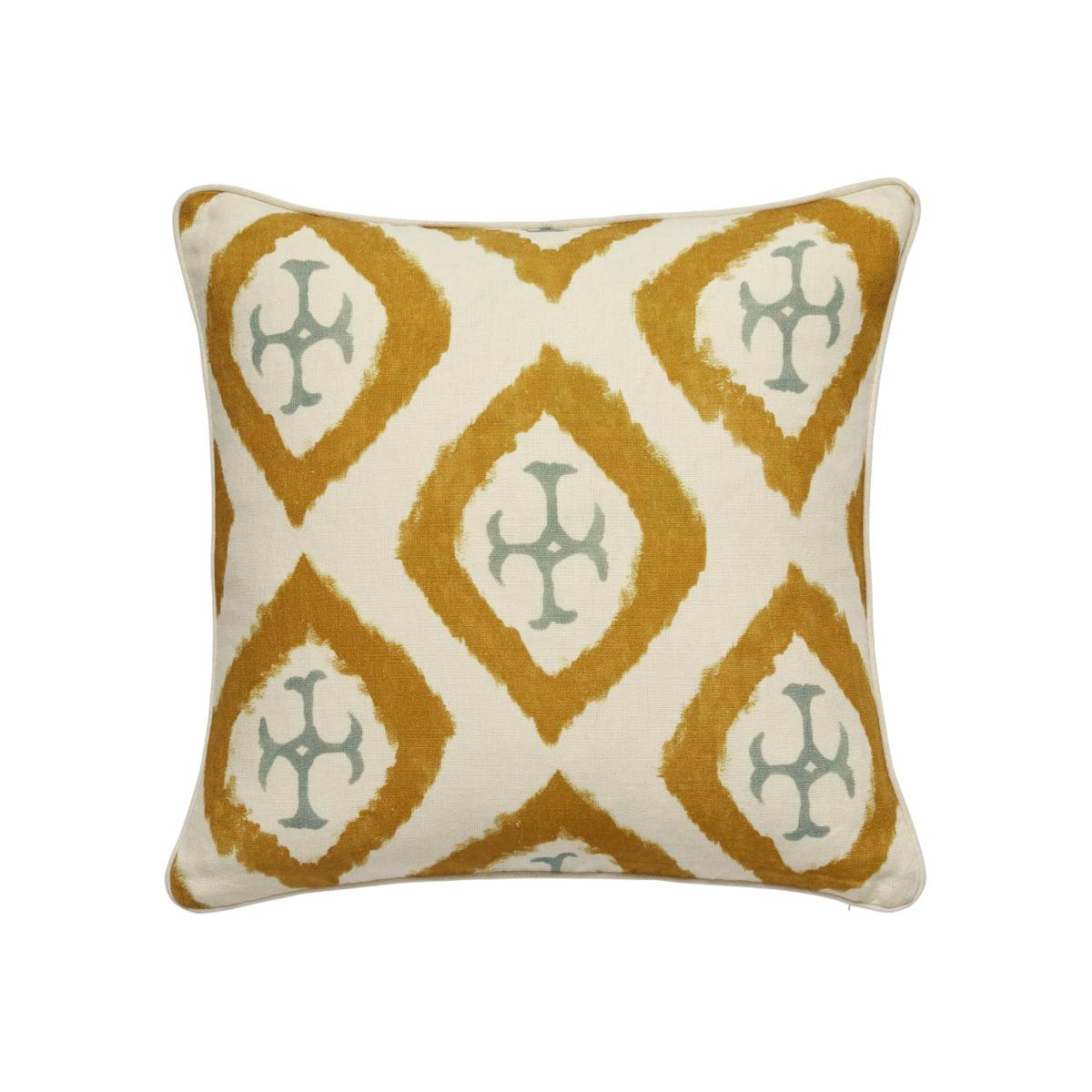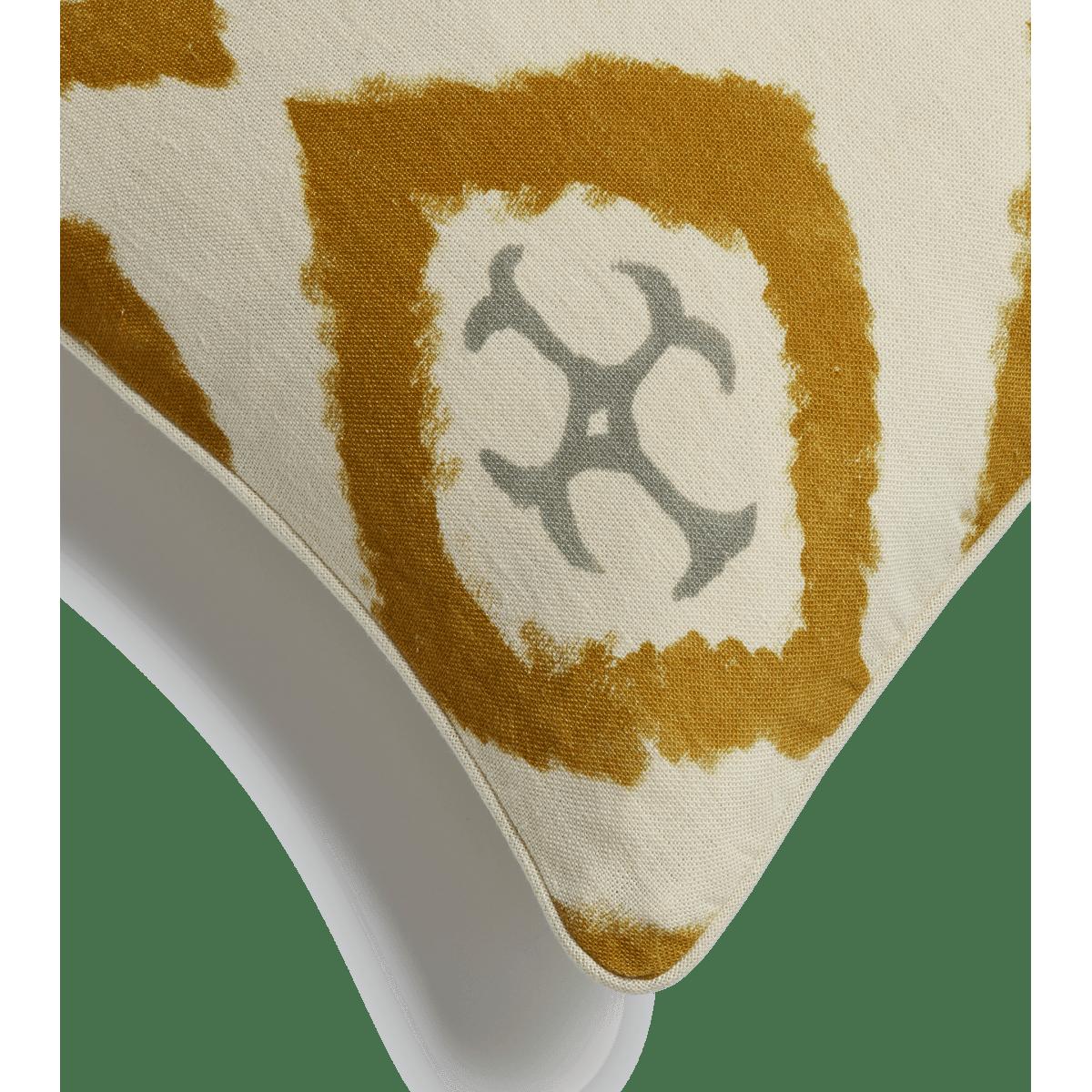 The heavy linen used for our Borrayo Cushion Covers has a quality feel that lends the perfect base for the artwork of our Ikat-style design. Ikat is an ancient dyeing technique that originates in Indonesia requiring the skill of masterful artisans. We have digitally printed the pattern onto the linen so that all the character of the paintwork is portrayed, from the pattern itself, to the soft painterly lines that blend from the mustard yellow into the white. Our range is named Borrayo for this very reason – a play on the Portuguese word for ‘blur’, which is a distinctive quality of Ikat designs. This is the largest pattern in the range and pairs well with the other designs.