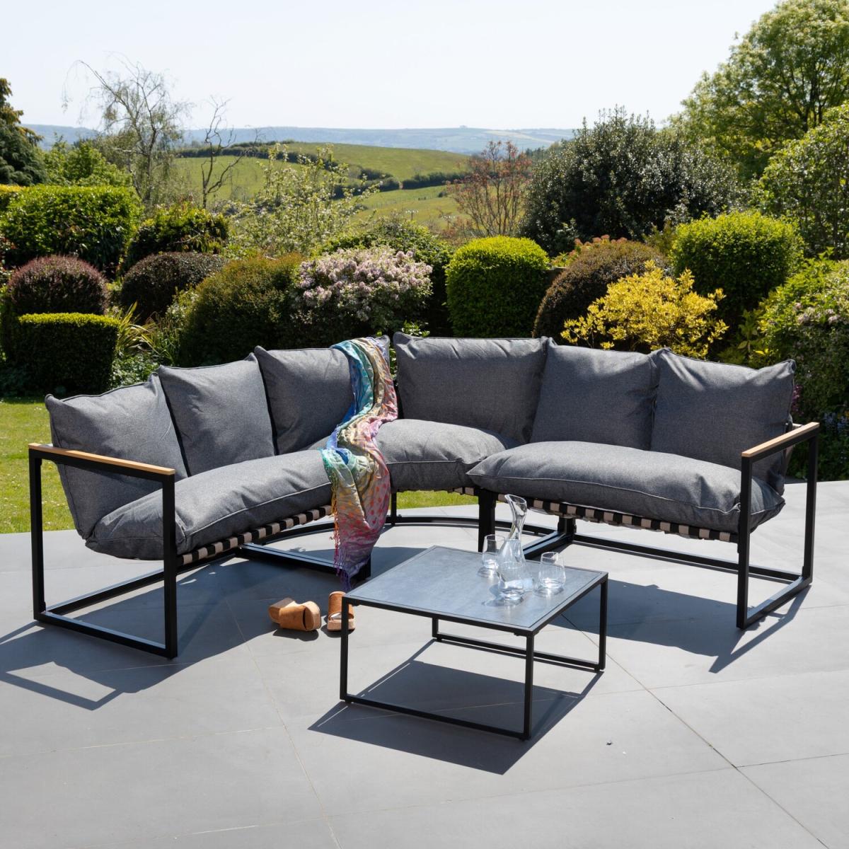 Create a welcoming outdoor lounge with the Bosque Outdoor Corner Sofa Table. Featuring an L-shaped design with black metal frames, brown support straps, and dark grey cushions, this set offers ample seating and a coordinating table for entertaining guests. Designed for straightforward self-assembly with comprehensive instructions, and with our express delivery service, you can enjoy your new outdoor space in no time. Dimensions - Corner (210cm W Each Side x 70cm D x 67cm H) Table (65cm W x 65cm D x 35cm H)