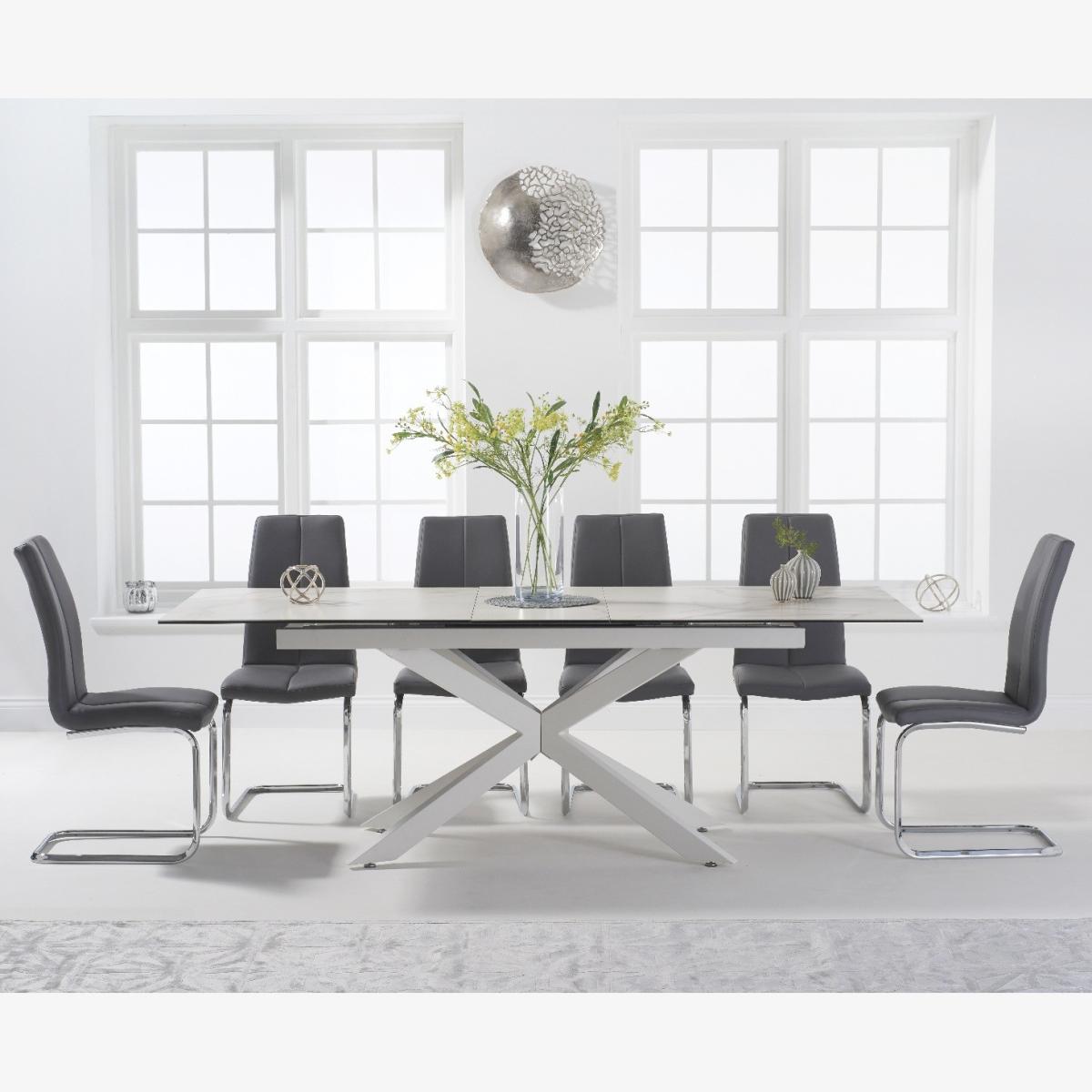 This set is a versatile choice that works well in modern and contemporary interiors owing to its clean, minimal design. The white ceramic table adds a sleek, bright focal point, making it ideal for both open-plan spaces and smaller dining areas. The extending feature offers practicality, accommodating both intimate dinners and larger gatherings with ease. The grey Tarin chairs bring a touch of neutrality that pairs effortlessly with various colour schemes and textures - think warm woods, bolder accents, or coloured accessories. Styling tips include adding a statement centrepiece or colourful placemats for personality, while maintaining a minimalist aesthetic. It’s equally suitable for family homes or more formal dining spaces, thanks to its blend of practicality and modern style.
