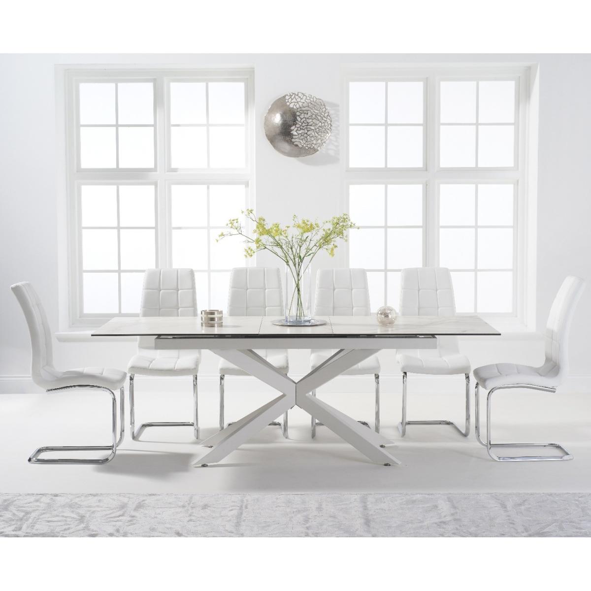 The ultra-chic 180cm Boston table is the perfect addition to any modern dining space. Featuring a handy extending system, a contemporary white ceramic top and a unique cross design support - the Boston is practical and looks great! Pictured here with the beautiful Lorin chairs. Eye-catchingbase. Ceramic top Extendable and practical180cm table