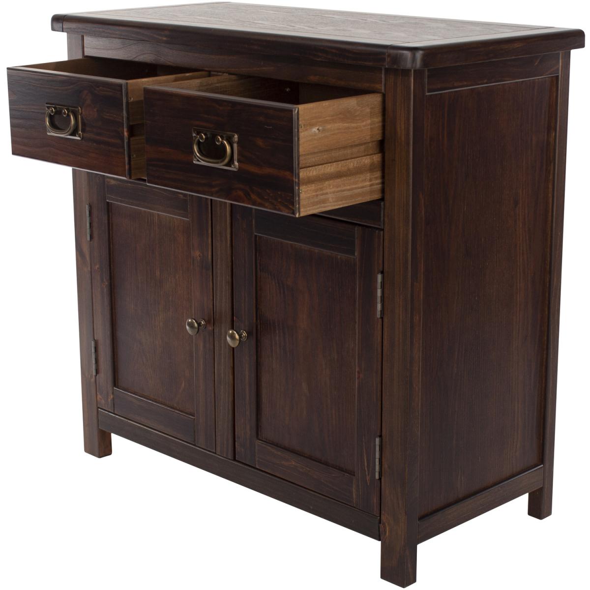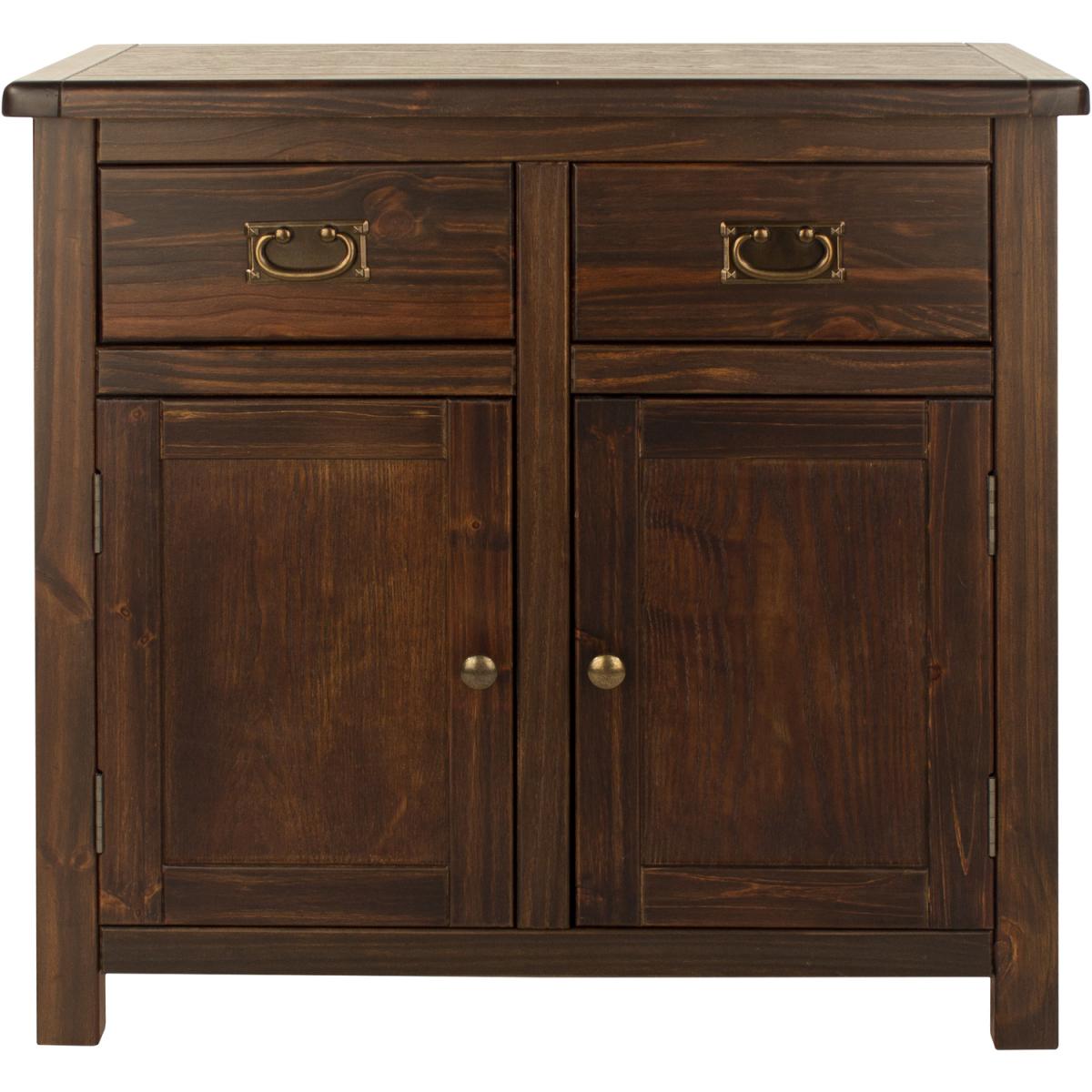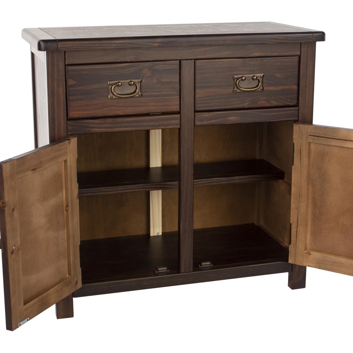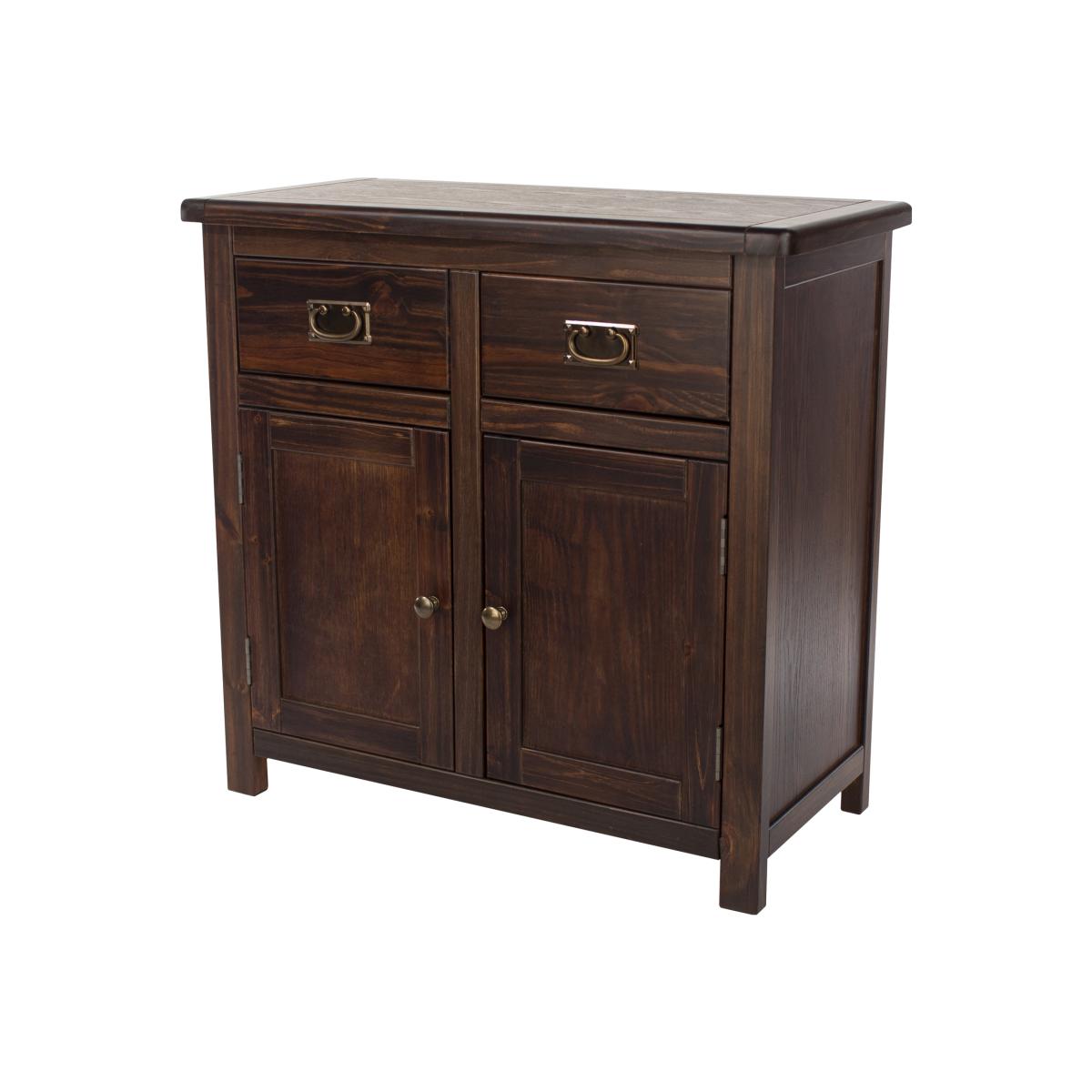 Add a touch of antique flair to your living room with this beautifully crafted Boston 2 door 2 drawer sideboard. The two useful drawers with cupboard space below and an internal shelf make this cabinet perfect to house your cutlery, glasses and crockery. It offers plenty of storage space and looks great with most styles of home decor. The simple design and dark tone of the cabinet create a sense of opulence, with the antique brassed colour of the metal handles adding to the luxury.