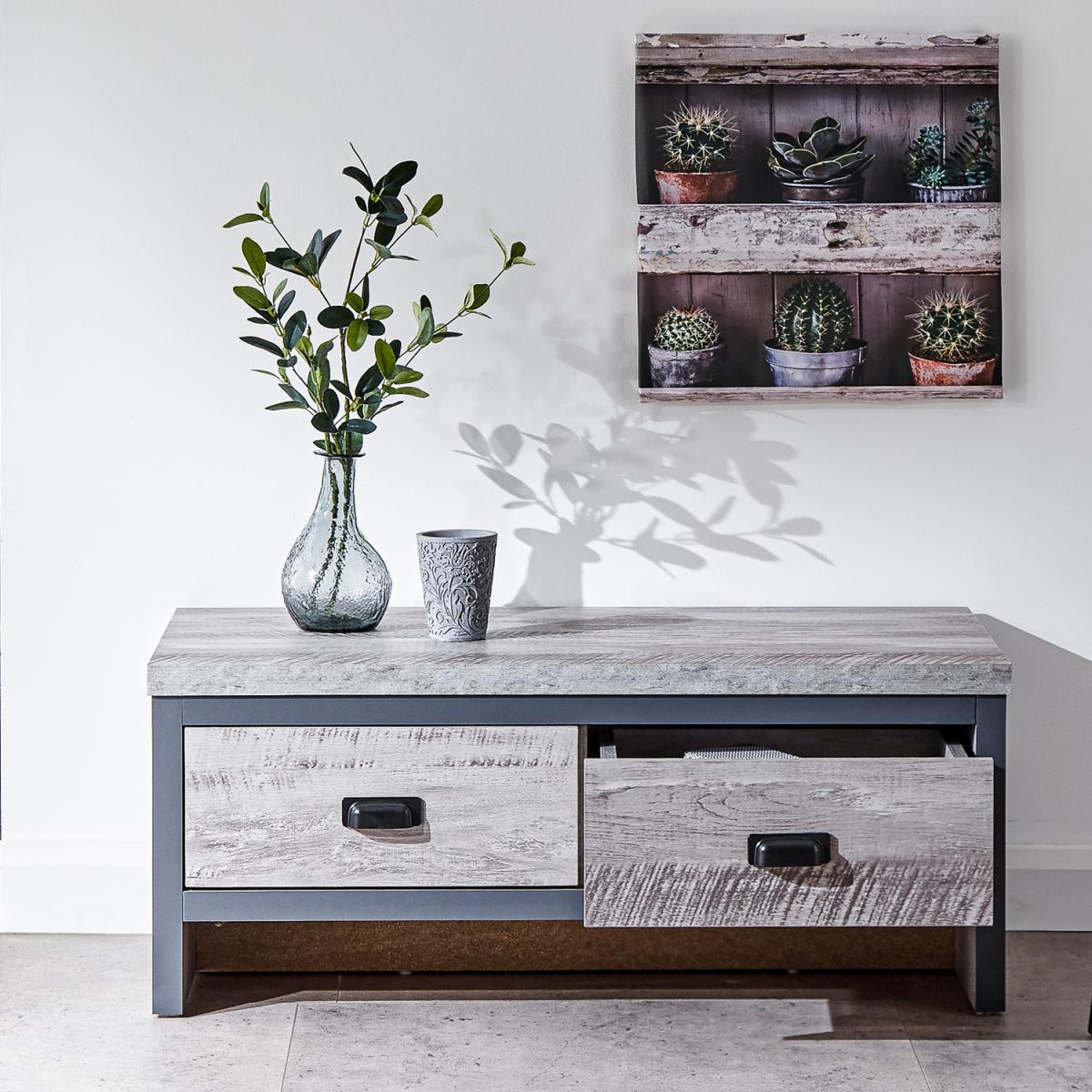 Give your interior a touch of urban chic with this no-nonsense coffee table. The sturdy construction is finished in a durable distressed oak or industrial grey effect with chunky 30mm top and deep wooden frame in contrasting grey tones providing an authentic look and feel. The two deep drawers have a matching wood-effect finish inside and are ideal for magazines, books and TV control boxes. The matching faux drawer fronts on the opposite side create a pleasingly symmetrical design without sacrificing storage depth.