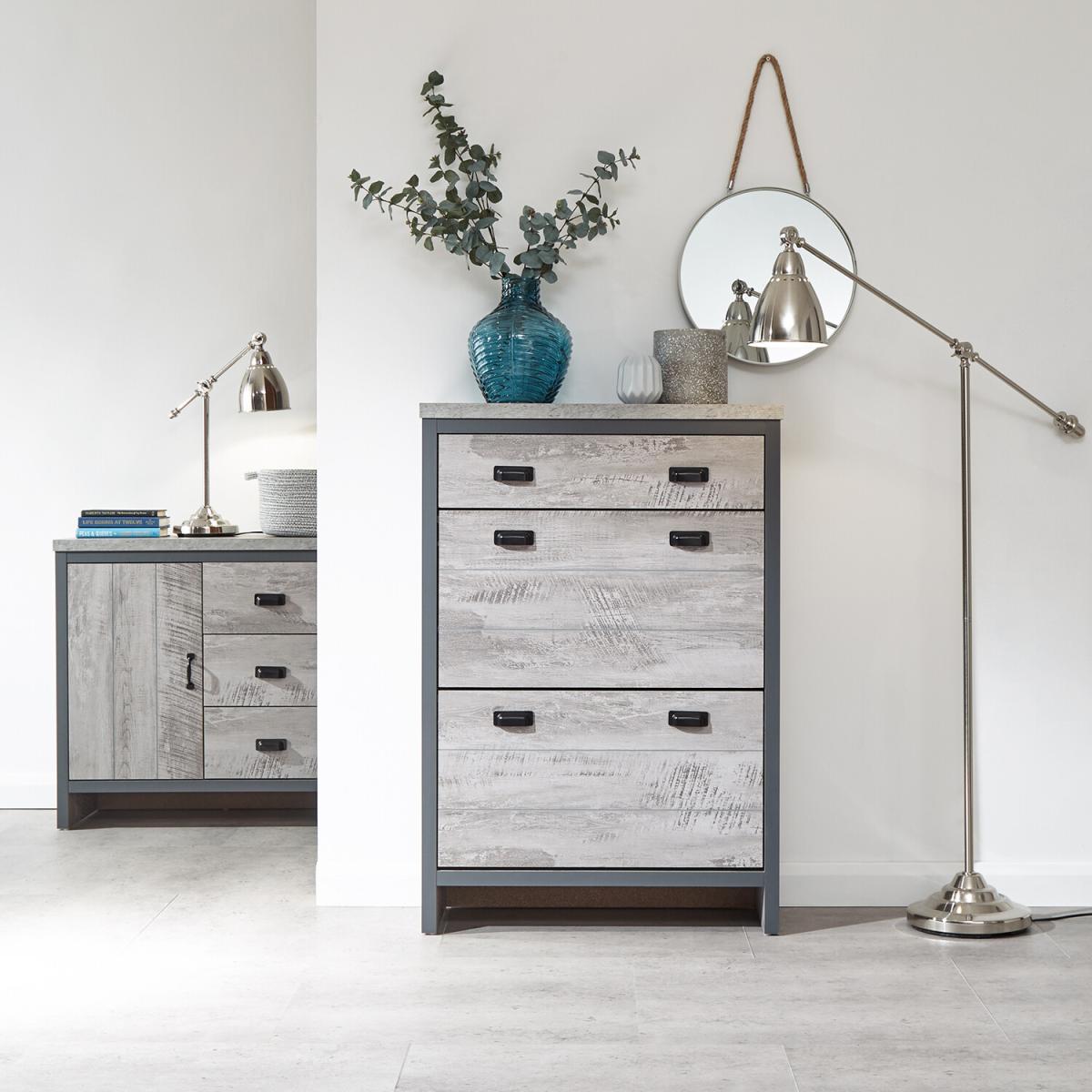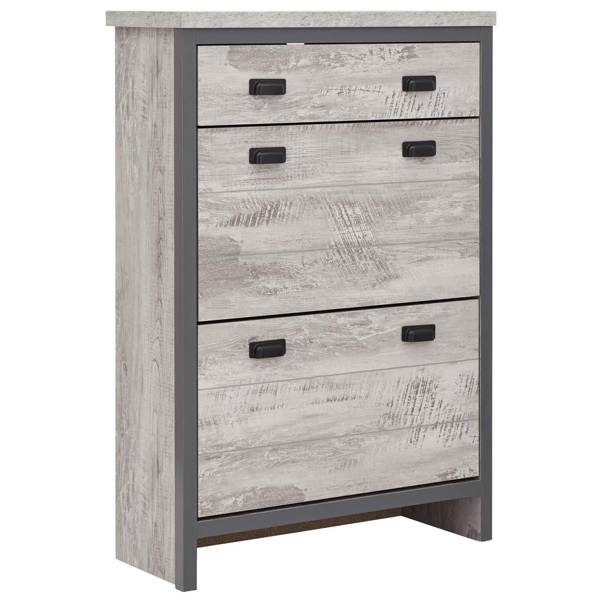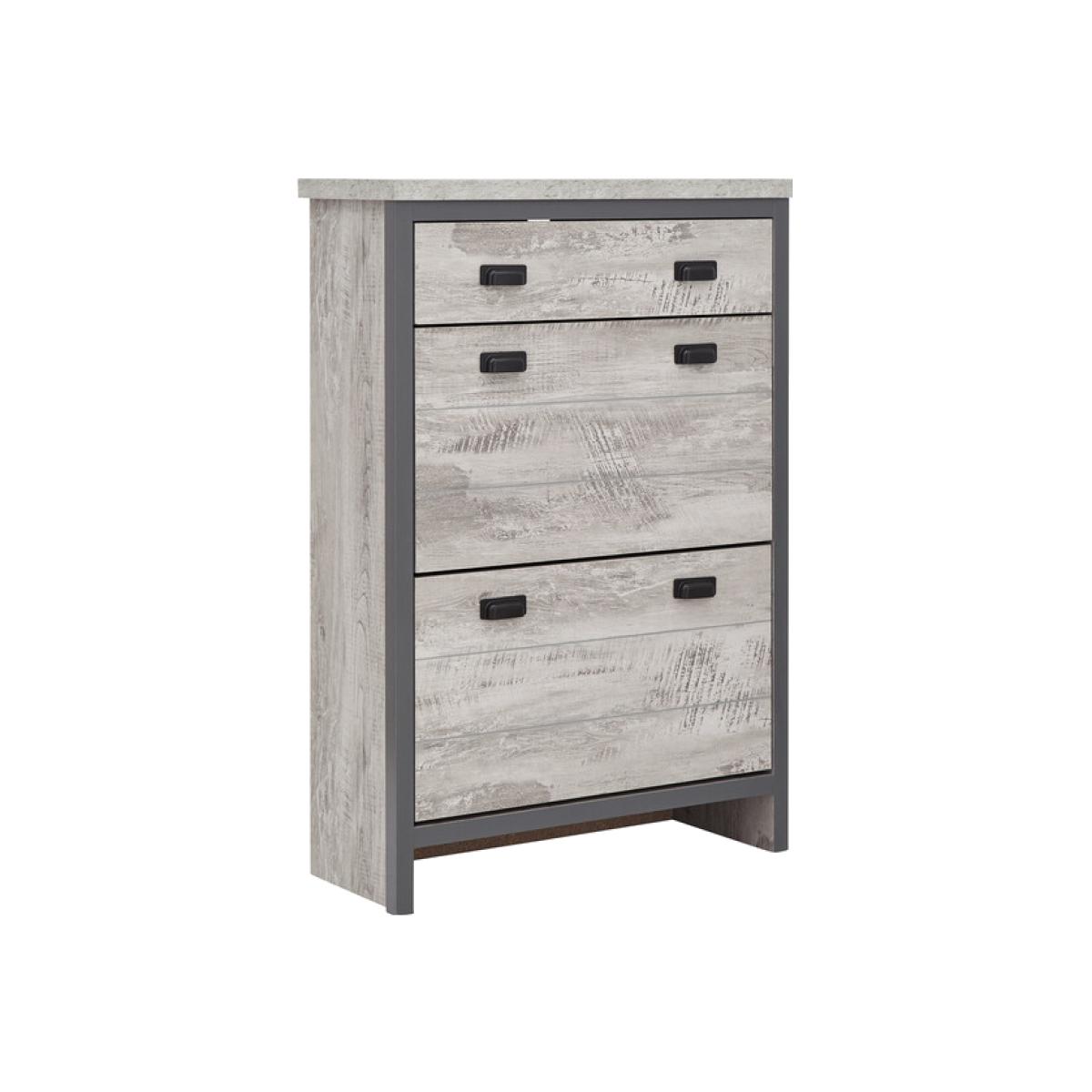 Free up much-needed hallway space with this stylish Boston 2 Tier 1 Drawer Shoe Cabinet. The slender design makes it a smart choice for narrow spaces, while the chunky panels give it a feeling of quality. The full-width top drawer is ideal for gloves, keys and other outdoor accessories - or even pet collars and leads. Beneath are two pull-down shoe compartments, each capable of accomodating up to six pairs of standard size (UK10) men's shoes - a dozen pairs in all - keeping them out of sight and off the floor. The cabinets distressed, urban-inspired frame is a good match for contemporary interior schemes and can be discreetly positioned in the hall or bedroom. A smart, compact storage solution.