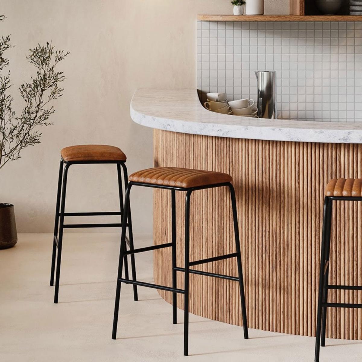 I’m a fan of this vintage-tan bar stool for its clean lines and slim metal frame - it never feels bulky in a smaller kitchen or snug breakfast bar. The warm faux-leather seat works equally well in industrial, Scandi or modern farmhouse schemes, and the lack of a back keeps sightlines clear. As a styling tip, group three or four along a counter in front of a matt-black or concrete-look island to maximise contrast, and keep a small rug underneath to protect floors. The simple design also means it wipes clean easily, making it a practical choice for everyday use.