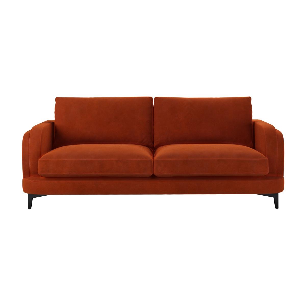 I love this three-seater because it combines modern comfort with a bold colour statement. The brick aquaclean velvet is not only stylish but practical, making it perfect for busy family homes or those who like to entertain without worry. It suits various interiors, from contemporary urban spaces with cleaner lines to more eclectic or vintage-inspired rooms that can be warmed up with textured accessories. For styling tips, consider pairing it with understated tables and cushions in complementary earthy tones or contrasting patterns to really make the colour pop. Rounded arms lend a welcoming feel, so it works well in open-plan living areas where creating a cosy zone is key.