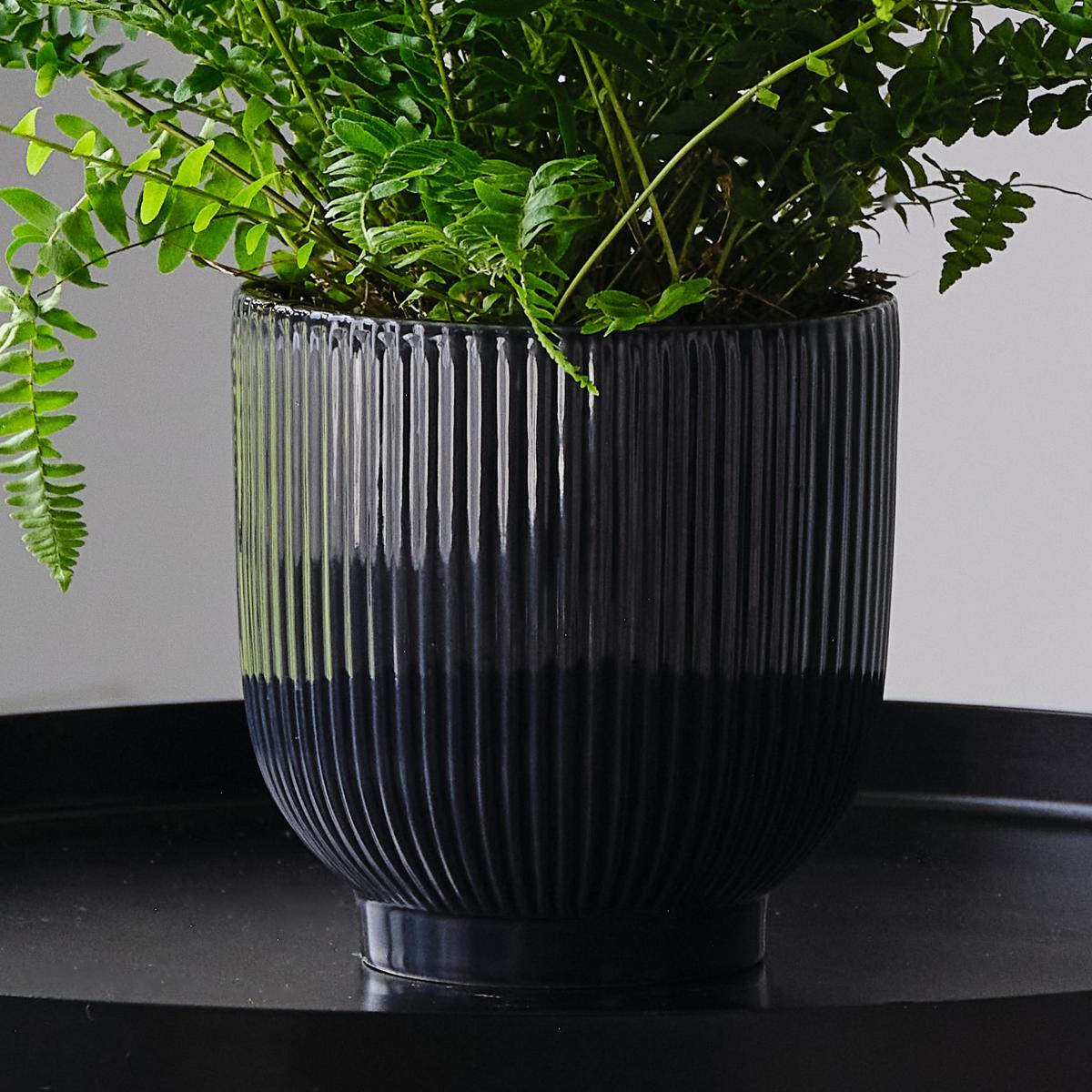 Boston Fern House Plant in Ribbed Pot Ceramic Navy