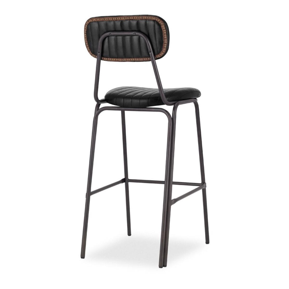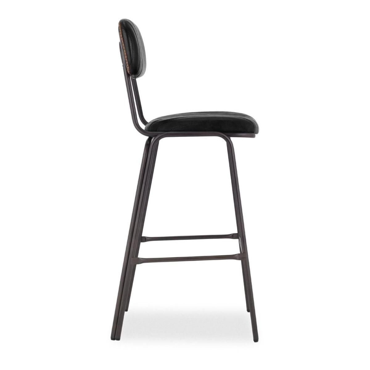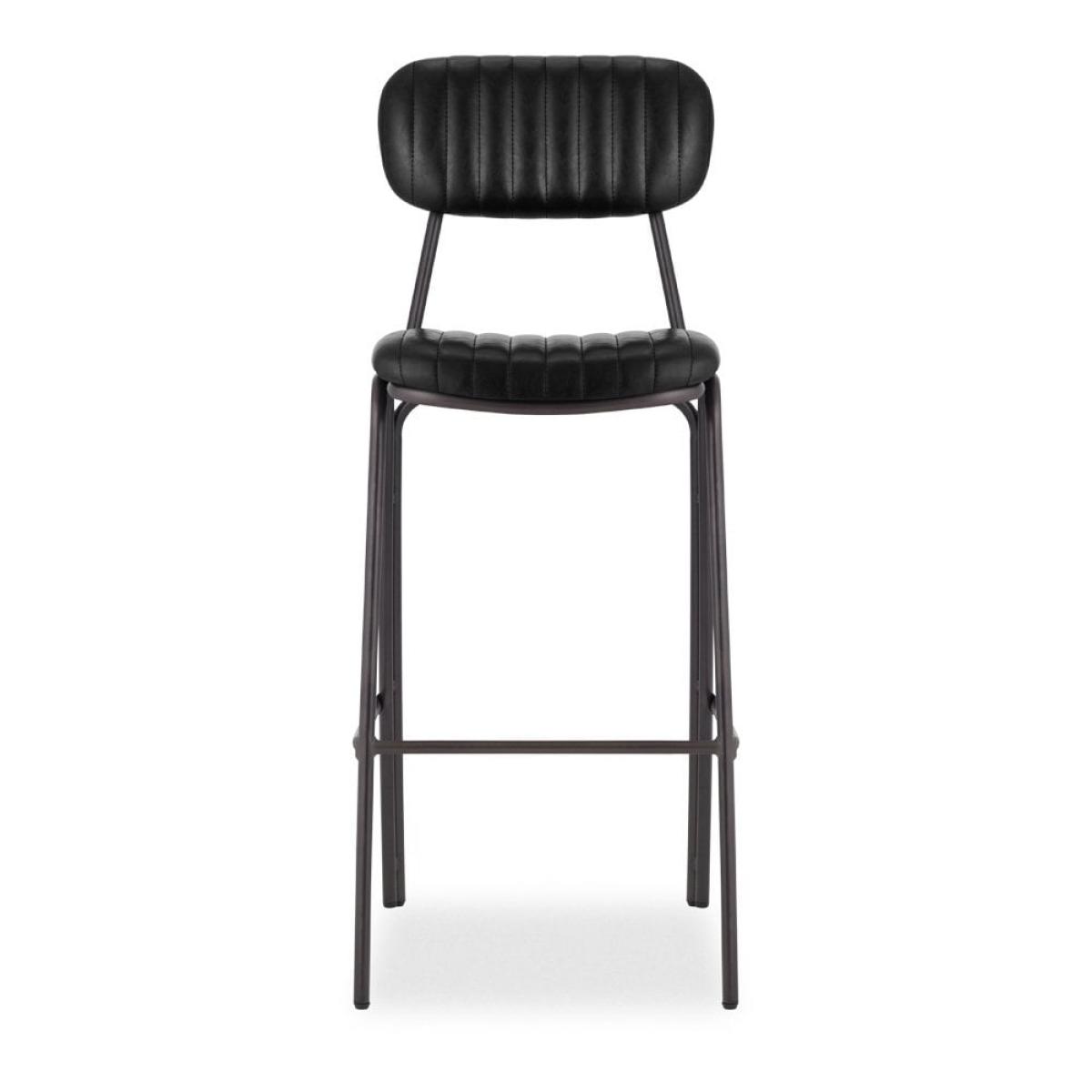 Introducing the Boston Bar Stool; a fresh take on a classic industrial design, this black faux leather upholstered bar stool features a padded seat with a backrest and a black metal frame with a built-in footrest. Upgrade your kitchen breakfast bar or counter area without compromising comfort.
