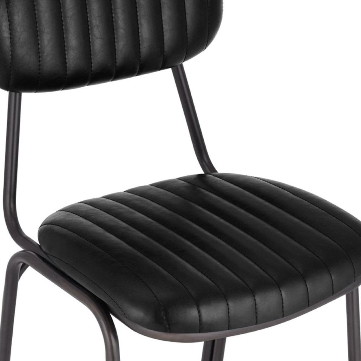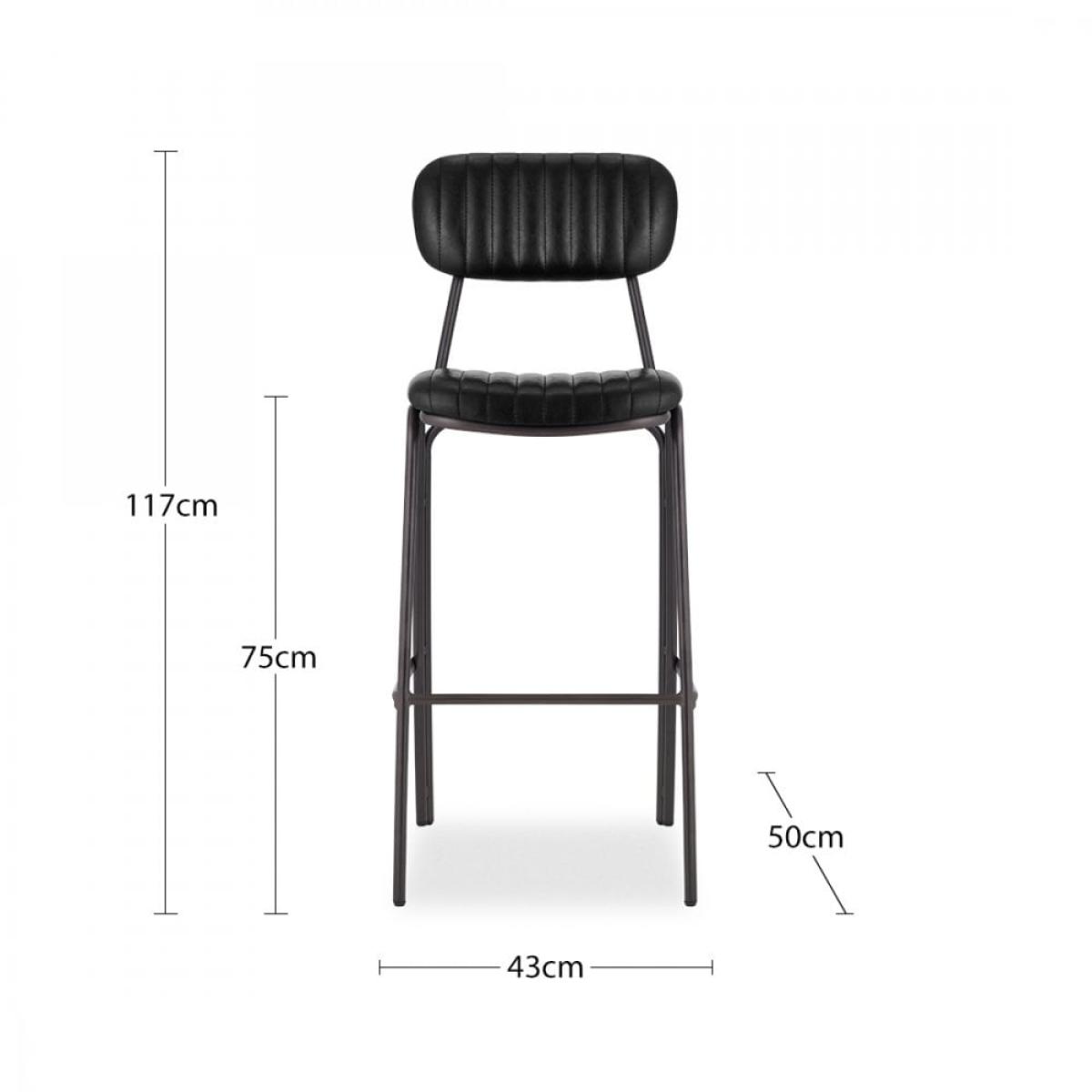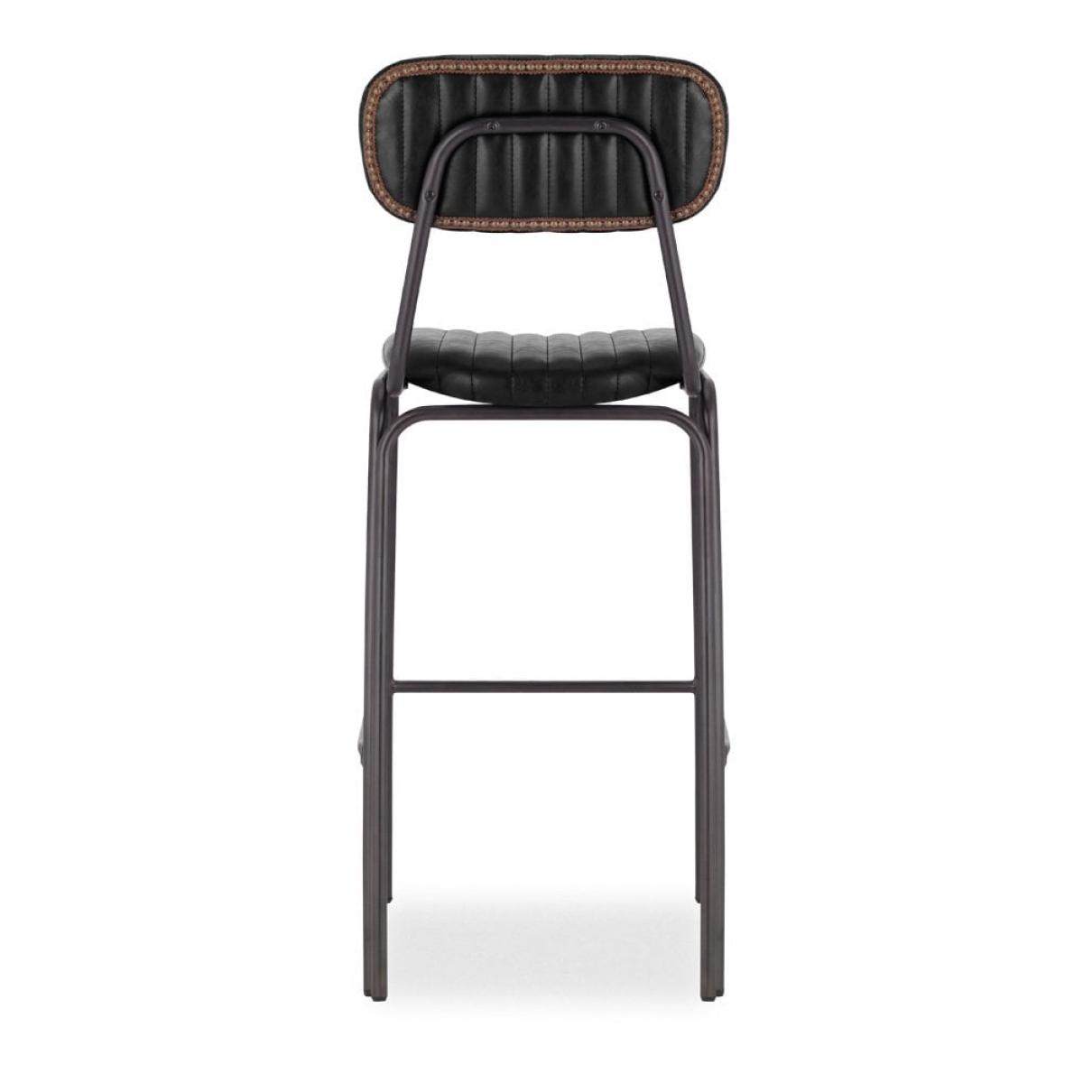 Introducing the Boston Bar Stool; a fresh take on a classic industrial design, this black faux leather upholstered bar stool features a padded seat with a backrest and a black metal frame with a built-in footrest. Upgrade your kitchen breakfast bar or counter area without compromising comfort.
