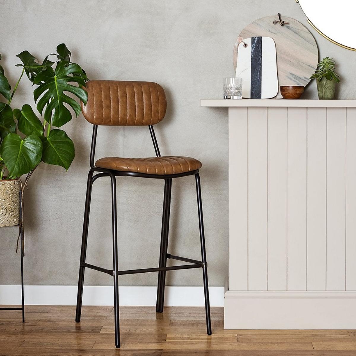 I’m a fan of this tan leather bar stool for its mix of warm upholstery and slim metal frame - it brings just the right amount of texture without feeling bulky. The stitched backrest adds subtle detail, while the tall footrail makes it genuinely comfortable for evening chats at the kitchen island. It works equally well in industrial-style lofts, Scandi-inspired kitchens or modern farmhouse schemes. To style, tuck in a slim wooden or marble counter, add a pendant light with a brass or black finish above, and layer in textiles such as a soft rug beneath. For extra comfort, a small sheepskin drape over the seat lifts the look and softens the metal lines.