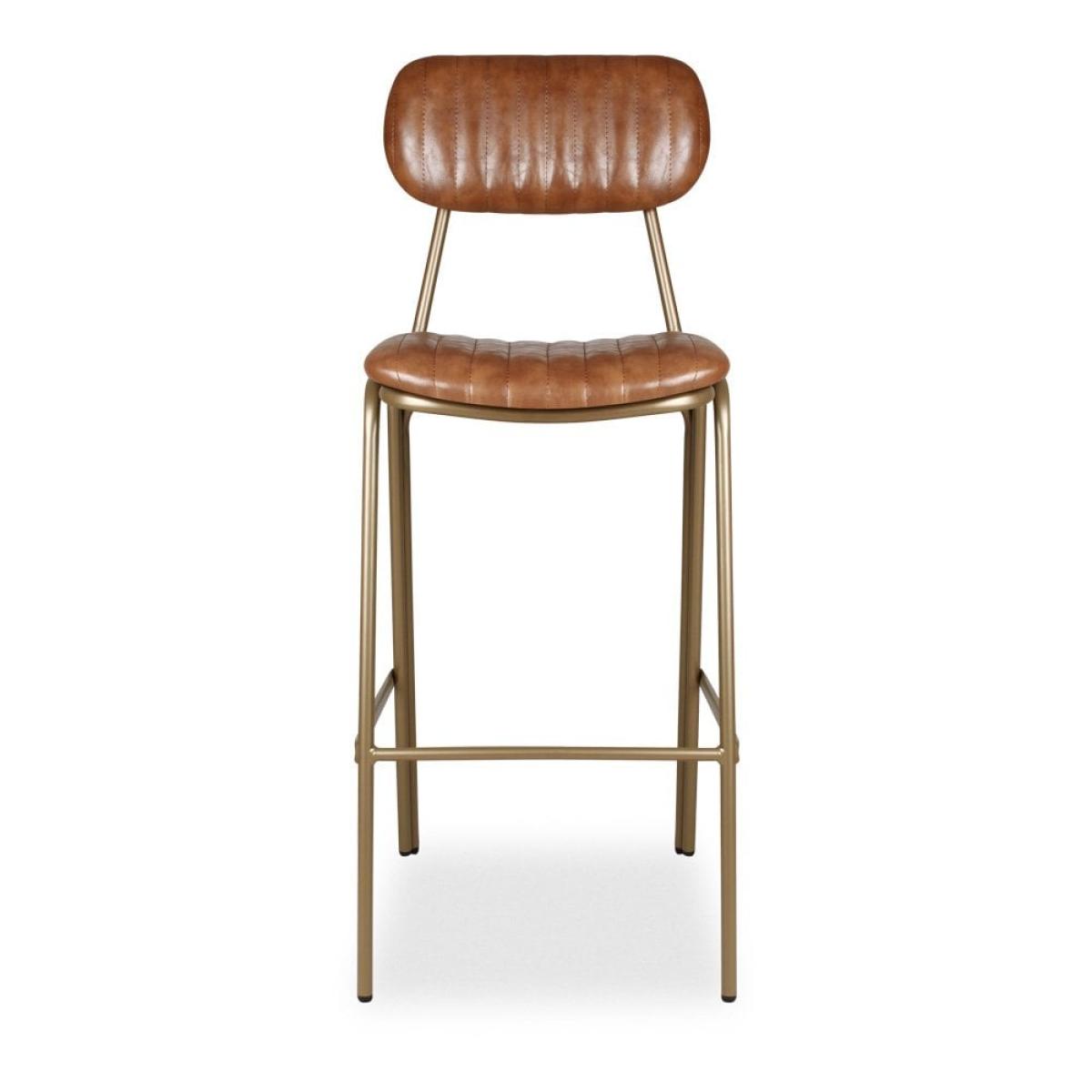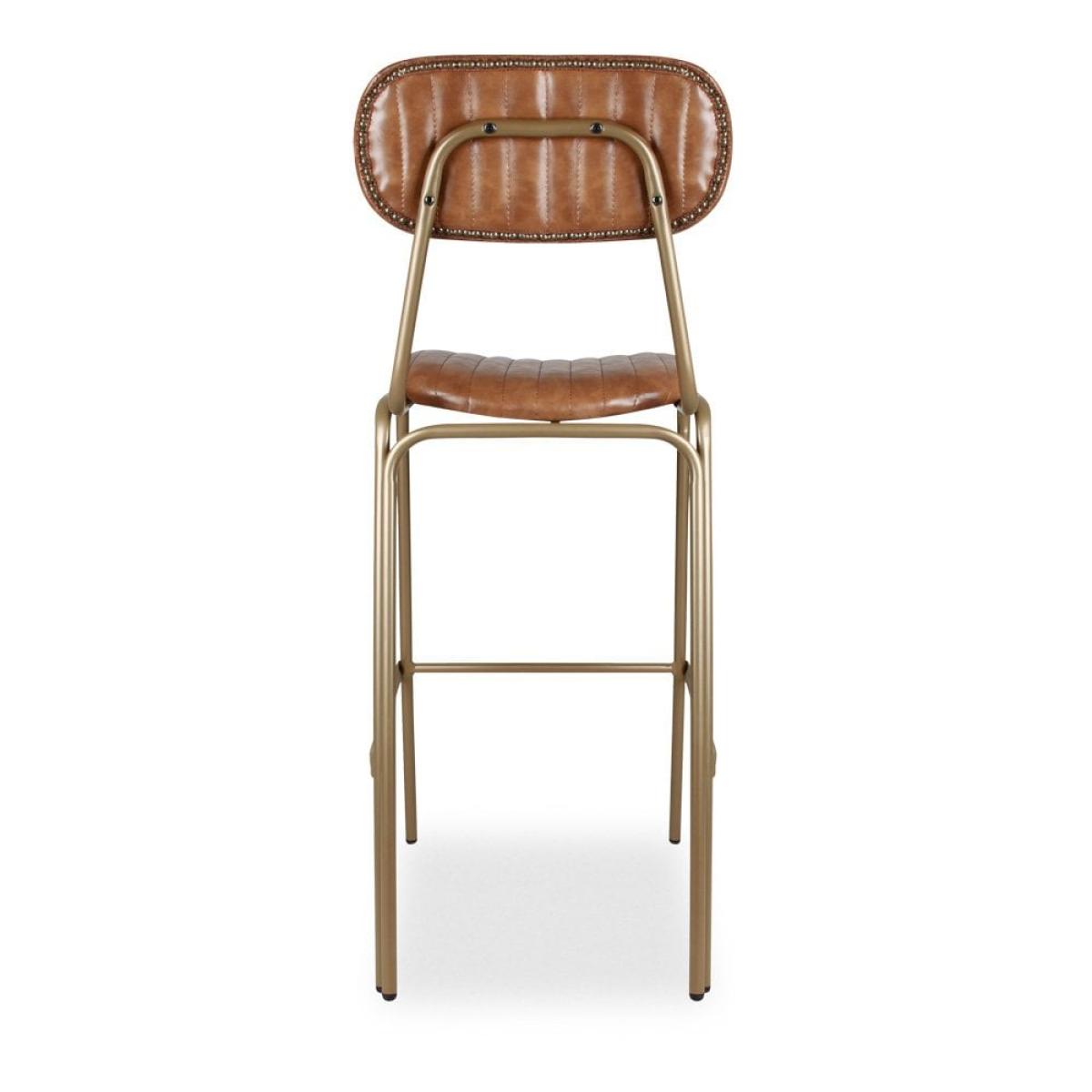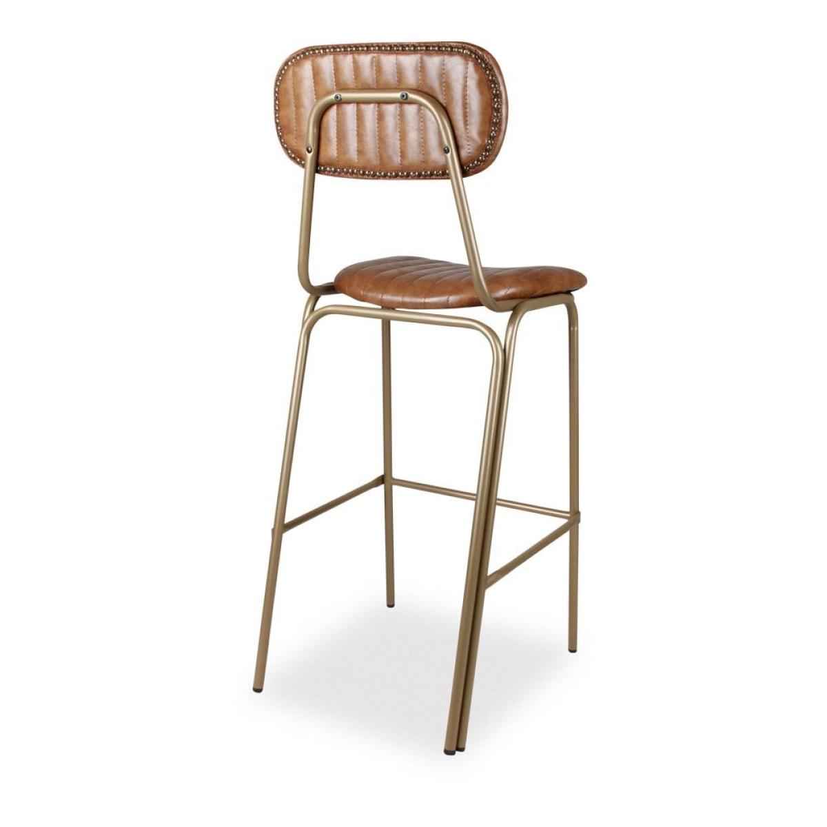 Introducing the Boston Bar Stool; a fresh take on a classic industrial design, this vintage tan faux leather upholstered bar stool features a padded seat with a backrest and a black metal frame with a built-in footrest. Upgrade your kitchen breakfast bar or counter area without compromising comfort.