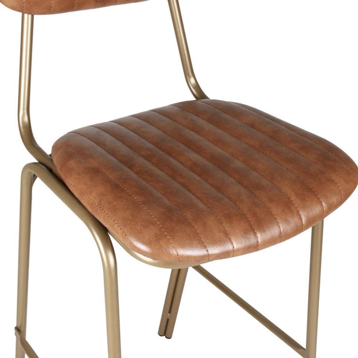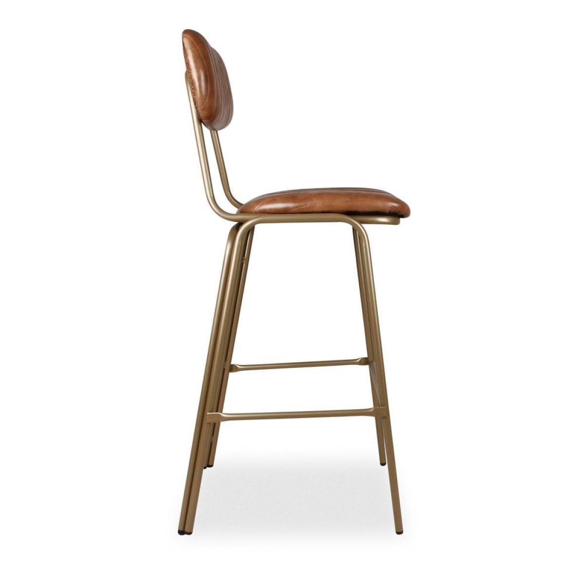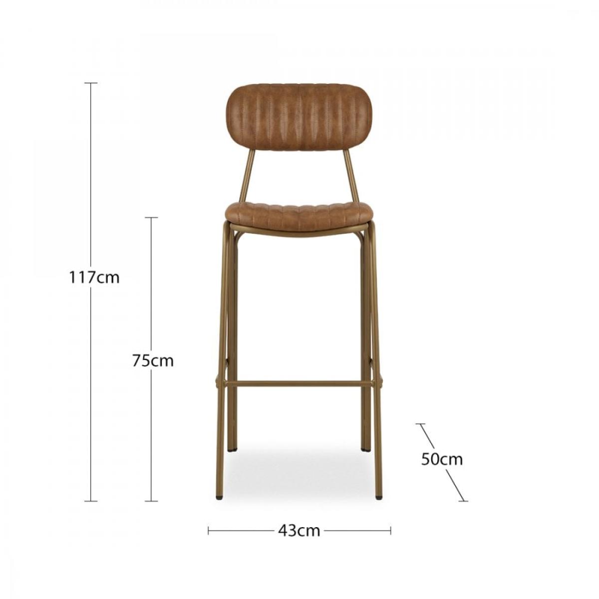 Introducing the Boston Bar Stool; a fresh take on a classic industrial design, this vintage tan faux leather upholstered bar stool features a padded seat with a backrest and a black metal frame with a built-in footrest. Upgrade your kitchen breakfast bar or counter area without compromising comfort.