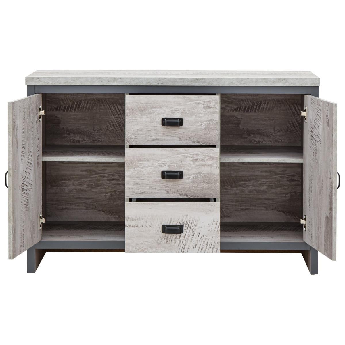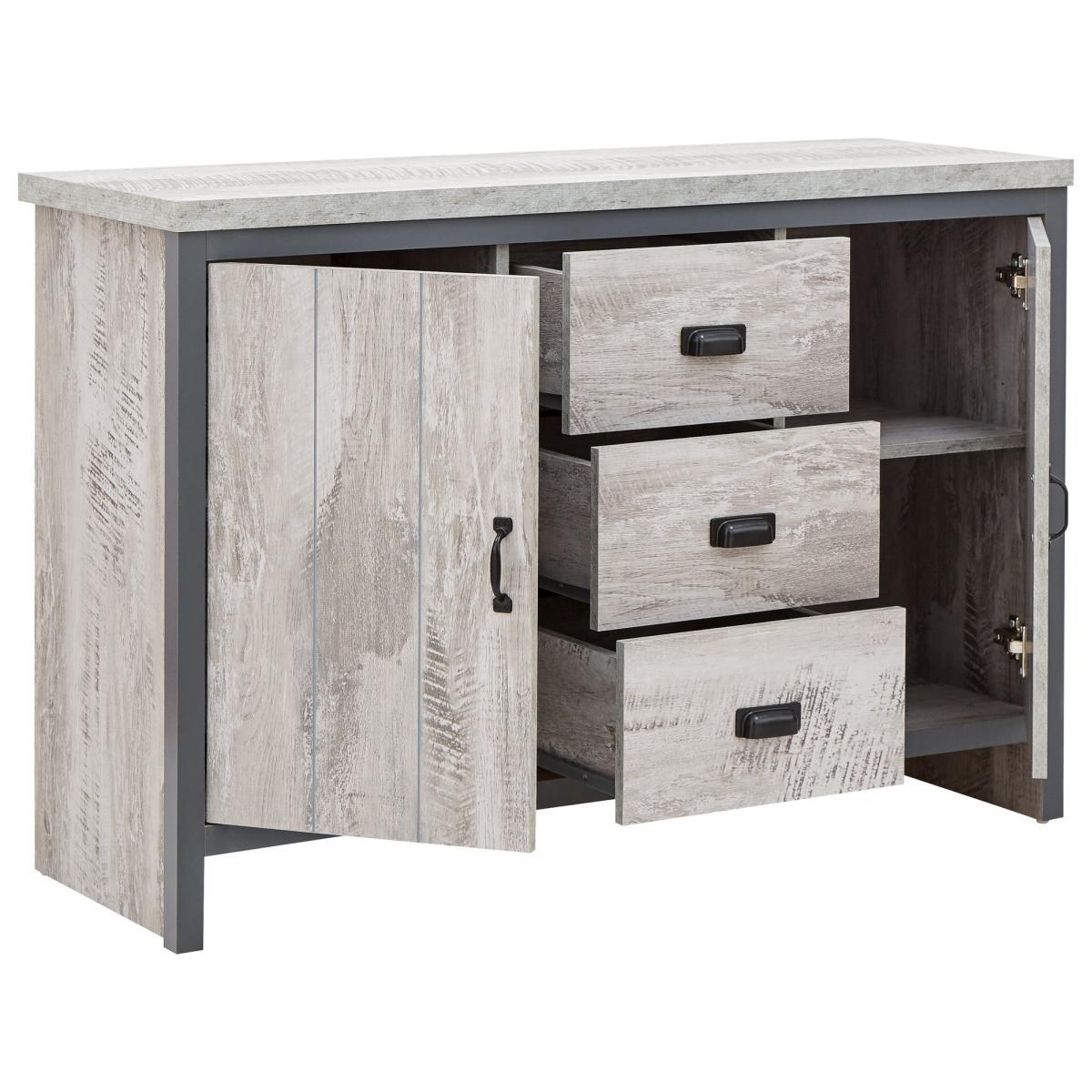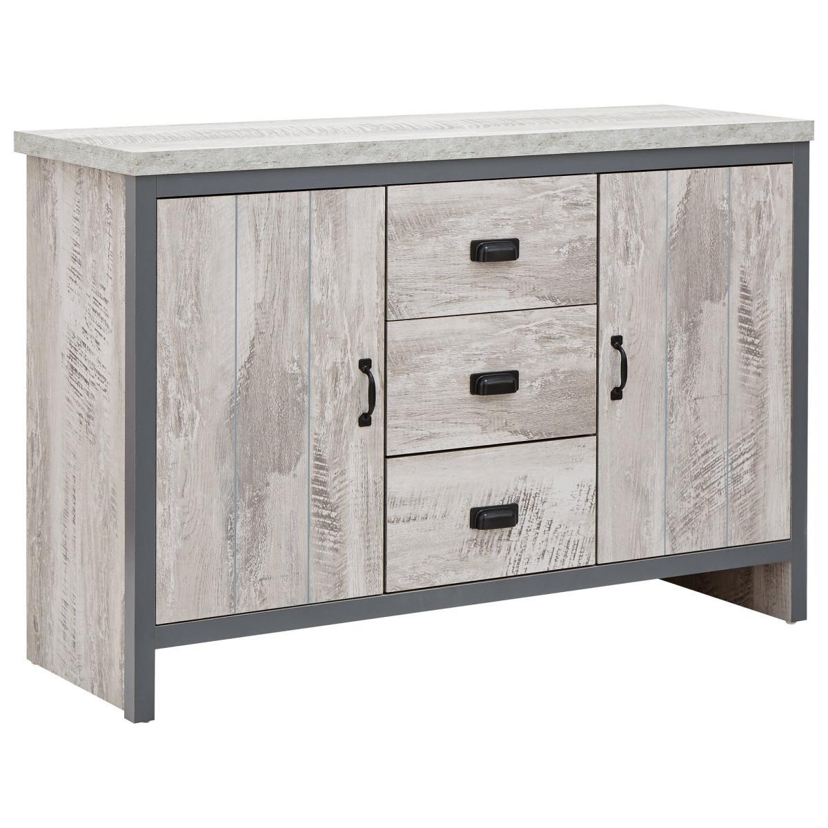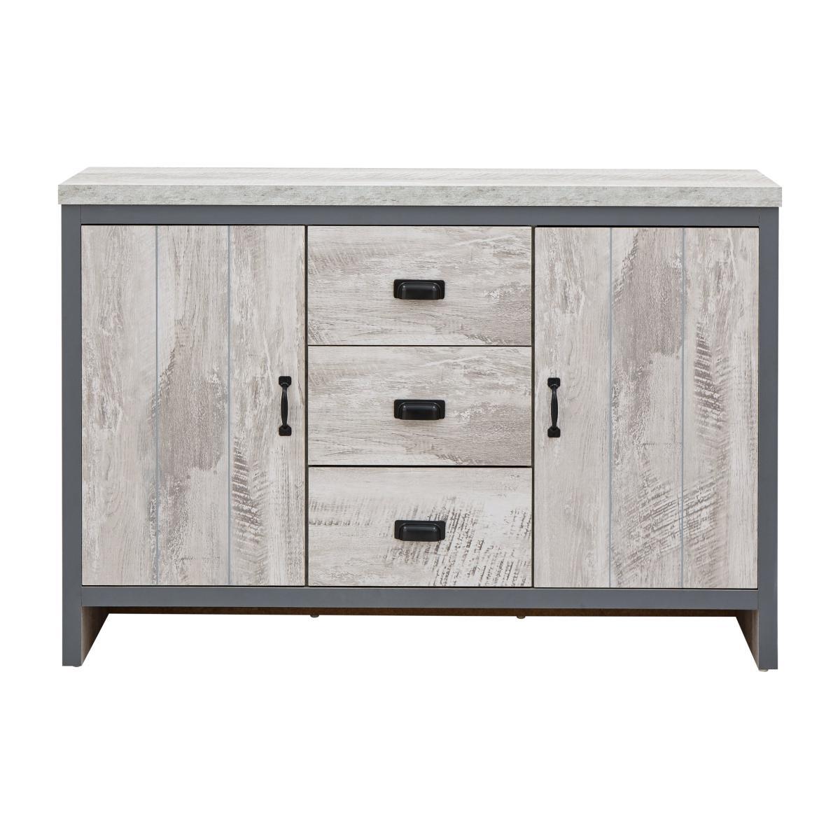 Boasting a bold industrial-chic design, the Boston sideboard is perfect for brining a contemporary design statement to your living space. This modern sideboard boasts a chunky construction and features adjusatable shelves so you can make the most of the storage space. The symmetrical form incorporates a central column of drawers, flanked by a pair of cupboard doors. The industrial look is accentuated by the distressed grey finish with contrasting black metal handles and dark grey wooden frame. Do not use solvent based cleaners or detergents as they can bleach or damage the product.