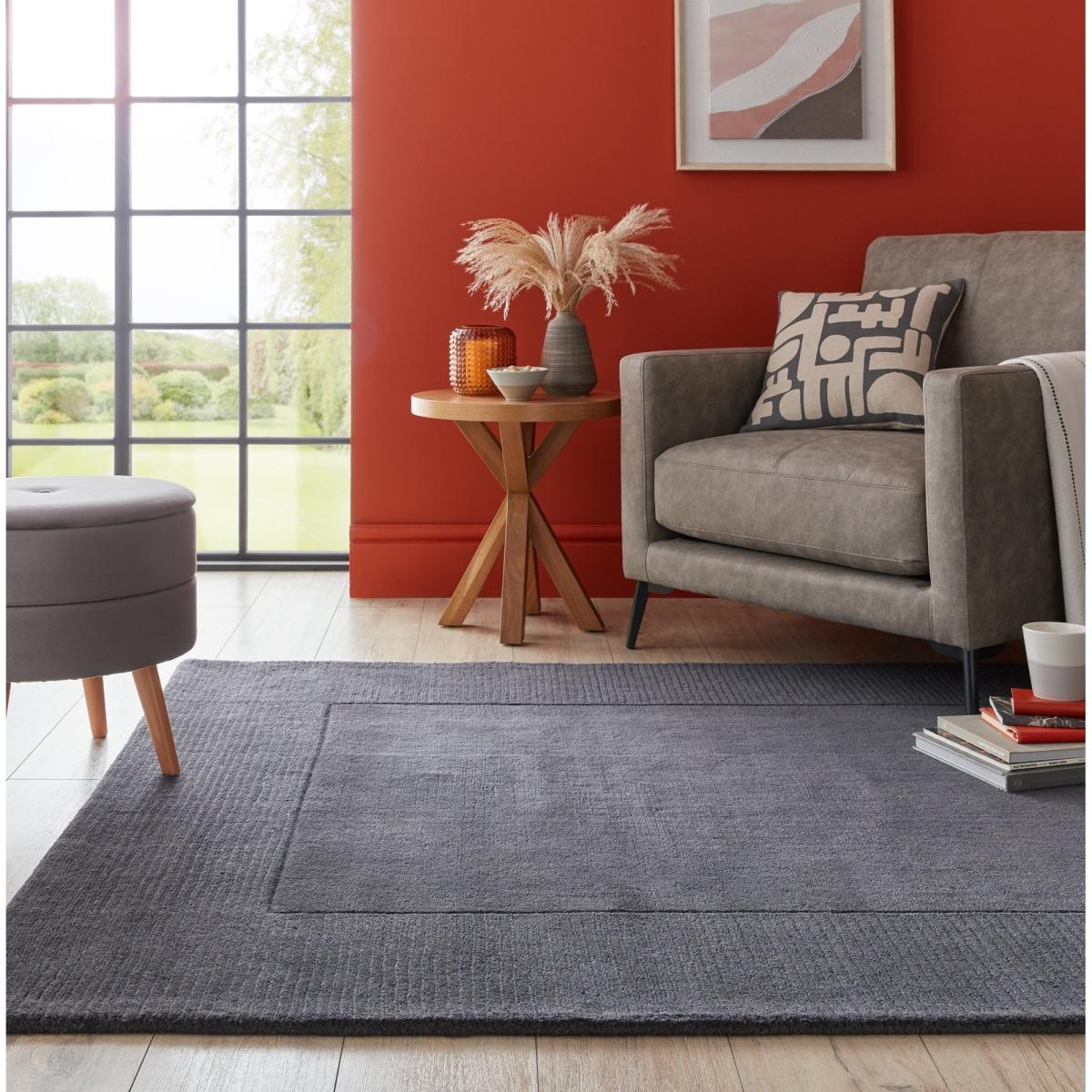 A perfect choice for a family home, the Boston Wool Border rug’s beautifully hand crafted design will draw attention to your stylish living space. Traditionally made in India, this rug is hand tufted in 100% wool that feels warm underfoot and can even improve sound insulation for a quieter and comfier room. As it is crafted from a natural fibre, some shedding is to be expected and is a sign that the rug is rich in natural wool. A bedding in time of a few months will allow the Boston rug to properly settle in and can be managed with a weekly vacuum, ideally with a suction type attachment, to remove any loose fibres. Don’t forget to buy our anti-slip mat. Here. , available in a choice of sizes. For regular cleaning, we recommend using a suction-type vacuum to ensure that rotating brushes won't damage the wool pile. In the case of an accidental spillage, blot with a clean and dry cloth. Due to the woollen composition of our Boston Wool Border rug a small amount of fibre loss is normal, but simply trim loose fibres with household scissors. To keep your rug looking fresh and even rotate regularly to balance out wear. When you receive your rug, we recommend re-rolling with the shaggy pile facing outwards for 24 hours in a warm room. This will help your rug settle flat with ease. Our Boston Wool Border rugs can also be used on heated floors to keep you extra toasty! To be safe, keep away from fires such as lit candles and don't leave children and babies unsupervised on this rug.