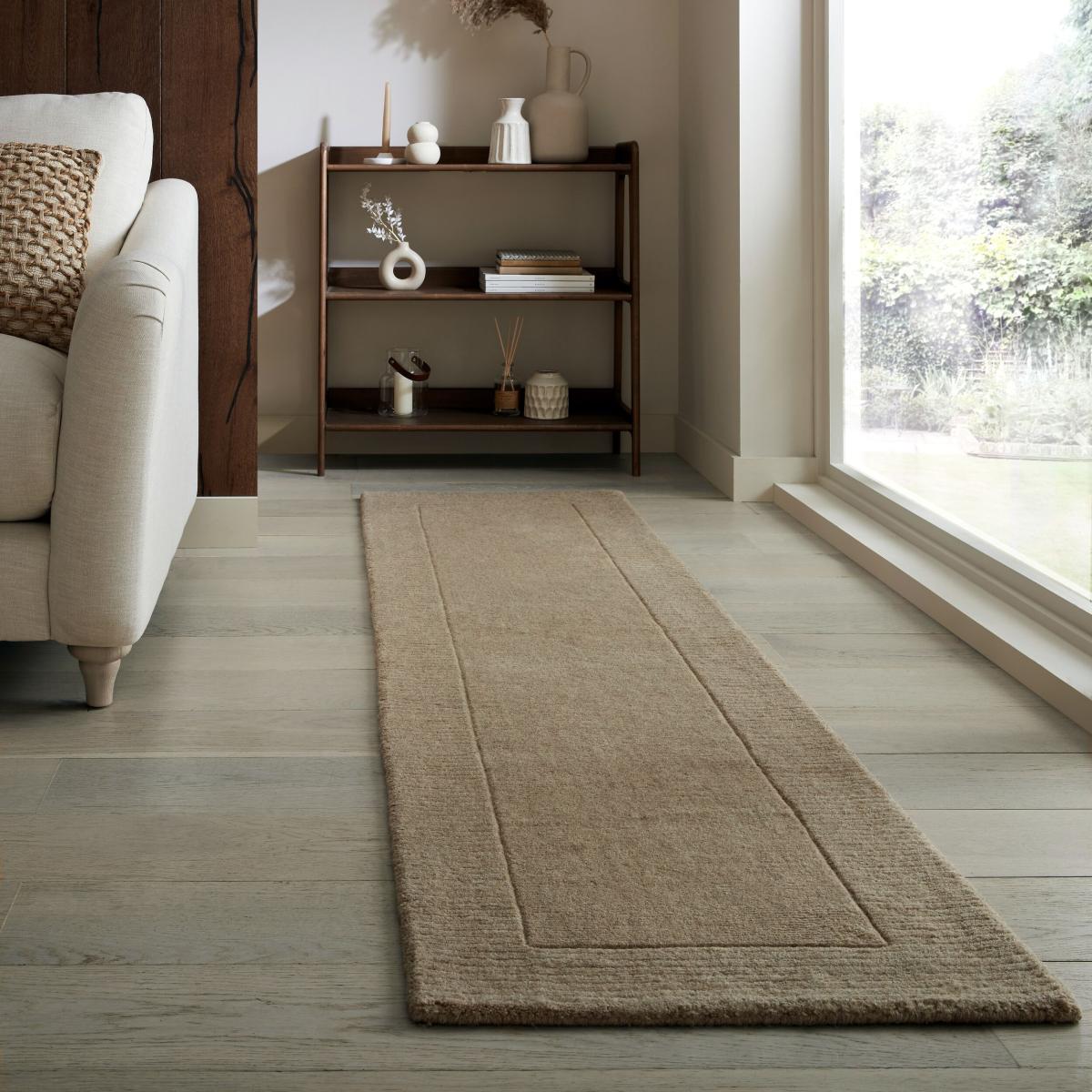 * Hand Crafted rug* Thick wool pile* Cut and loop pile* Available in a range of colours A perfect choice for a family home, the Boston Wool Border rug’s beautifully hand crafted design will draw attention to your stylish living space. Traditionally made in India, this rug is hand tufted in 100% wool that feels warm underfoot and can even improve sound insulation for a quieter and comfier room. As it is crafted from a natural fibre, some shedding is to be expected and is a sign that the rug is rich in natural wool.A bedding in time of a few months will allow the Boston rug to properly settle in and can be managed with a weekly vacuum, ideally with a suction type attachment, to remove any loose fibres. Don’t forget to buy our anti-slip mat[ here]( http://www. dunelm. Runner pictured is 60cm x 230cm. Wool is a natural fibre and shedding is normal. Unroll your rug and leave for 24 hours during first use. Maintain your Wool rug by vacuuming regularly with a nozzle attachment. This will reduce shedding over time. Cut any loose fibres with scissors, do not pull. For accidental spills blot immediately and spot clean with a damp white cloth, do not rub or over saturate the fibres to keep them soft and plush. Add an anti-slip underneath your rug to prevent slipping. Rotate every few months to prolong the life of your rug. Please do not leave infants unattended. Please note: This rug contains Latex. Young infants should not be left unsupervised on this rug. Keep away from fire.