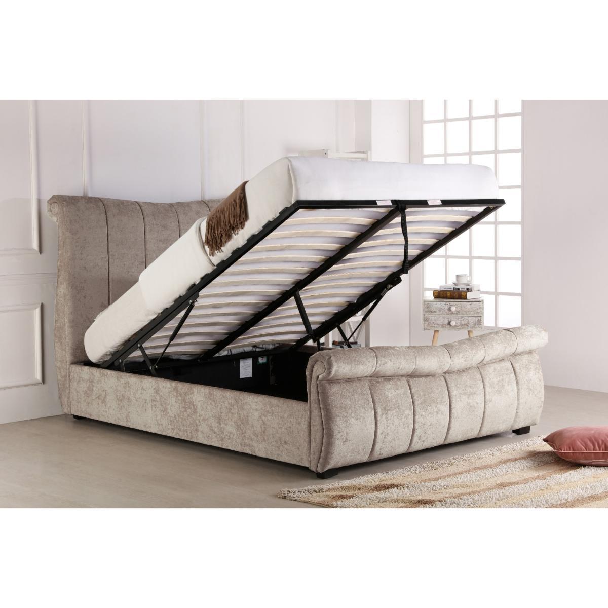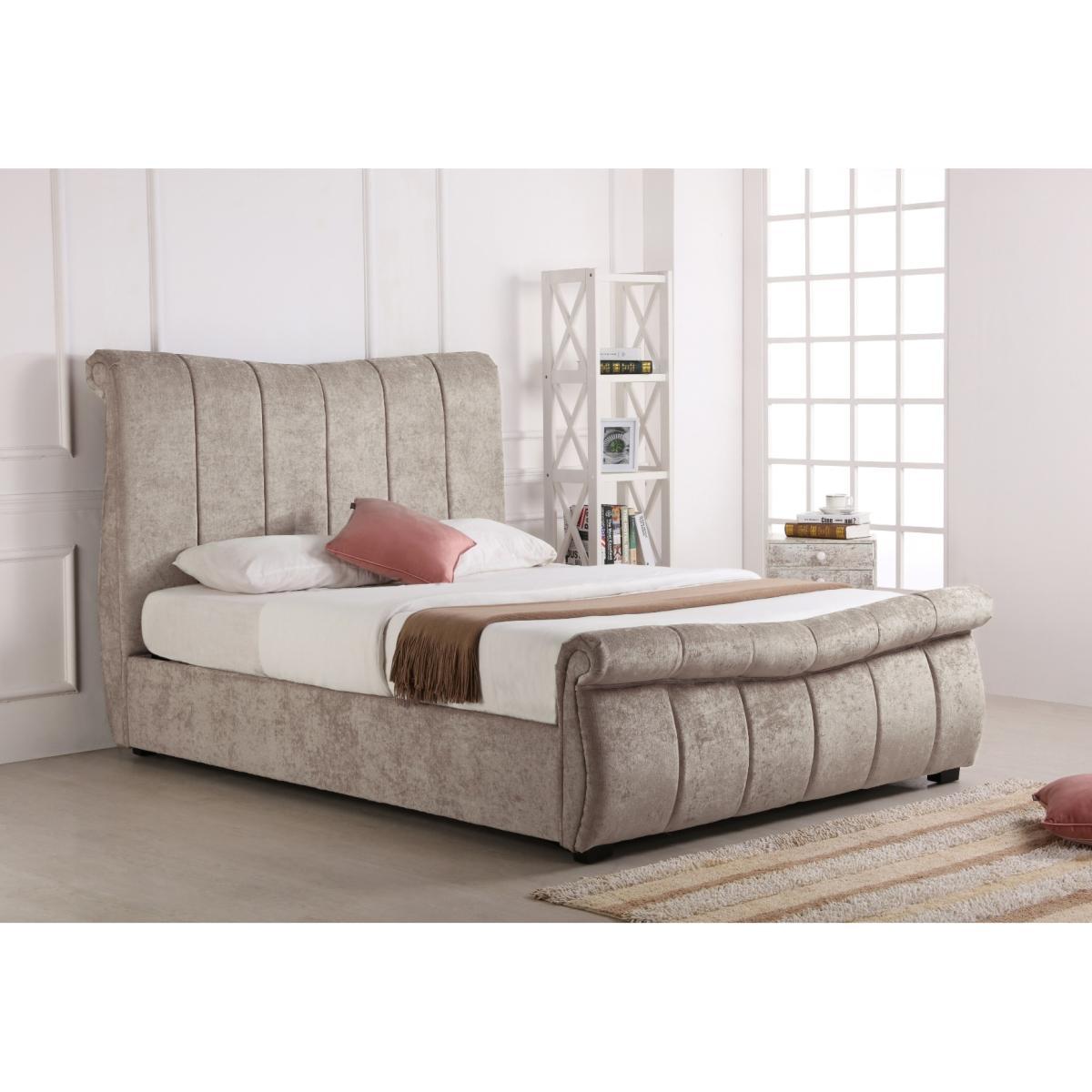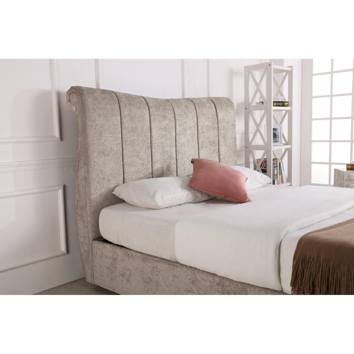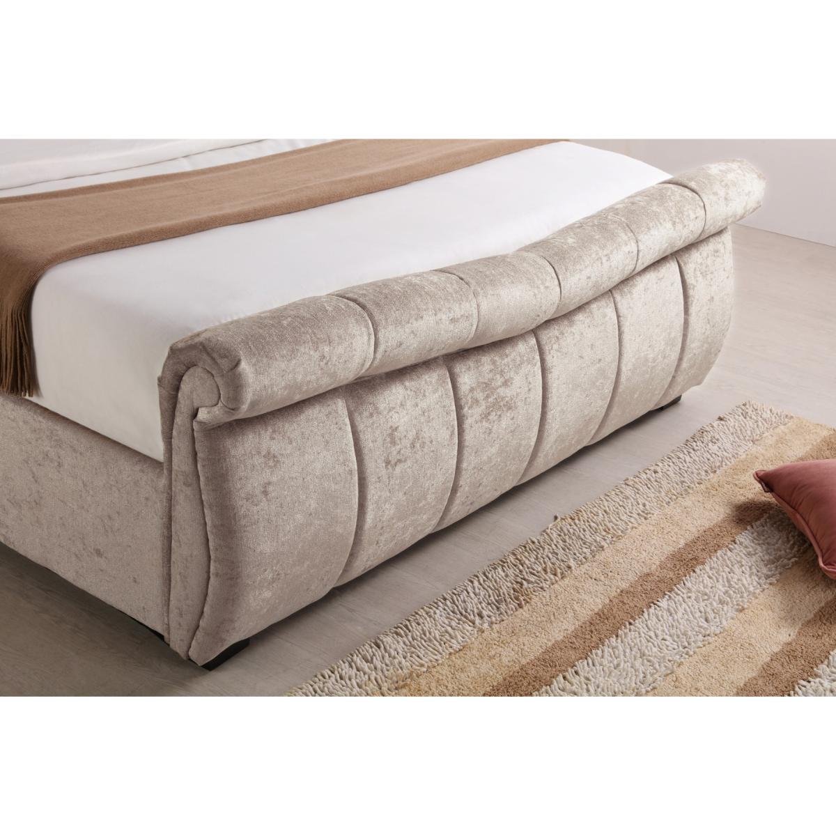 The Bosworth Stone Fabric Sleigh Ottoman Bed features a stunning design that makes a statement in any interior. A stylish addition to classic and contemporary bedroom settings, this luxury bed is upholstered in fabric in a neutral stone colour and features a stunning high headboard and curved footboard for an elegant look. The sleigh bed offers plenty of storage for your spare linens and pillows within its ottoman base which is simply accessed via convenient gas lift system. The Bosworth Fabric Sleigh Ottoman Bed is available in King Size and Super King Size; make your selection via the options. Please Note: Eligible for kerbside delivery only