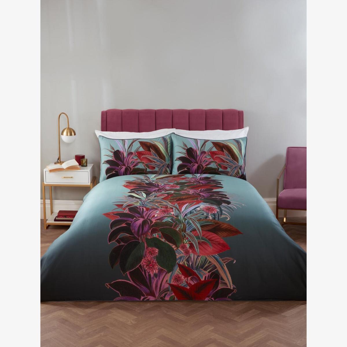 This duvet set is a great option for adding a pop of colour and vibrancy to a neutral or minimalist space. The teal base combined with the bold botanical print makes it a versatile piece that works well in modern, boho, or eclectic interiors. I love styling it with crisp white or soft grey linens to let the pattern stand out, and pairing it with textured throw pillows or blankets to add depth. For a cohesive look, consider complementing it with accessories in muted shades of pink or green, which will enhance the tropical feel without overwhelming the space. It's practical too-bright colours and vivid prints like this can hide minor stains, making it a smart choice for busy households.