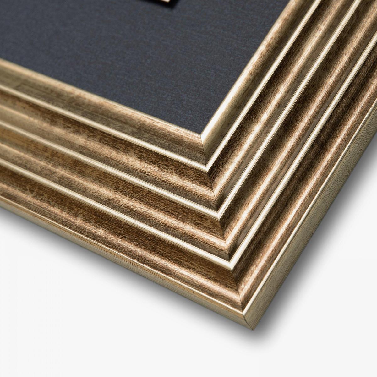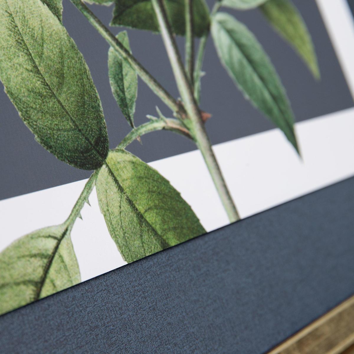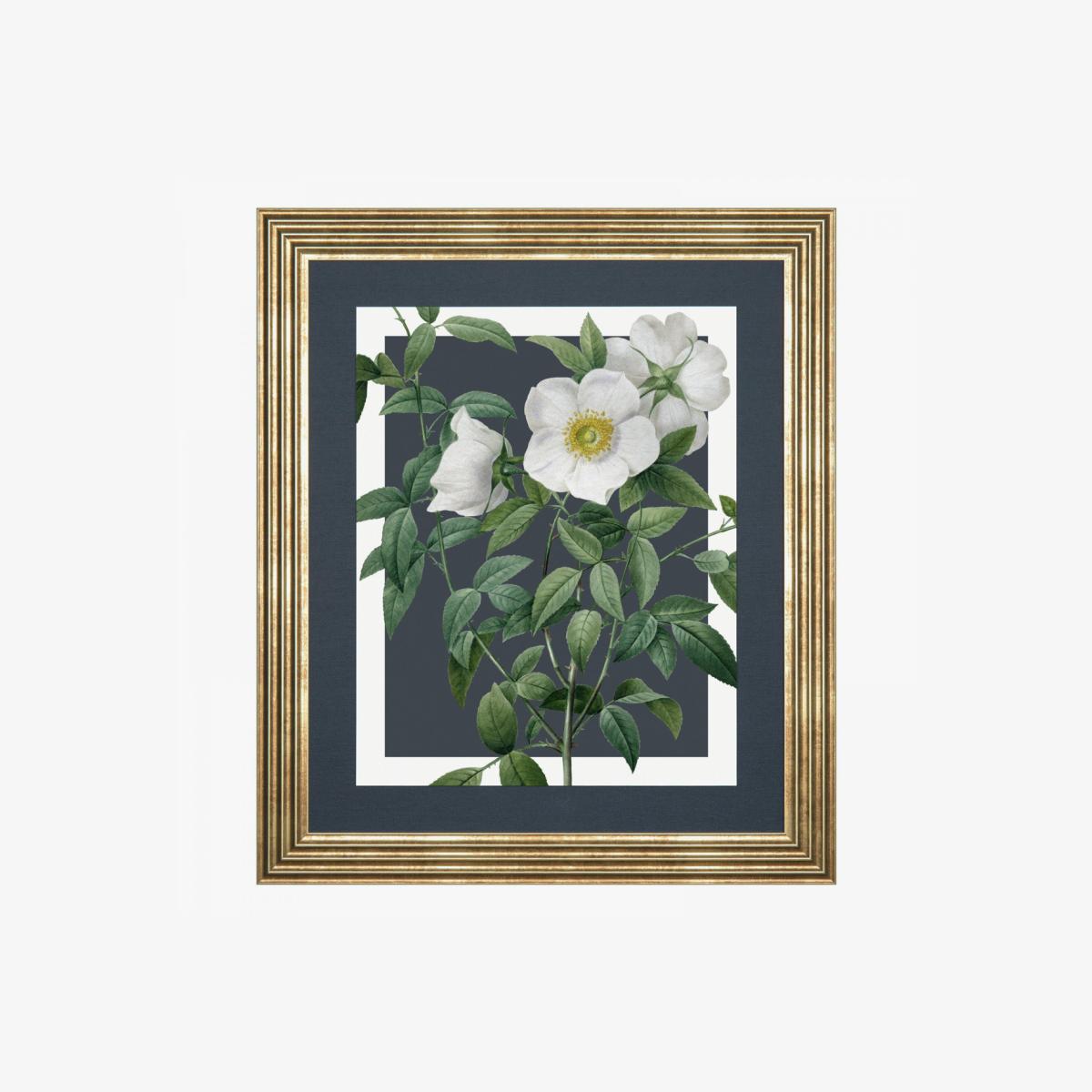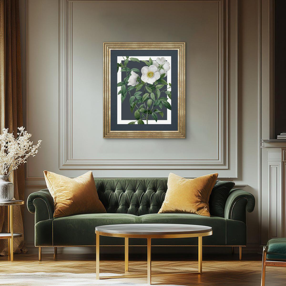 This exquisite wall art features a detailed Nivea rose stem by Pierre-Joseph Redout, captured in delicate lines and intricate detail. Set against a rich dark blue textured mount encased in a gold frame that contrasts the soft tones of the flower to create a striking focal point.