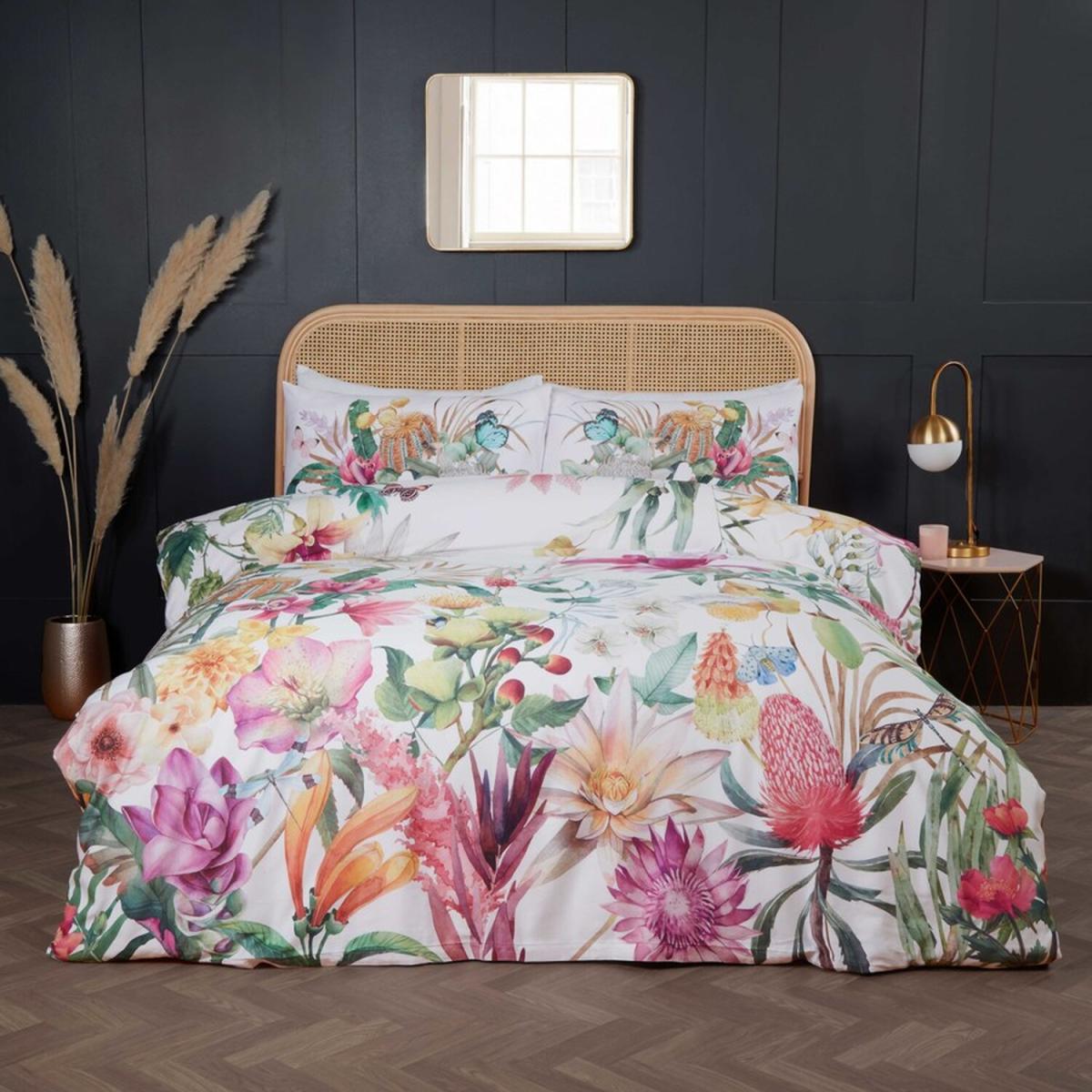 I love this bedding set because of its vibrant, multicoloured botanical print that instantly lifts the mood of any bedroom. It works particularly well in eclectic or modern interiors where a splash of colour can serve as a focal point, but it also pairs nicely with neutral tones if you prefer a more understated look. To style it effectively, consider keeping the bedding the star by pairing it with simple, solid-coloured cushions and throws in complementary shades. Incorporating natural materials and textures, like wicker or cane furniture, can also enhance the garden-inspired vibe. This duvet set is a smart choice for anyone wanting to bring a lively, nature-inspired element into their space without overwhelming the room’s overall colour scheme.