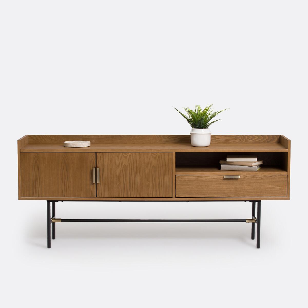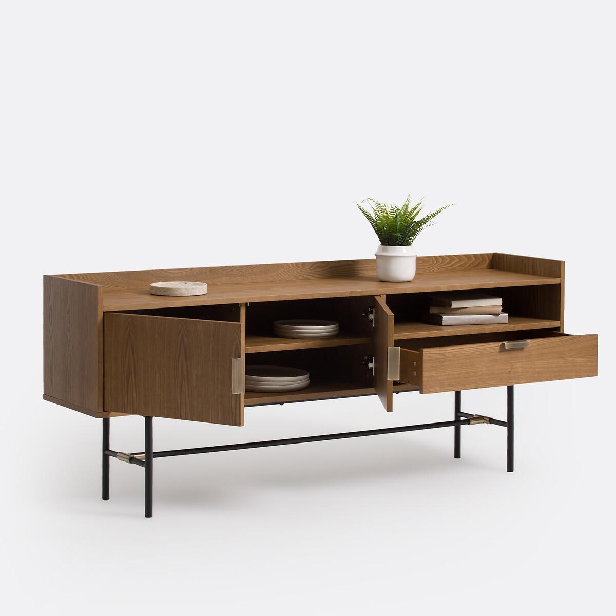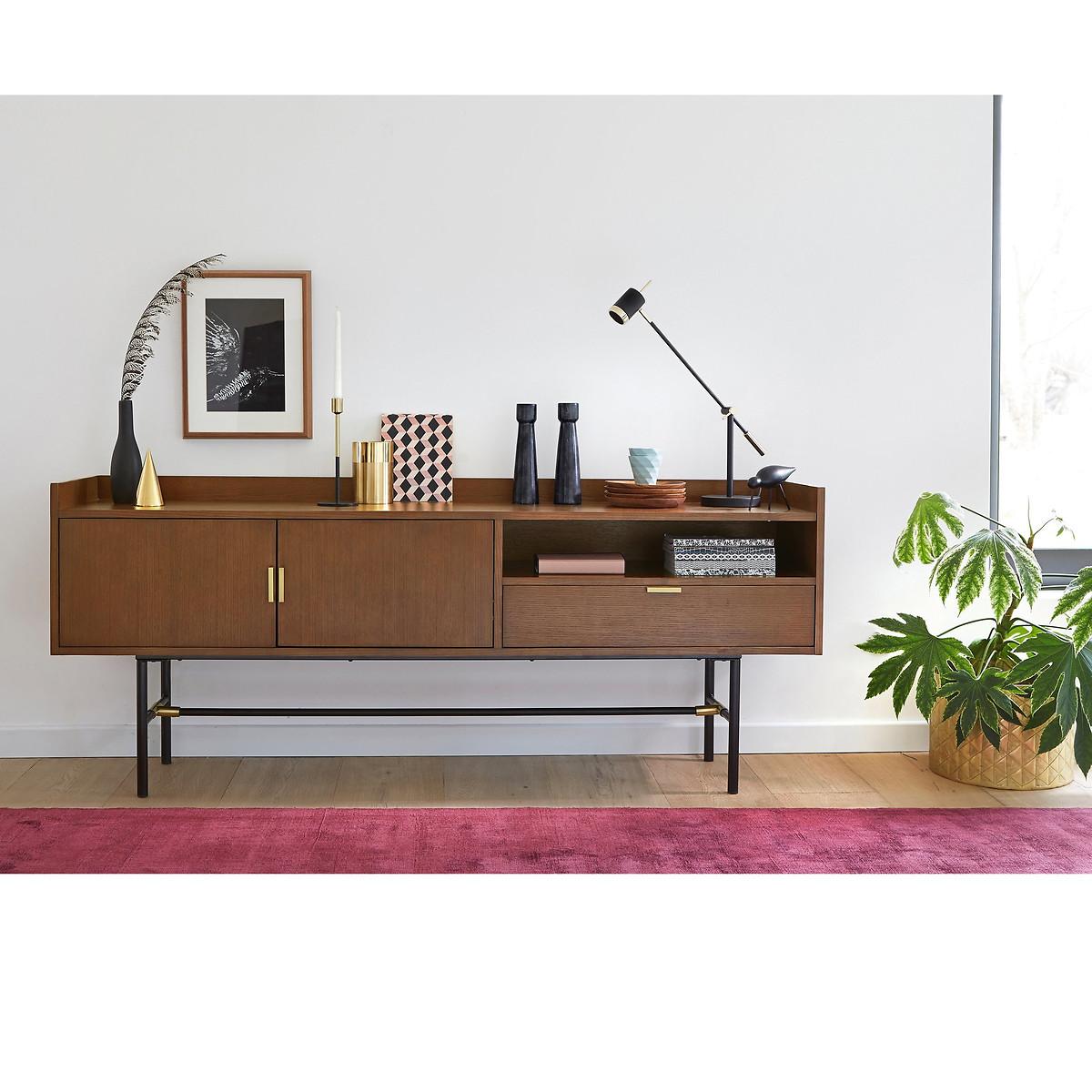Botello vintage sideboard. The vintage look is back with plenty of elegance on this beautifully designed sideboard. Product Details • MDF structure veneered in walnut-stained ash with acrylic varnish • Tubular steel legs lacquered black with epoxy finish • Steel handles and joint detail with a brass finish • 2 doors • 1 compartment • 1 drawer. Find the entire Botello collection on laredoute. Dimensions Total • Length: 180cm • Height: 73cm • Depth: 40cm. Interior • Open compartment : L74 x H13 x D38.5cm • Compartment behind the doors : L48 x H30 x D35cm • Drawer: L73.5 x H14.5 x D38cm. Home Delivery. Sold for self-assembly. It will be delivered to your door!Note! Please check that access points (doorways, stairways, lifts) are wide enough to accommodate your delivery. • WOOD FROM SUSTAINABLY MANAGED FORESTS. FSC® certified wood comes from forests that are environmentally, socially and economically well managed. Dimensions and weight of parcel2 parcels • L188.5 x H12.5 x D46.5 cm - 39 kg • L89.5 x H13.5 x D46.5 cm - 20 kg